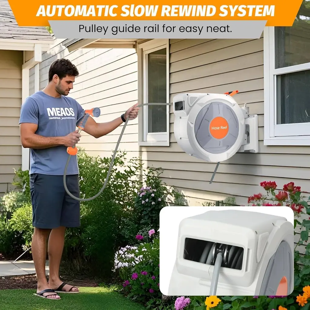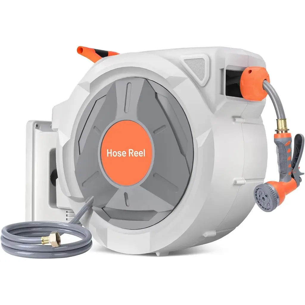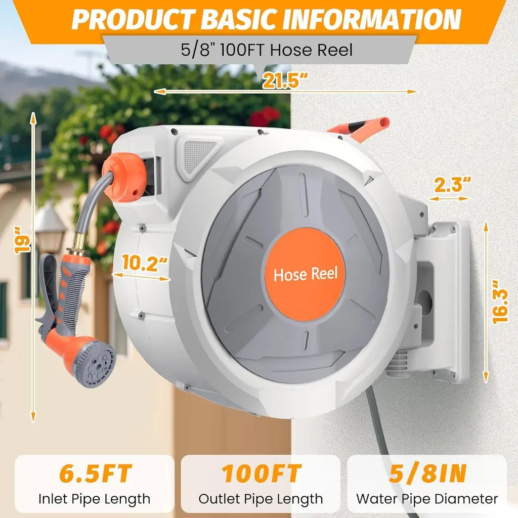 LOCKABLE AT ANY LENGTH: With free locking system, the retractable garden hose can be locked at any length to prevent retraction, ensuring easy coverage of every corner of the garden and more efficient watering.AUTOMATIC RETRACTION SYSTEM: With a gentle pull, the hose reel automatically retracts, and with the retracting and guiding system, the hose is neatly rolled up, say goodbye to tangles and kinks, and make it more convenient to use and store.MULTIFUNCTIONAL NOZZLES: Our retractable garden hose reel is equipped with 9 types of nozzles (jet, soak, angle, flat, cone, shower, center, rinse, spray) and universal nozzles, which meets the needs of watering garden, car washing, pet bathing, cleaning doors and windows and so on.EASY TO ASSEMBLY AND DISASSEMBLY: Comes with a swivel bracket for quick fixing on brick, concrete, wood or stone surfaces, supports 180 degree rotation for multi-directional watering to meet your individual needs.TRUSTED DURABILITY: Are you tired of hose reels snapping under pressure? Well, get ready for continued quality use for years to come. This hose reel features an all-weather housing, 3-ply PVC hose, and brass hose.The 5/8-inch x 100-foot retractable garden hose has been pressure tested to 200PSI and burst pressure tested to 600PSI to ensure the longevity of the hose.