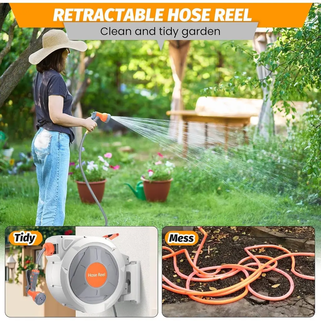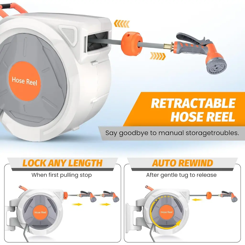 LOCKABLE AT ANY LENGTH: With free locking system, the retractable garden hose can be locked at any length to prevent retraction, ensuring easy coverage of every corner of the garden and more efficient watering.AUTOMATIC RETRACTION SYSTEM: With a gentle pull, the hose reel automatically retracts, and with the retracting and guiding system, the hose is neatly rolled up, say goodbye to tangles and kinks, and make it more convenient to use and store.MULTIFUNCTIONAL NOZZLES: Our retractable garden hose reel is equipped with 9 types of nozzles (jet, soak, angle, flat, cone, shower, center, rinse, spray) and universal nozzles, which meets the needs of watering garden, car washing, pet bathing, cleaning doors and windows and so on.EASY TO ASSEMBLY AND DISASSEMBLY: Comes with a swivel bracket for quick fixing on brick, concrete, wood or stone surfaces, supports 180 degree rotation for multi-directional watering to meet your individual needs.TRUSTED DURABILITY: Are you tired of hose reels snapping under pressure? Well, get ready for continued quality use for years to come. This hose reel features an all-weather housing, 3-ply PVC hose, and brass hose.The 5/8-inch x 100-foot retractable garden hose has been pressure tested to 200PSI and burst pressure tested to 600PSI to ensure the longevity of the hose.