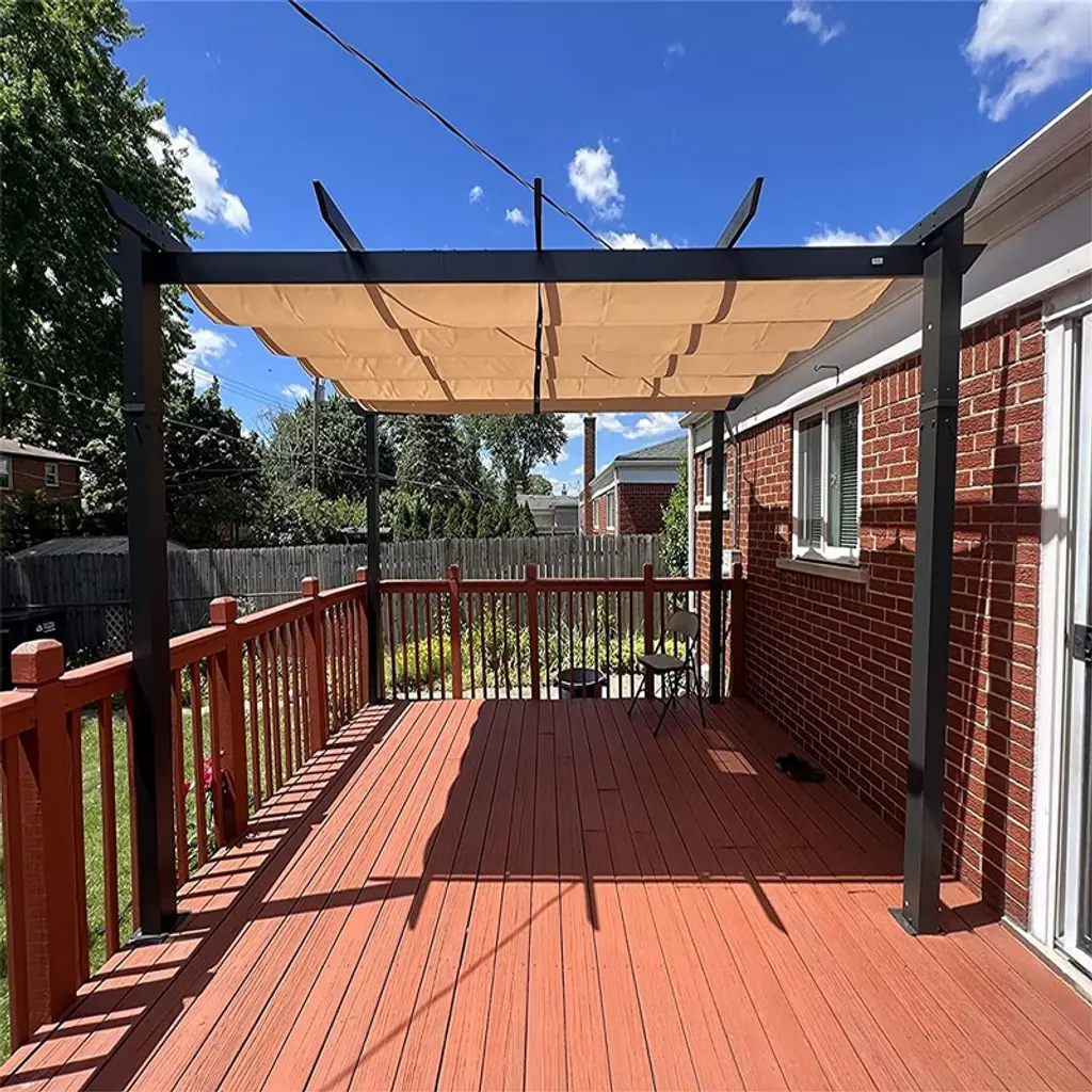Description: Product Name: Retractable Pergola With Sun Shade Canopy, Aluminum Frame Outdoor Patio Pavilion, Magnet System Mounting Grill Gazebo Color: Dark Gray Material: Aluminium Equipped with feet featuring holes and ground stakes for enhanced stability, this pergola frame offers superior durability and stability compared to standard pergola designs. Plant Climbing Frame Function: This metal frame grape pavilion is a good climbing frame, which can provide you with a good natural shade in summer. Packing list: Outdoor Retractable Pergola x 1 Accessory Bag x 1 Retractable Pergola With Sun Shade Canopy, Aluminum Frame Outdoor Patio Pavilion, Magnet System Mounting Grill Gazebo