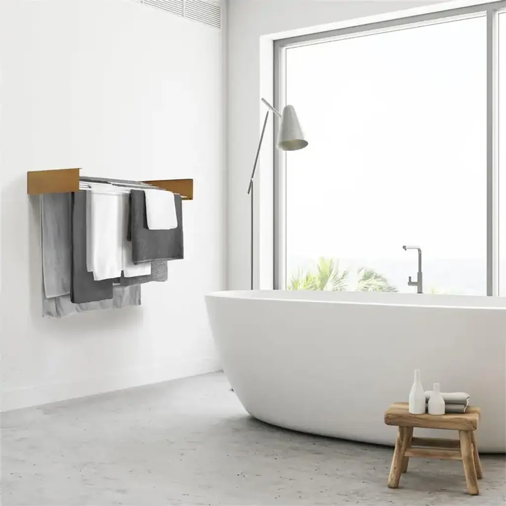 1. **Original Design with Quality Craftsmanship**: This wall-mounted drying rack features a smart locking system for easy installation and a robust design that supports heavy loads. 2. **Space-Saving Features**: Its sleek retractable design folds flat for compact storage, making it perfect for apartments and homes with limited space. 3. **Large Drying Capacity**: With 5 heavy-duty aluminum rods offering 11.6 feet of linear hanging line, it can hold up to 40 lbs of laundry. 4. **Indoor and Outdoor Versatility**: Stainless steel components make it suitable for various environments, from laundry rooms to patios, providing a reliable drying solution. 5. **Easy Installation**: Includes a wall template and necessary hardware for quick setup, ensuring a hassle-free experience for users.