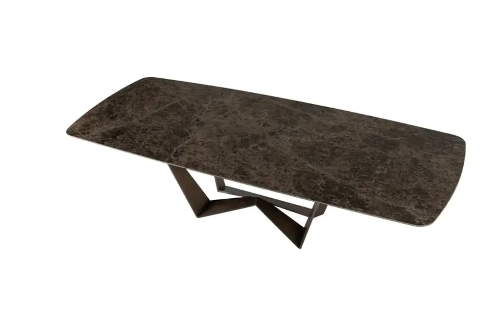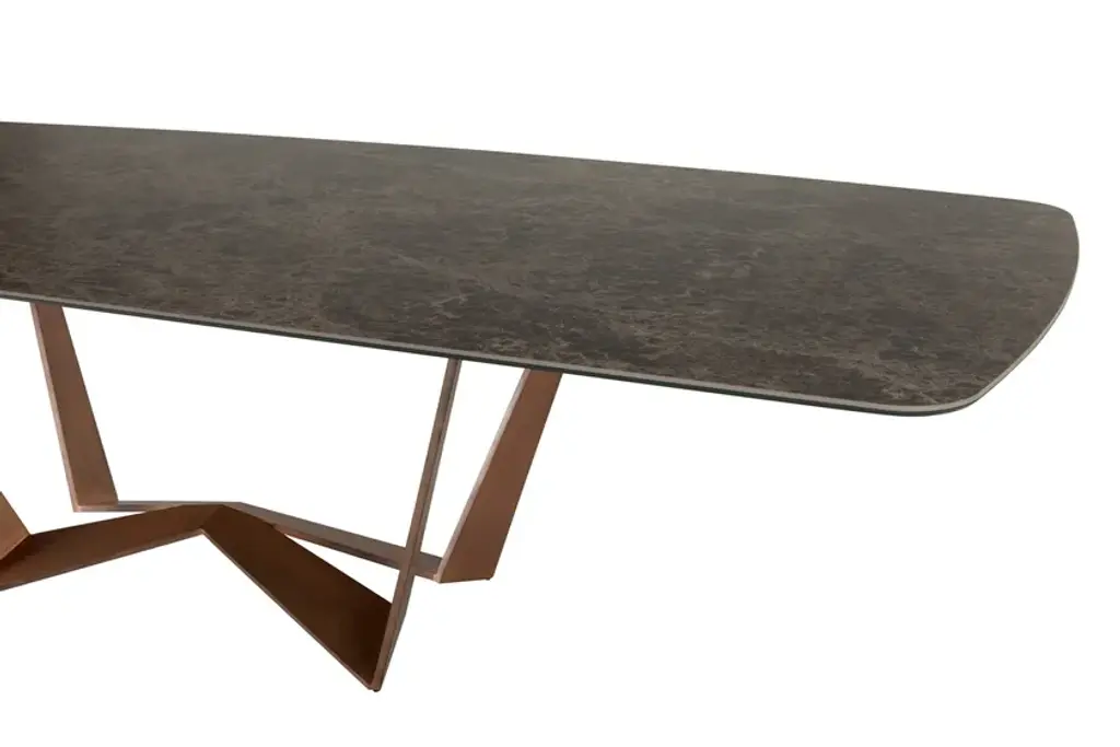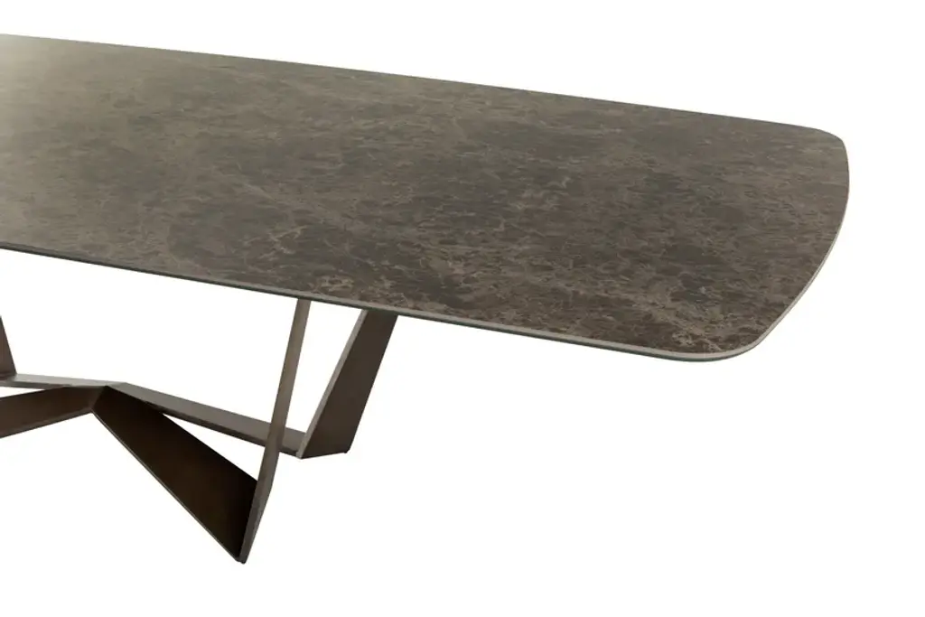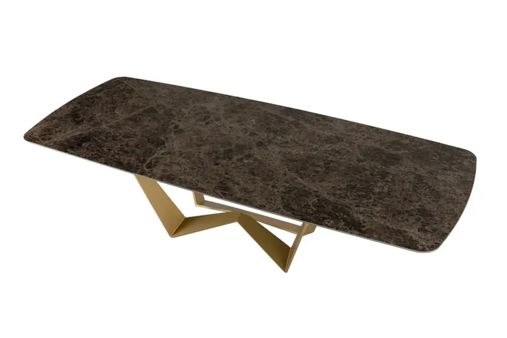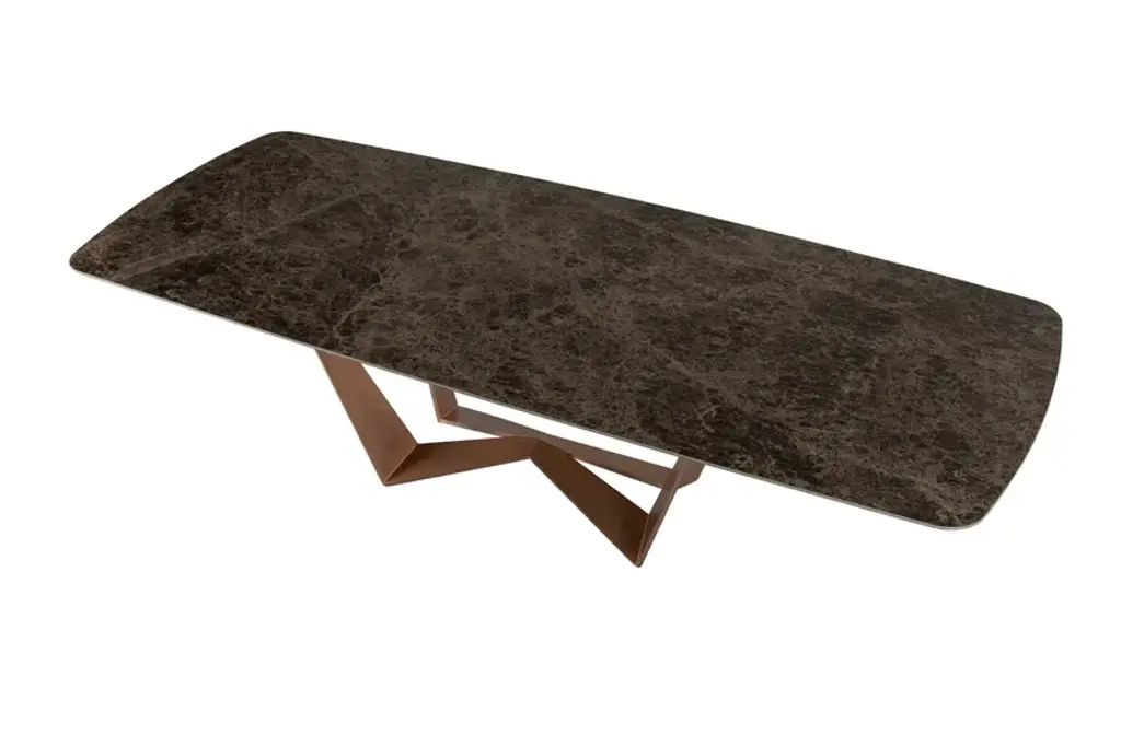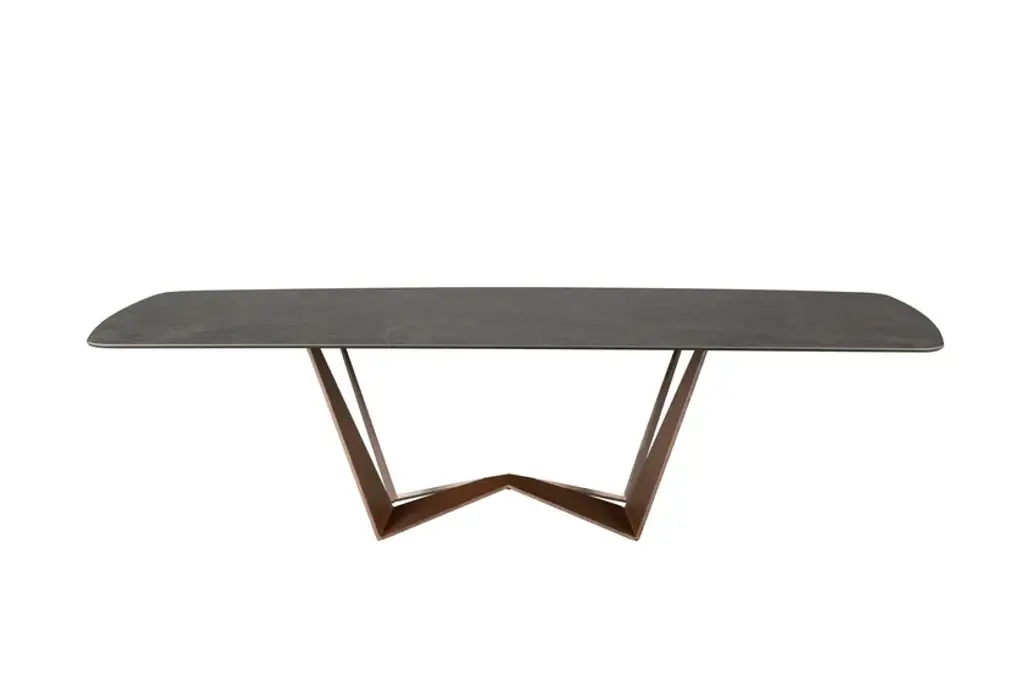 Reverse table is a perfect reversible table for any occasion. A base in painted steel with glass or porcelain stoneware tops available in different finishes. Choose the one that suits you best and create your own living room. This symbiosis creates a captivating given by the game of contrast between the geometric shape of the base and elegant softness of the new tops.Fixed table with painted steel structure and shaped tops in porcelain stoneware.Metal base: Gold, Copper, Brushed Copper, Bronze, TitaniumTop in porcelain stoneware: Emperador, Symphonie, Onice Ambra, Macchiavecchia glossy, Macchiavecchia matt.