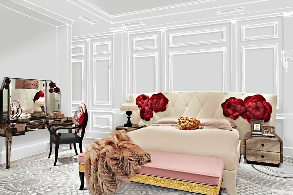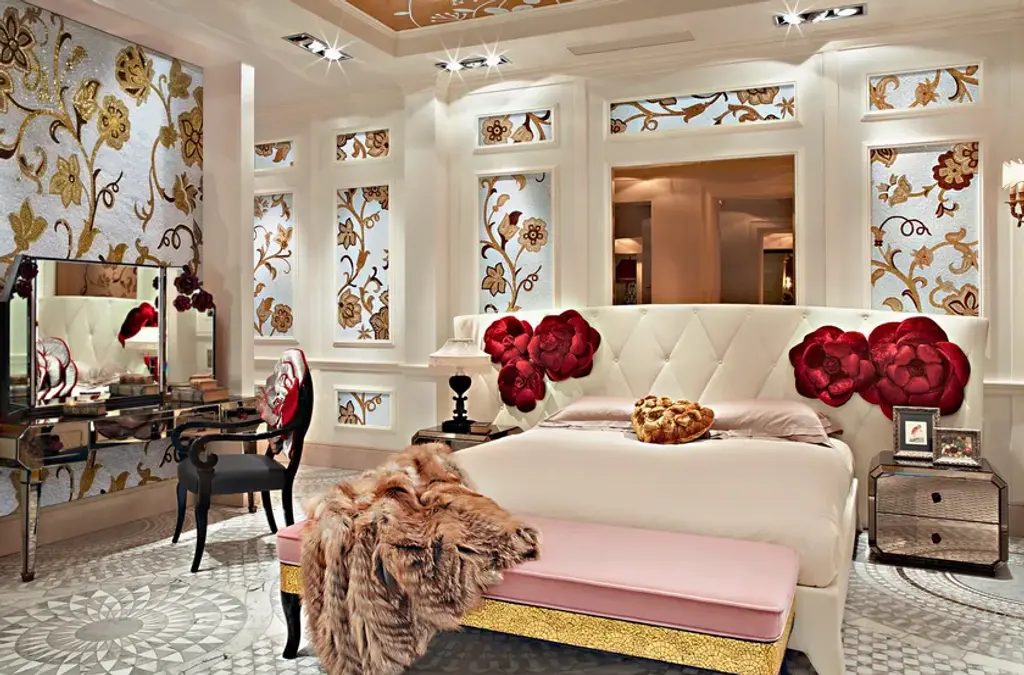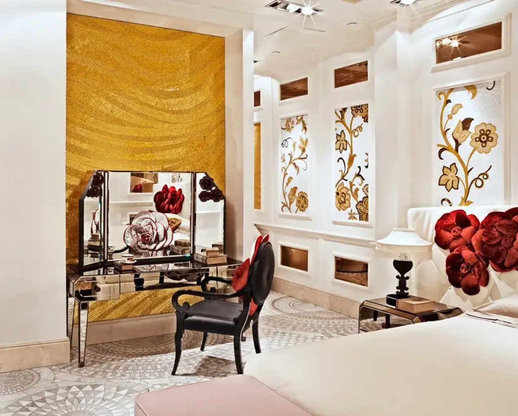 Rialto is a vanity with mirror cover. Lit mirror with burnished brass frame and clear beveled mirror with red glass roses applied on it. Rose-shaped glass knobs.