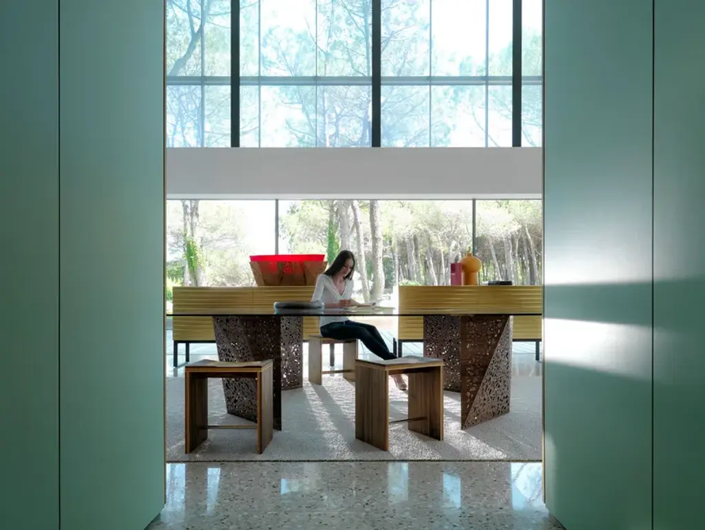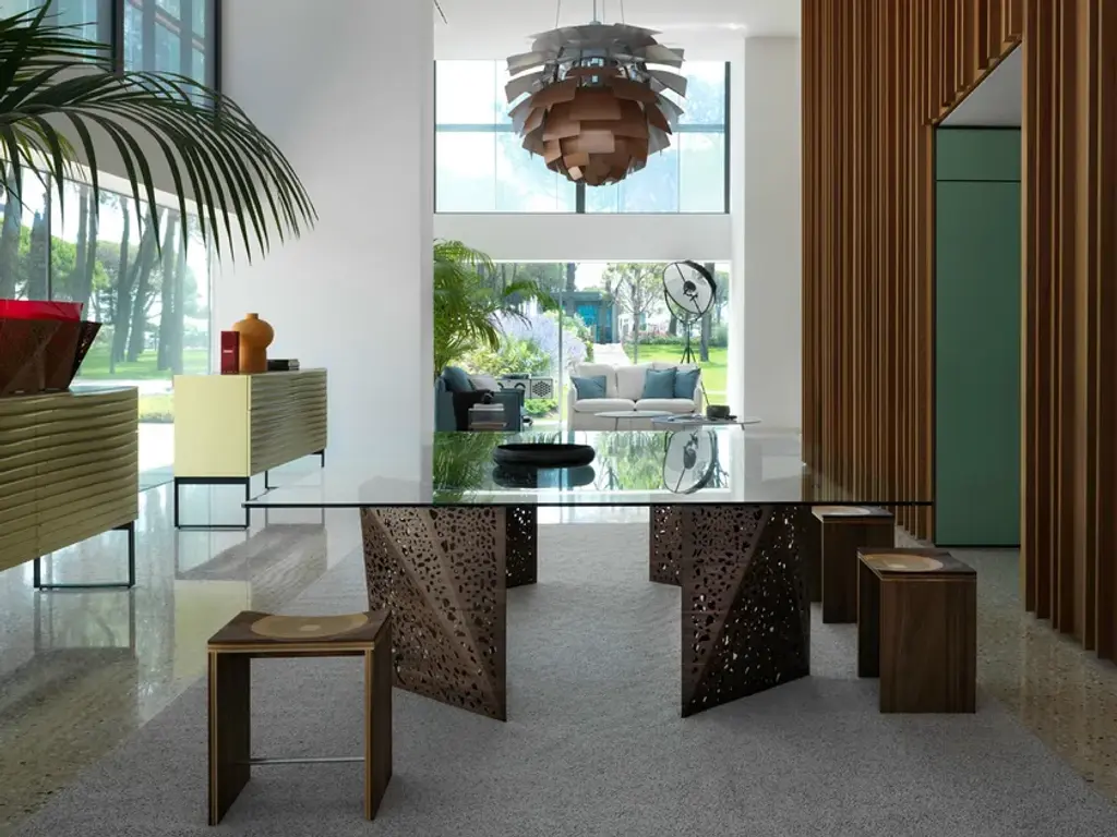 The originality and workmanship of its legs are the outstanding features of the Riddled table, which incorporates the notion of porosity found in multiple architecture works by Steven Holl. The thin sheets of wood, folded through laser engraving, make this project even more spectacular in its apparent defiance of the laws of physics. These two legs, akin to origami sculptures, allow the passage of the internal light to create a myriad of lights and shadows. Extra-clear tempered glass top with polished edge, 12 mm thick. Legs made from a material designed and patented by Horm. it, composed of a sandwich of wood and fabric 2. 2 mm thick, which, thanks to a number of superficial incisions made with a laser cutter, can be folded up like origami. The stainless steel plates, measuring 30 mm in diameter and 10 mm in height, are fixed with M6x18 screws on the triangular frame made of solid wood and attached with UV adhesive onto the glass top. The legs are fixed on the frame with studs with galvanized thread and flat point. Optional LED system with rechargeable batteries (6 hour battery life) on the inside of the legs. FINISHFeet: walnutTop: tempered glassThe originality and workmanship of its legs are the outstanding features of the Riddled table, which incorporates the notion of porosity found in multiple architecture works by Steven Holl. The thin sheets of wood, folded through laser engraving, make this project even more spectacular in its apparent defiance of the laws of physics. These two legs, akin to origami sculptures, allow the passage of the internal light to create a myriad of lights and shadows.Extra-clear tempered glass top with polished edge, 12 mm thick. Legs made from a material designed and patented by Horm.it, composed of a sandwich of wood and fabric 2.2 mm thick, which, thanks to a number of superficial incisions made with a laser cutter, can be folded up like origami. The stainless steel plates, measuring 30 mm in diameter and 10 mm in height, are fixed with M6x18 screws on the triangular frame made of solid wood and attached with UV adhesive onto the glass top. The legs are fixed on the frame with studs with galvanized thread and flat point. Optional LED system with rechargeable batteries (6 hour battery life) on the inside of the legs. FINISHFeet: walnutTop: tempered glass