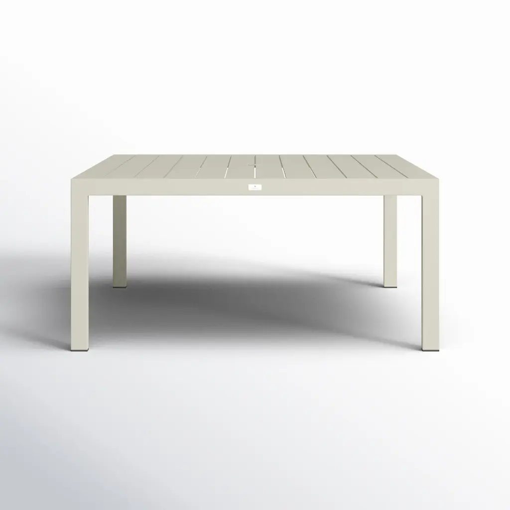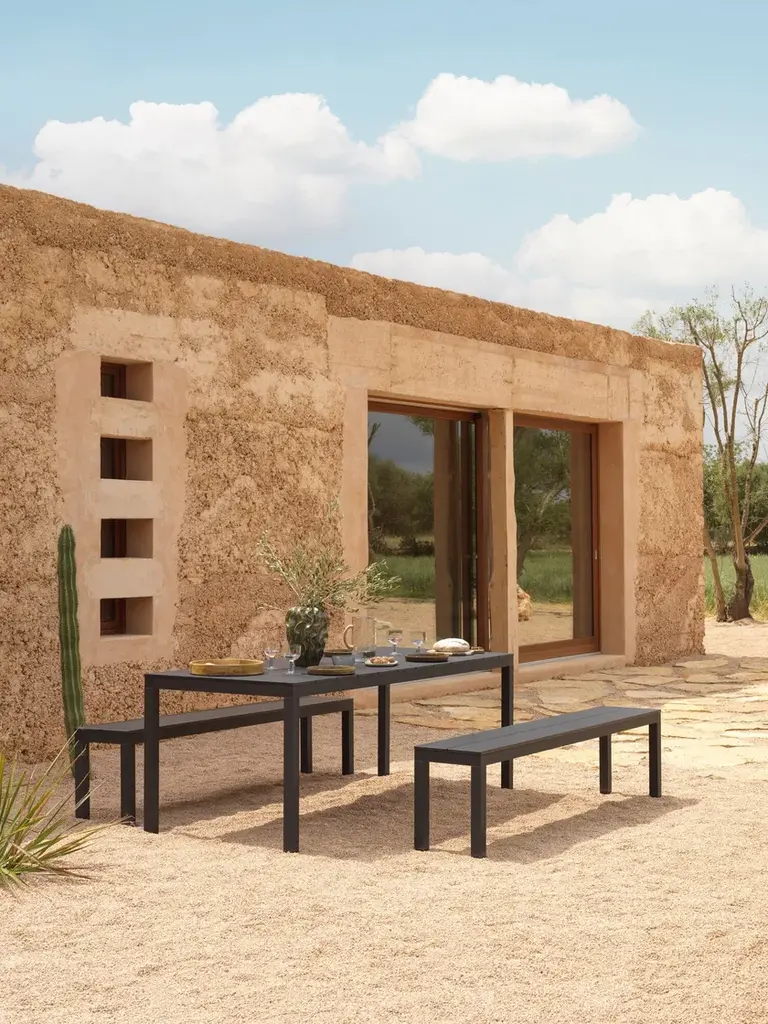 Rio Alu Fix is a table with a coated aluminium slatted top with a striped texture and structure, and a coated aluminium frame. It has a striking personality with rigorous architectural overtones and a textured appearance.