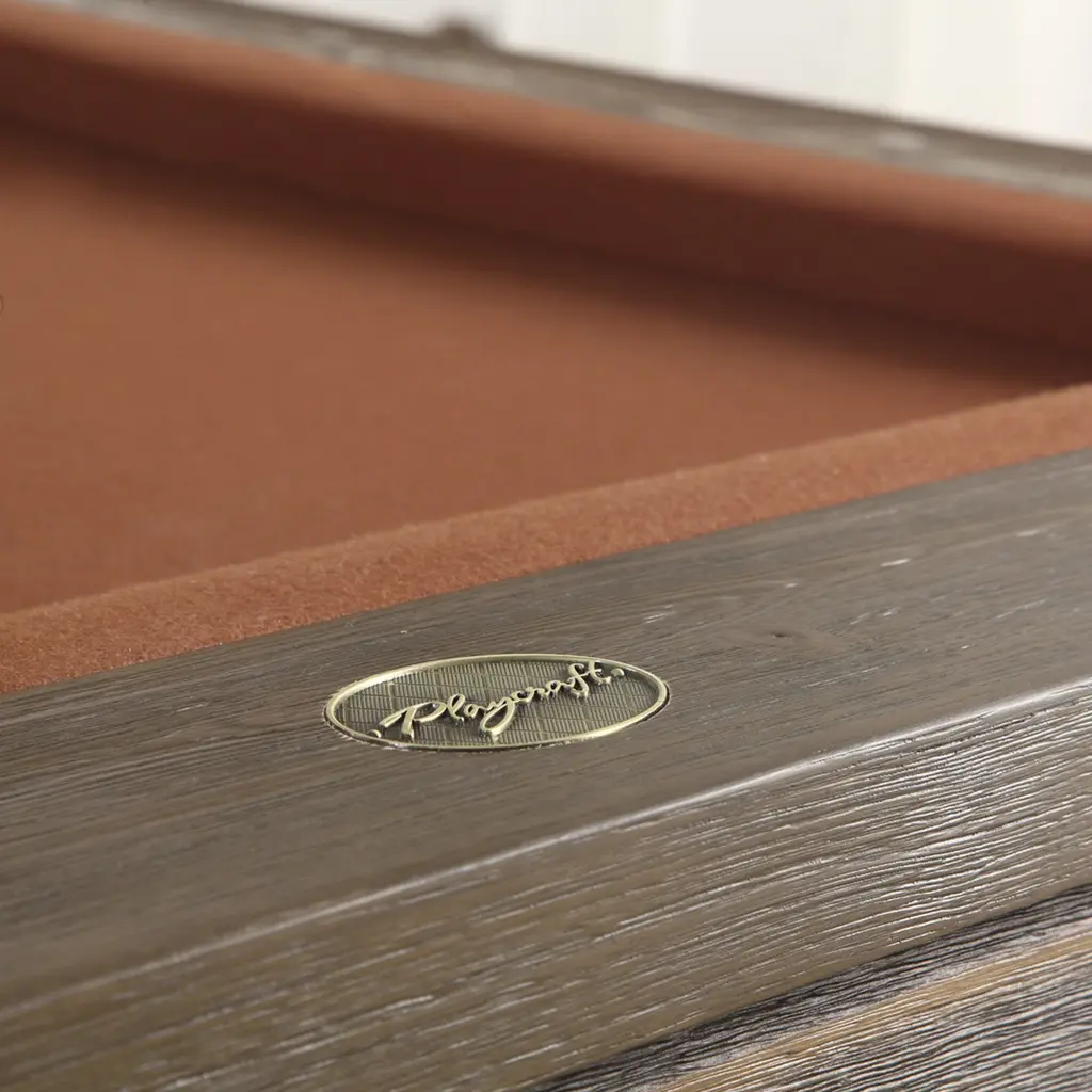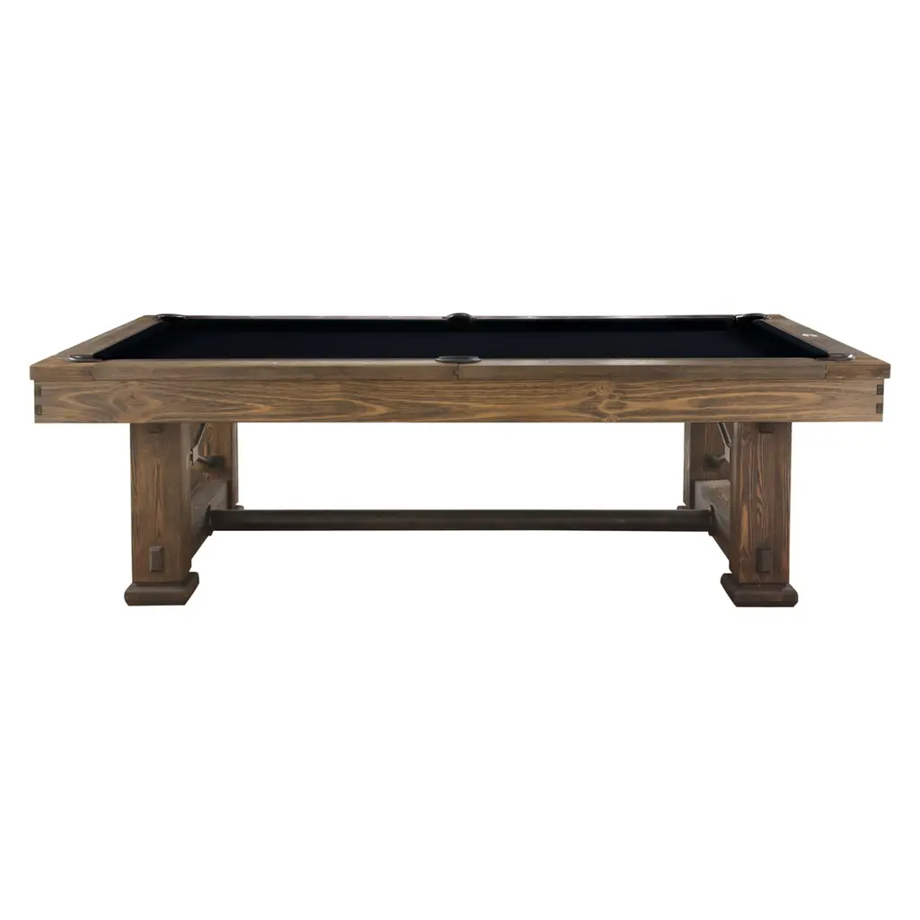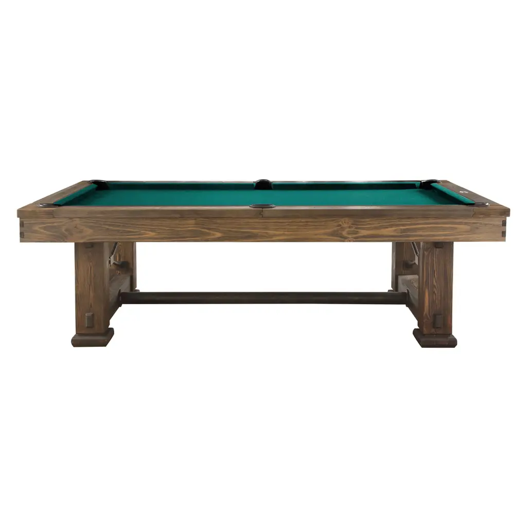 The Rio Grande Slate Pool Table from Playcraft combines timeless craftsmanship with durable performance. Featuring a post and beam leg design with artisan joinery and hand finishing, its Weathered Bark or Weathered Raven finish evokes the charm of reclaimed barn wood. Built to BCA standards, it includes premium K66 gum rubber cushions and inlaid sights on the rails for precise play. This elegant table promises lasting quality and refined style, perfect for memorable billiards gatherings with family and friends. Highlights