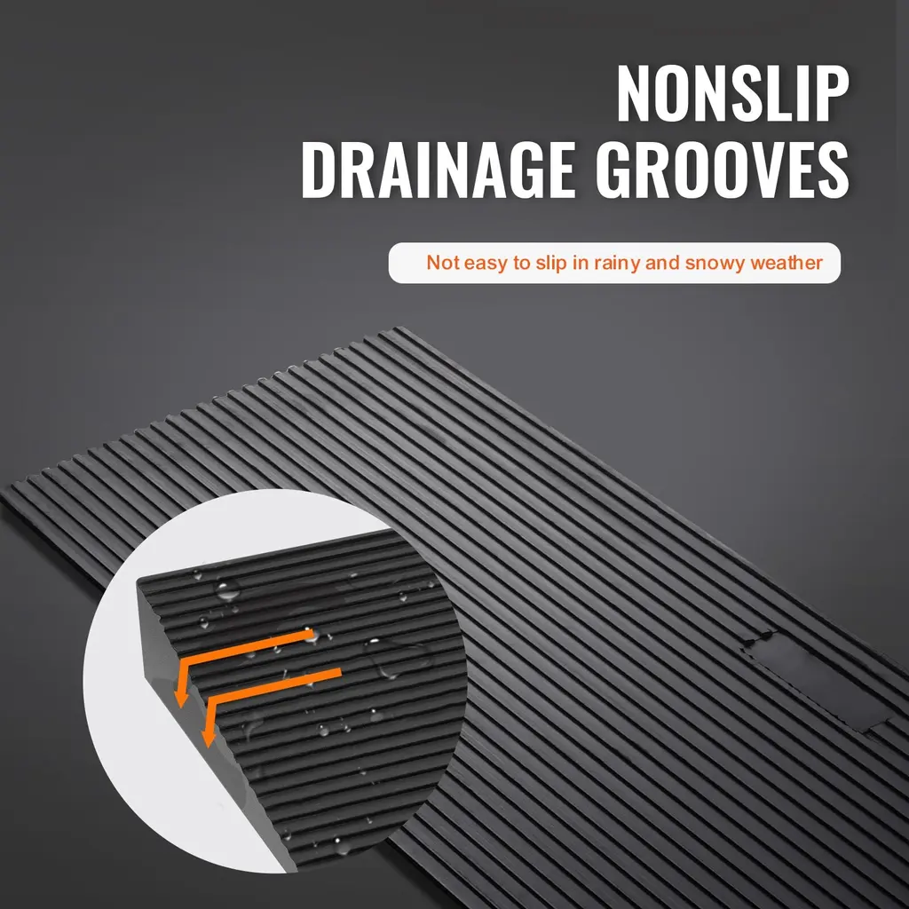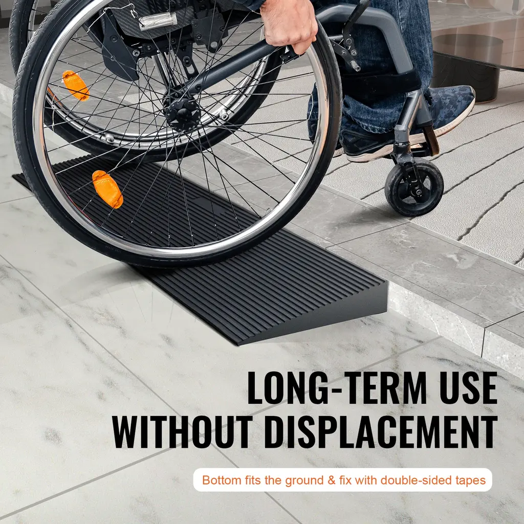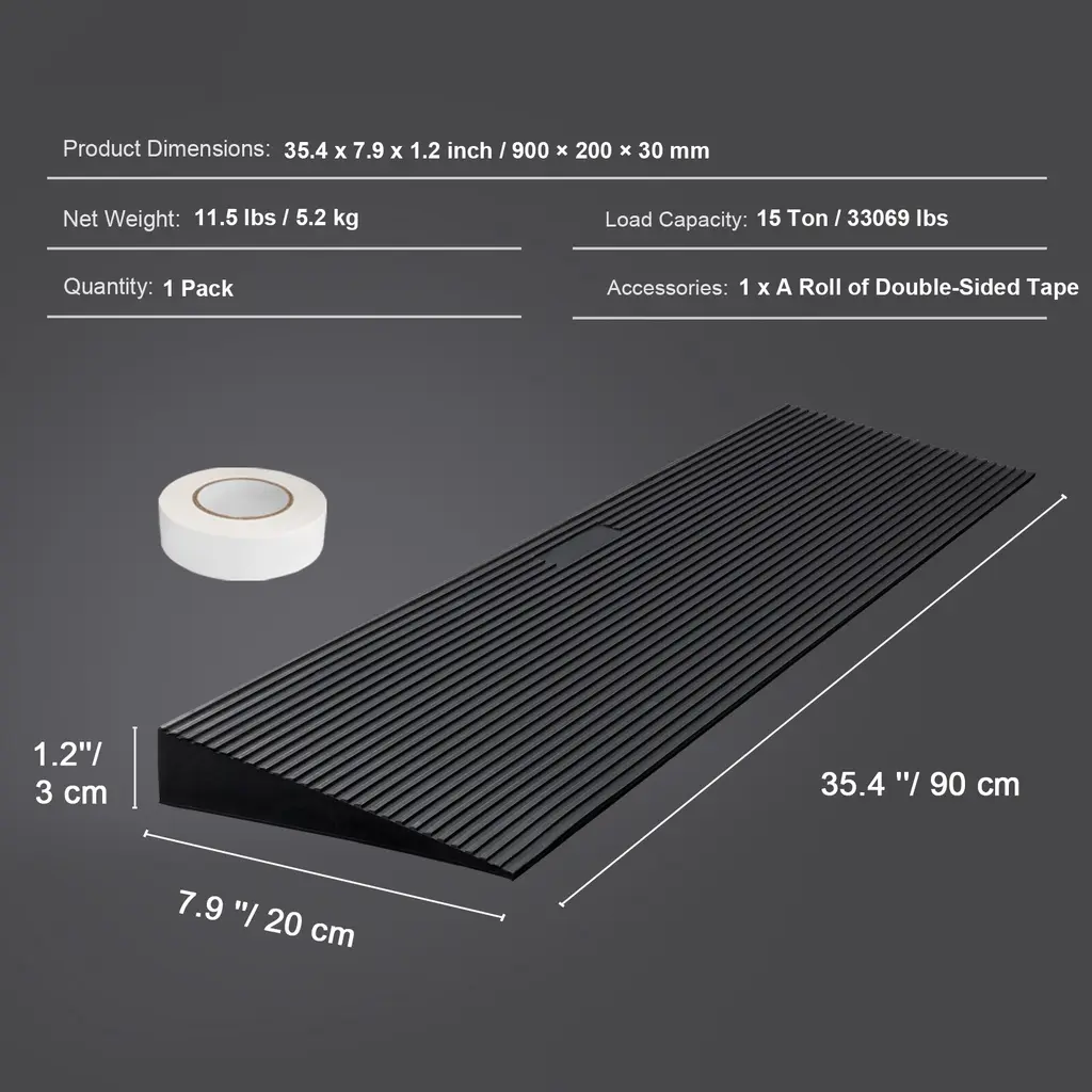 33069 lbs Loading Capacity: solid ramp provides you with a smooth and stable slope transition, with a super strong bearing capacity of up to 15 tons, which can be used for long-term transportation or climbing of wheelchairs, sweeping robots, pushcarts, baby carriages, etc. Compression resistance is not easy to deform.Premium Material: Natural rubber material is used to ensure the advantages of high-temperature resistance, wear resistance, and not easy to deform. It has no irritating smell and only a slight rubber smell, making you feel more at ease when using it. Non-slip Surface: The surface of wheelchair ramp is designed with anti-slip stripes to enhance friction and traction, easily cope with wet and rainy weather, and reduce the risk of wheel slipping. Customizable Cutting: The ramp has 35.4" width which can be cut freely and flexibly to suit the threshold width of your different venues, and the remaining part can also be used as a door stop to protect your threshold from damage; the gentle angle allows the sweeping robot to easily climb slopes. Fit to Ground Firmly: The solid threshold ramp fits the ground, equipped with a roll of double-sided adhesive, firmly fixed on the floor or smooth tiles, and it is not easy to shift when placed in garages, doorways, roadsides, supermarkets and other places. Package Content 1 x Rubber Threshold Ramp 1 x A Roll of Double-Sided Tape