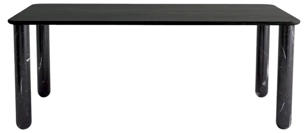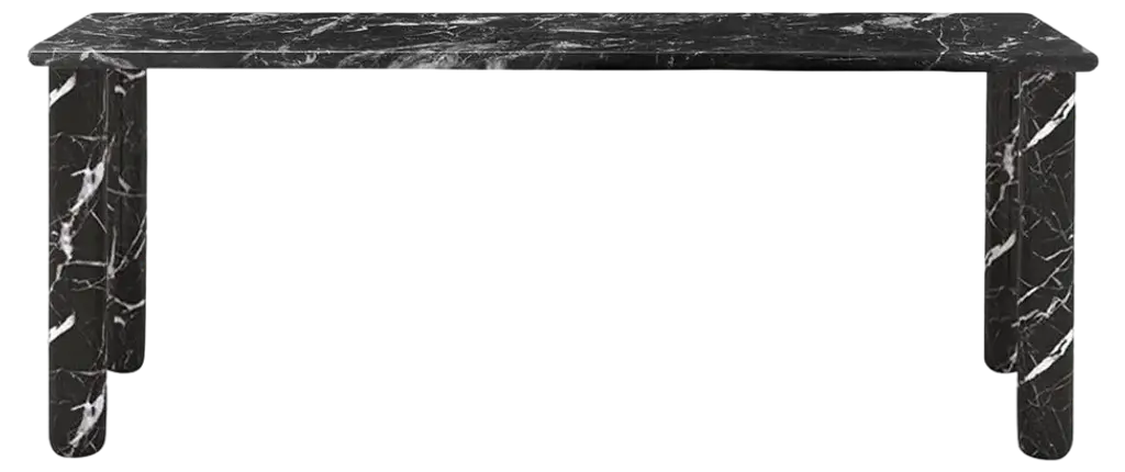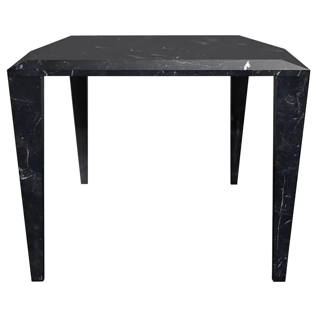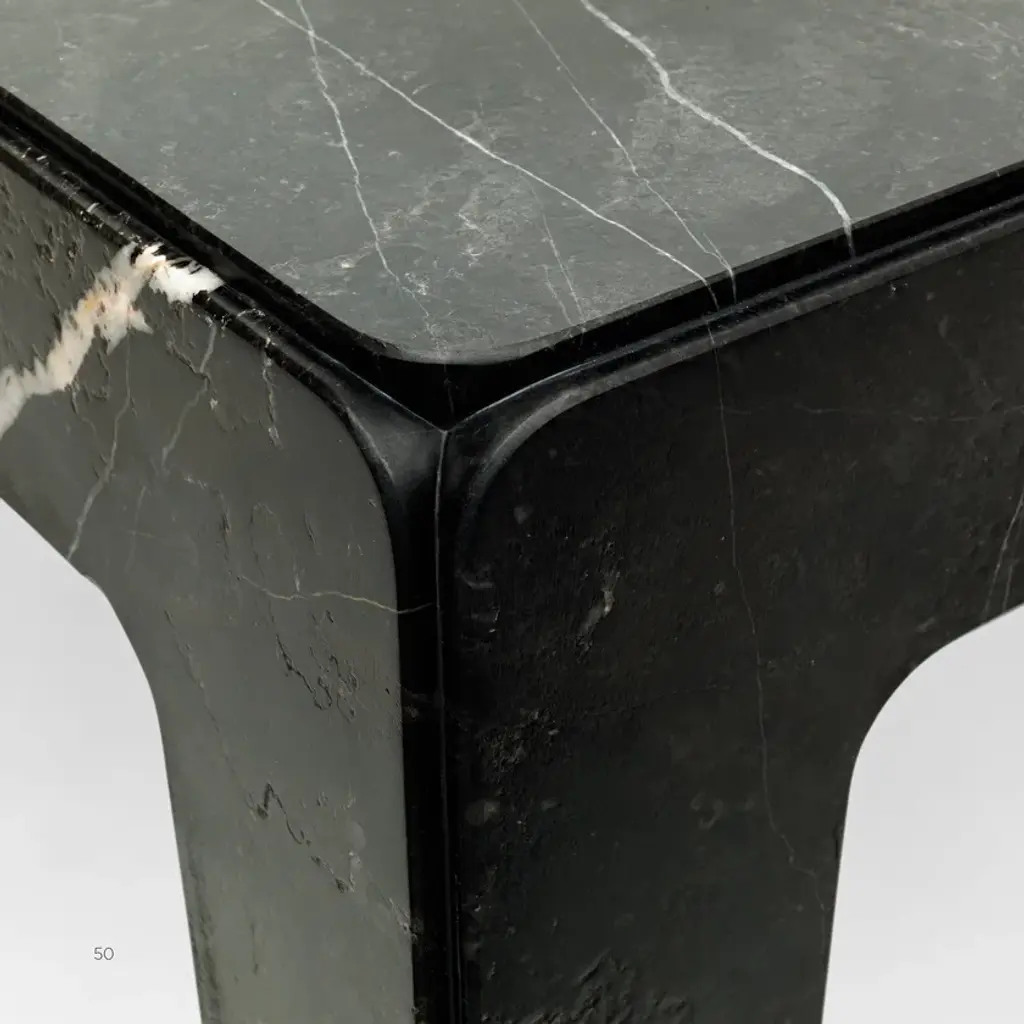Rock is a 4-legged table completely made of stone. Through a simple trick the table, which is in fact the assembly of five parts, appears sculpted from a solid block. The four lateral elements, once they are assembled with the top, become structural without the need for additional parts that would in turn compromise the sculptural effect of the piece. The surface of the table is treated with a slightly three-dimensional weathered finish that further increases the preciousness and uniqueness of the natural material and that in time hides potential scratches and stains. Materials:White Carrara, black New Saint Laurent or Cipollino marble. Weathered finish. Other stones and finishes are available upon request.