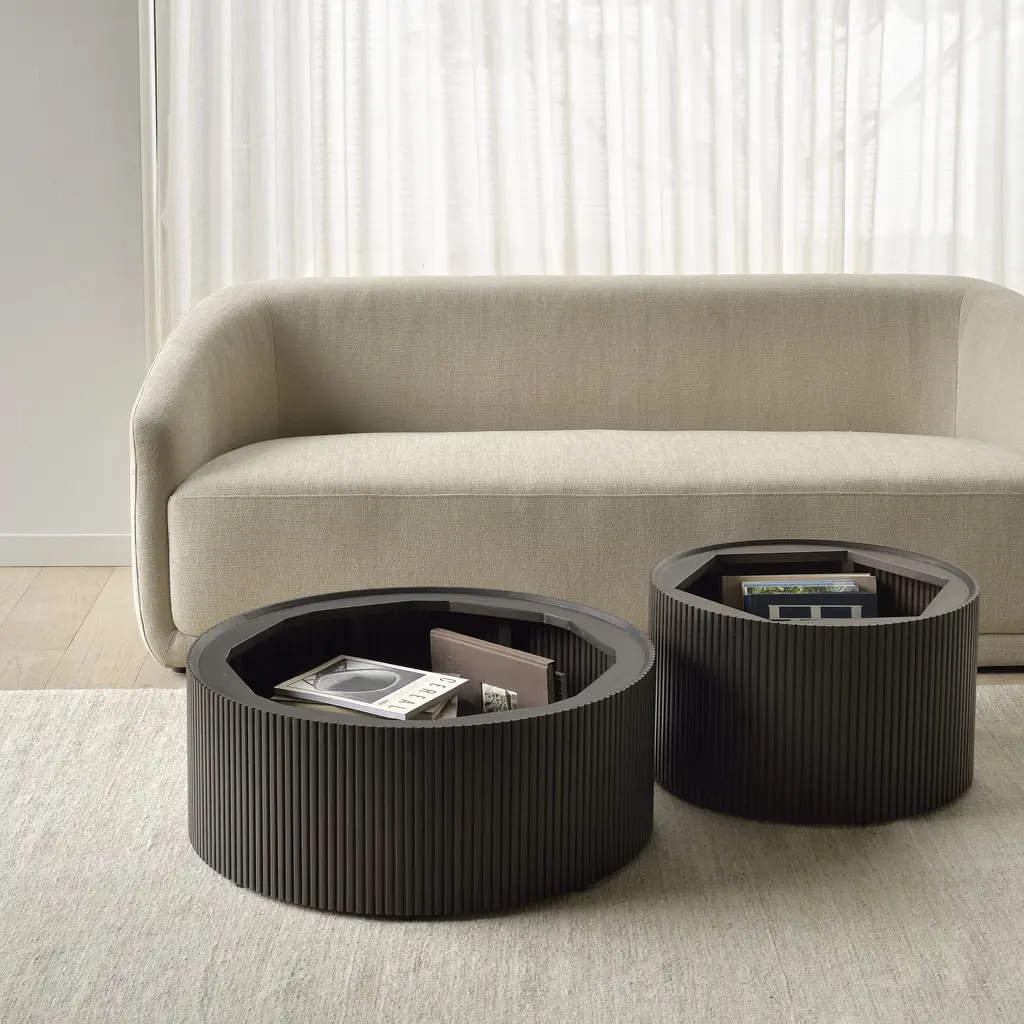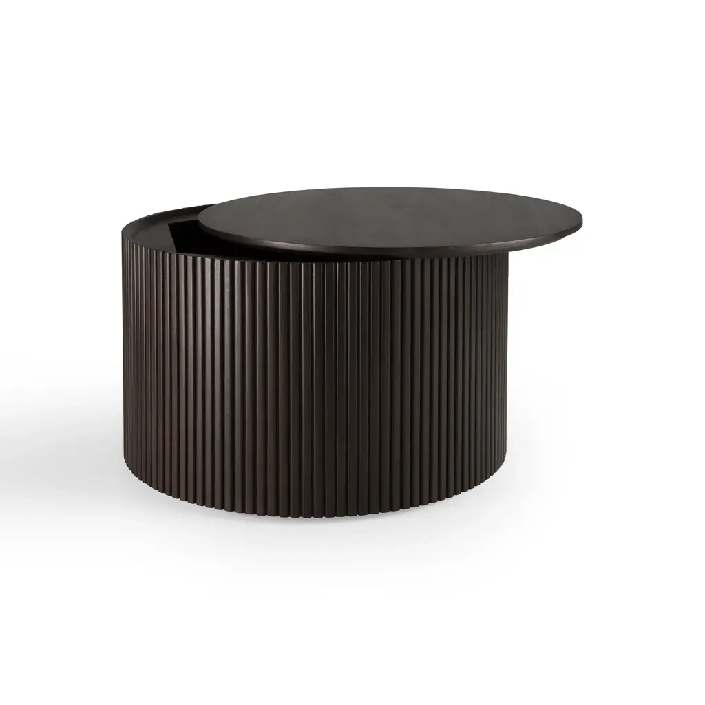 Multifunctional designs are always in style. Cleverly designed by Jacques Deneef, the Roller Max Round Coffee Table from Ethnicraft offers striking Scandinavian style that doubles as both functional furniture and convenient storage. Masterfully crafted and hand-carved from dark brown-tinted solid mahogany wood, the lid of this coffee table lifts to reveal space to hide pillows, magazines, throws, and more, ensuring your space is always clean and clutter-free. Highlights