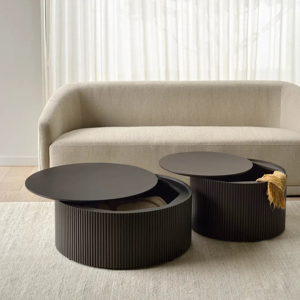 Multifunctional designs are always in style. Cleverly designed by Jacques Deneef, the Roller Max Round Coffee Table from Ethnicraft offers striking Scandinavian style that doubles as both functional furniture and convenient storage. Masterfully crafted and hand-carved from dark brown-tinted solid mahogany wood, the lid of this coffee table lifts to reveal space to hide pillows, magazines, throws, and more, ensuring your space is always clean and clutter-free. Highlights