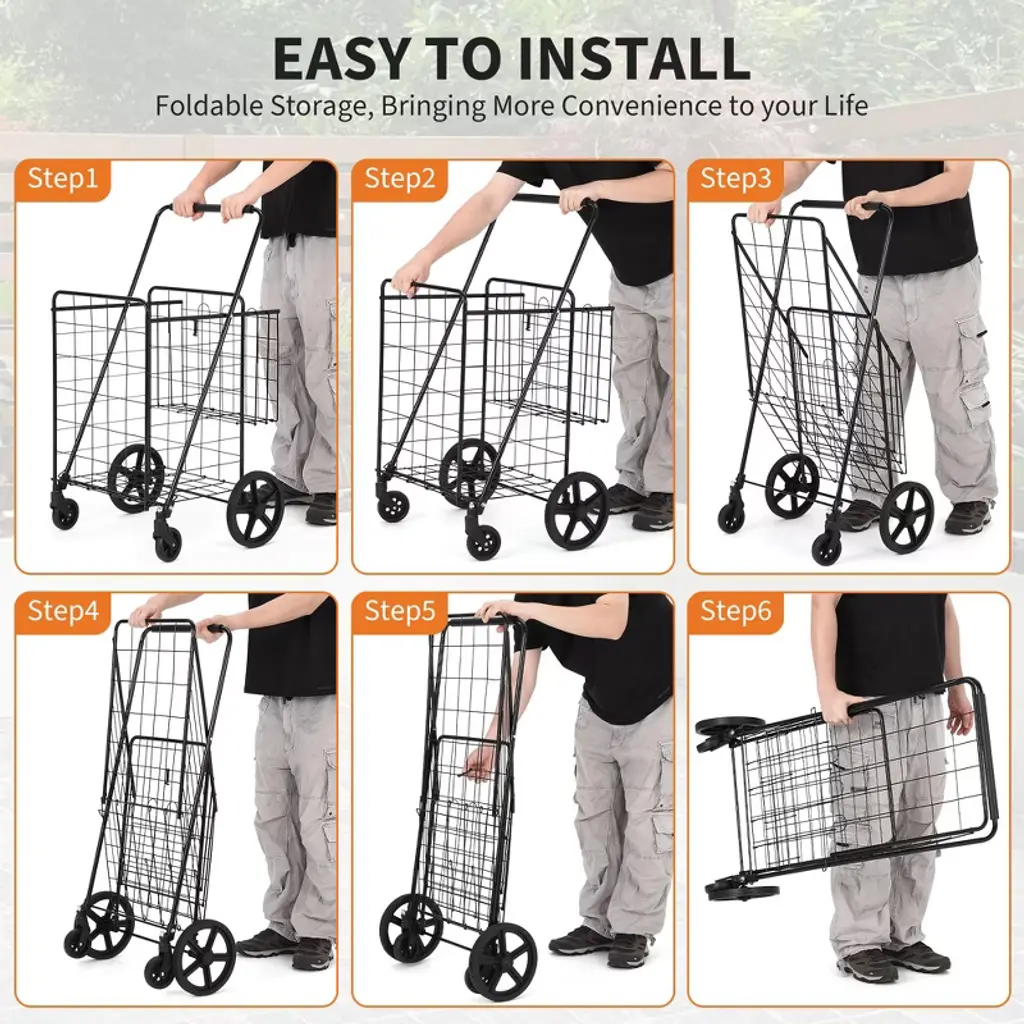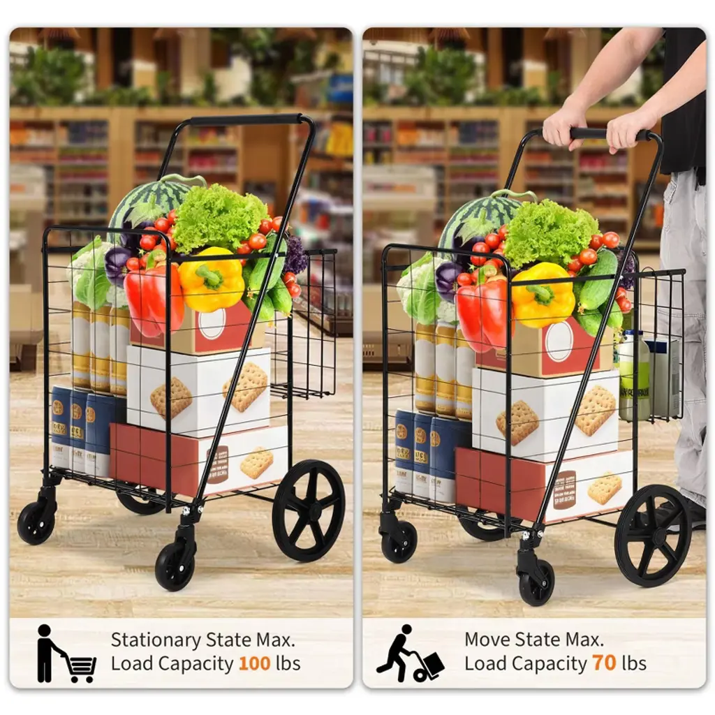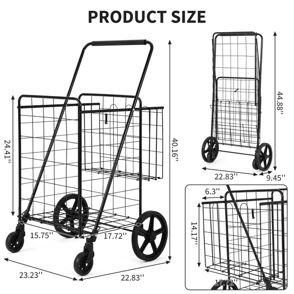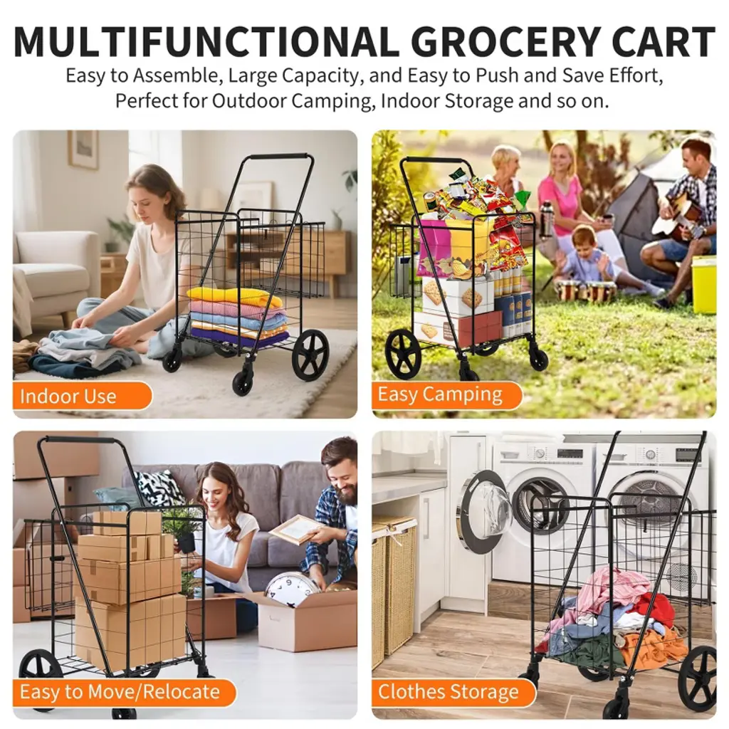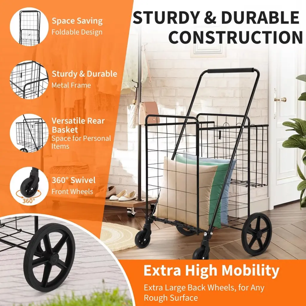 This rolling foldable grocery cart is designed for convenience and versatility, featuring a spacious main basket and a handy rear basket for smaller items. The durable frame holds up to 100 lbs and glides smoothly on four sturdy wheels, even over uneven surfaces. With its easy folding mechanism and secure closure, this cart is perfect for groceries, laundry, camping gear, and more. Assembly is straightforward: just unfold and attach the wheels for instant use.
