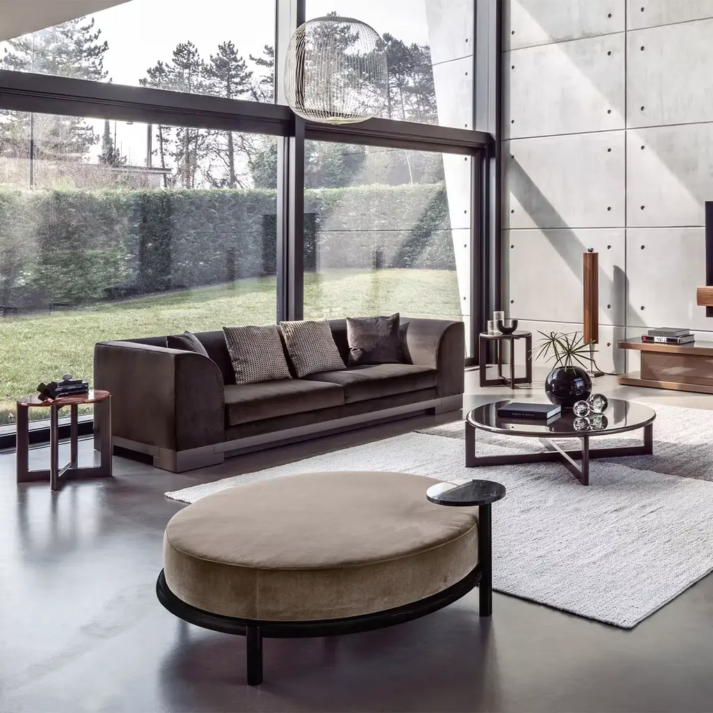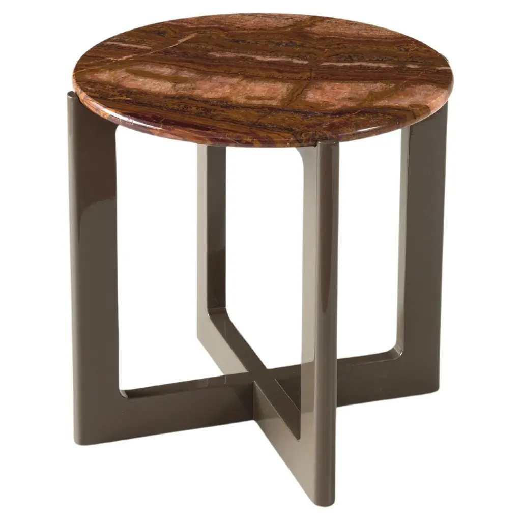 Elevate your space with this masterfully designed piece that seamlessly marries form and function. The solid Beech wood frame with a warm Ebony lacquer supports a round Red Onyx top with softened edges and daring red, copper, and brown veins. The contrast between the solid top and the X-shaped underscores the beauty of organic shapes and textures. Inquire with the Concierge for available customizations, including materials and lacquer.