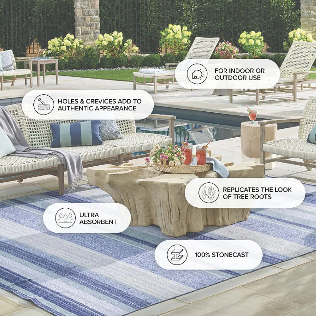 Natural beauty takes center stage with our Root Round Tables. These stunning tables are designed to replicate the look of a tree trunk. Made from a durable resin and fiberglass mix, these showpieces are suitable for use outside, but are equally at home among your indoor decor. Mold hand cast from forest tree Stone in Roman Stone finish Hand-cast stone composite Design imitates tree trunkCoordinates with Root Tables in Stone FinishBest used in covered outdoor area or with Tailored Furniture Cover to protect from the elements To prevent injuries or damage to item, recommended team lift (two or more people) for placement of tables Wipe clean with a soft cloth using soap and water; do not use harsh chemicals Use of coasters is recommended to prevent watermarks and scratching