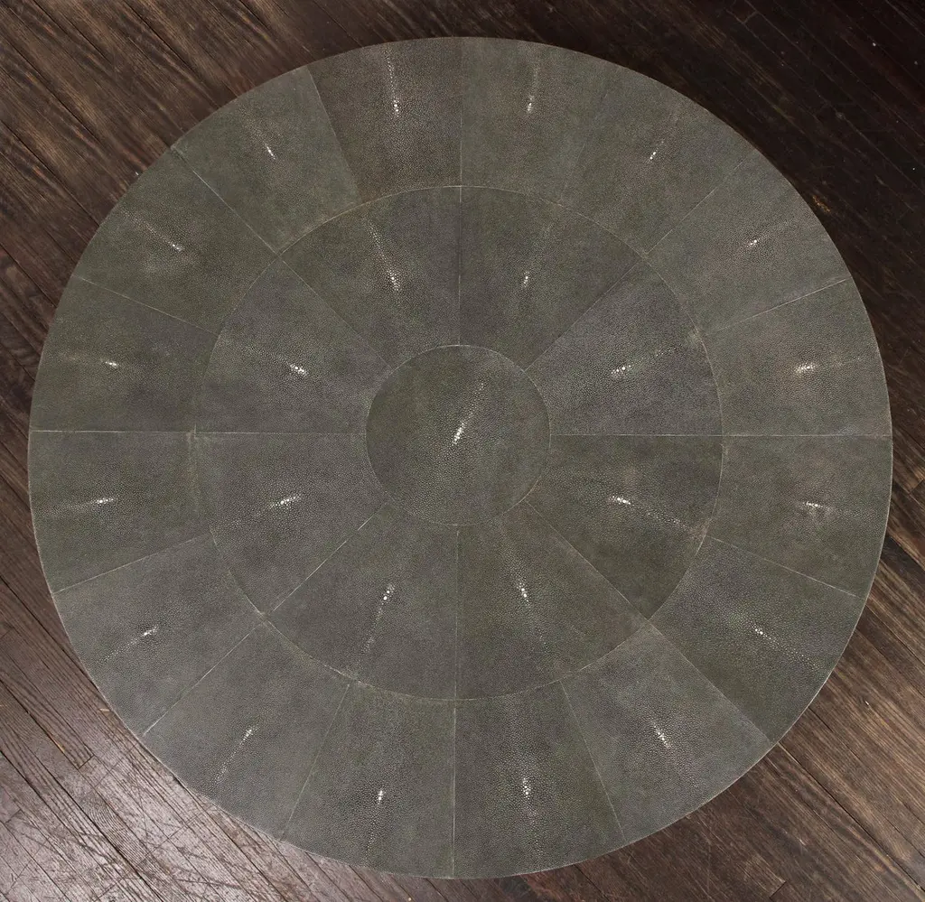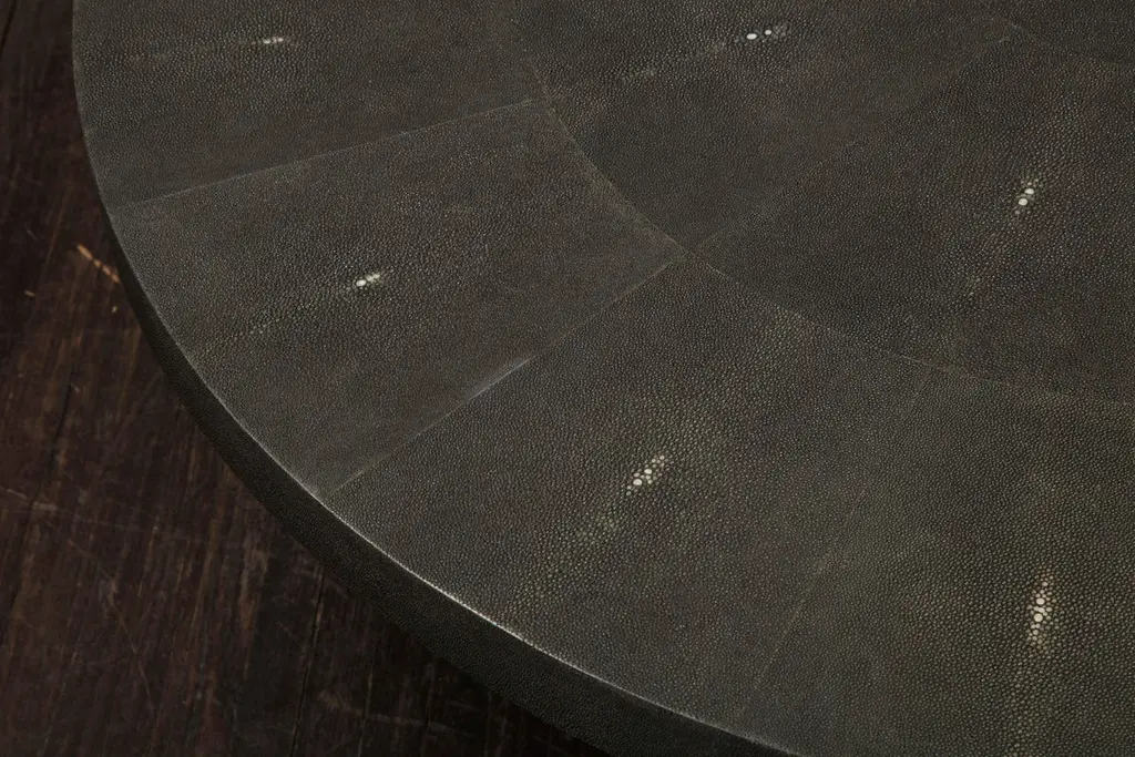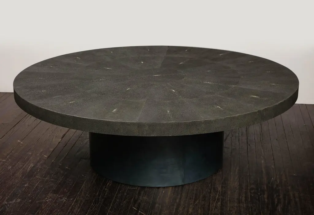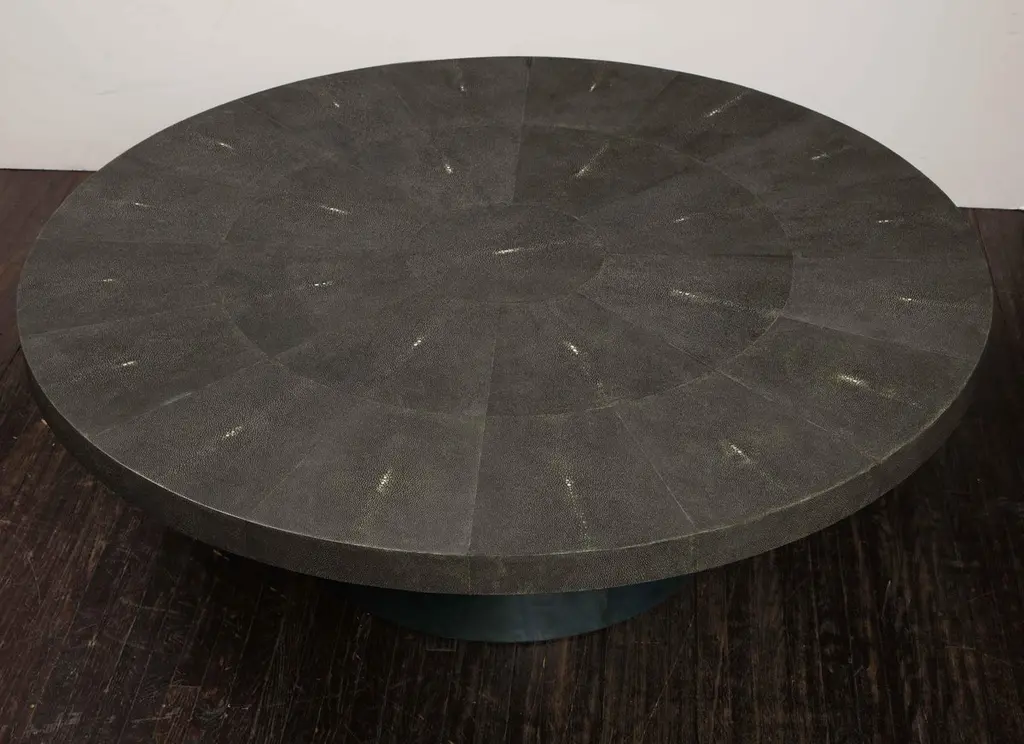 Custom, made-to-order round, black shagreen table with parchment pedestal base. Other shagreen colors available. Inquire with Venfield for custom orders. DIMENSIONS:Diameter: 48 inchesHeight: 16.5 inchesCondition: Custom, made to order
