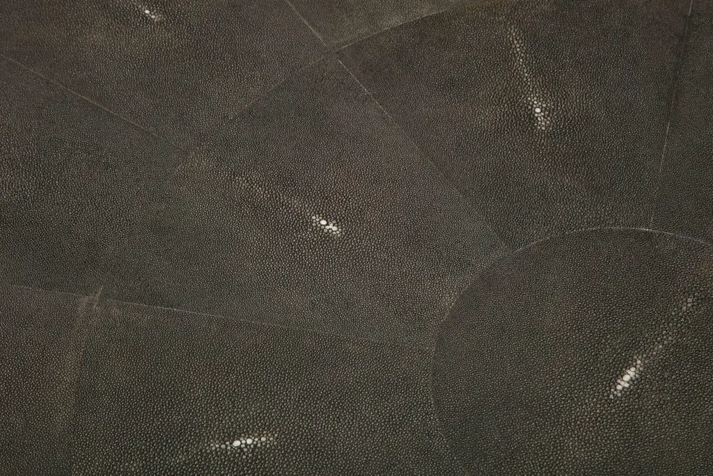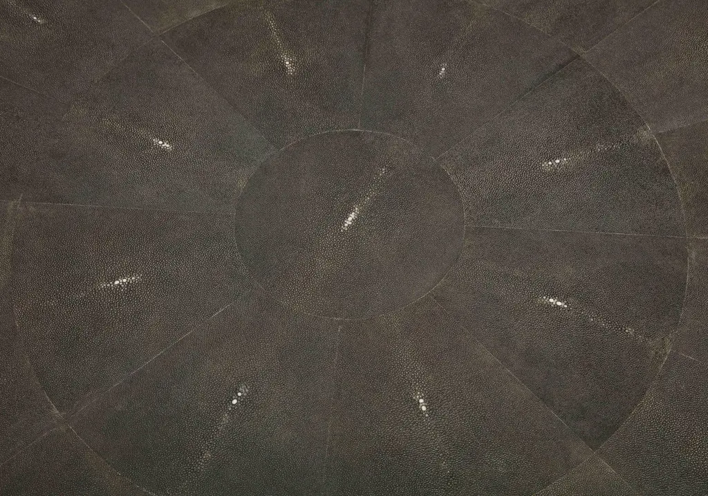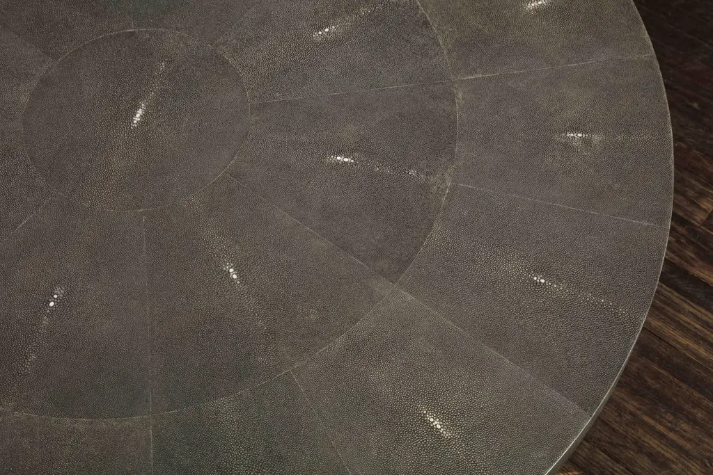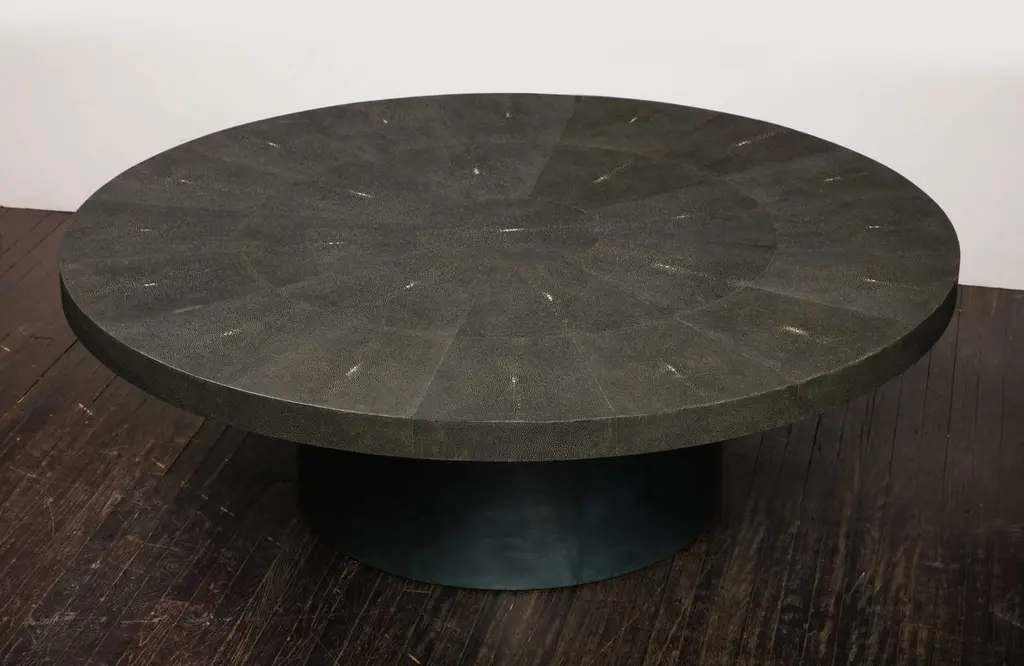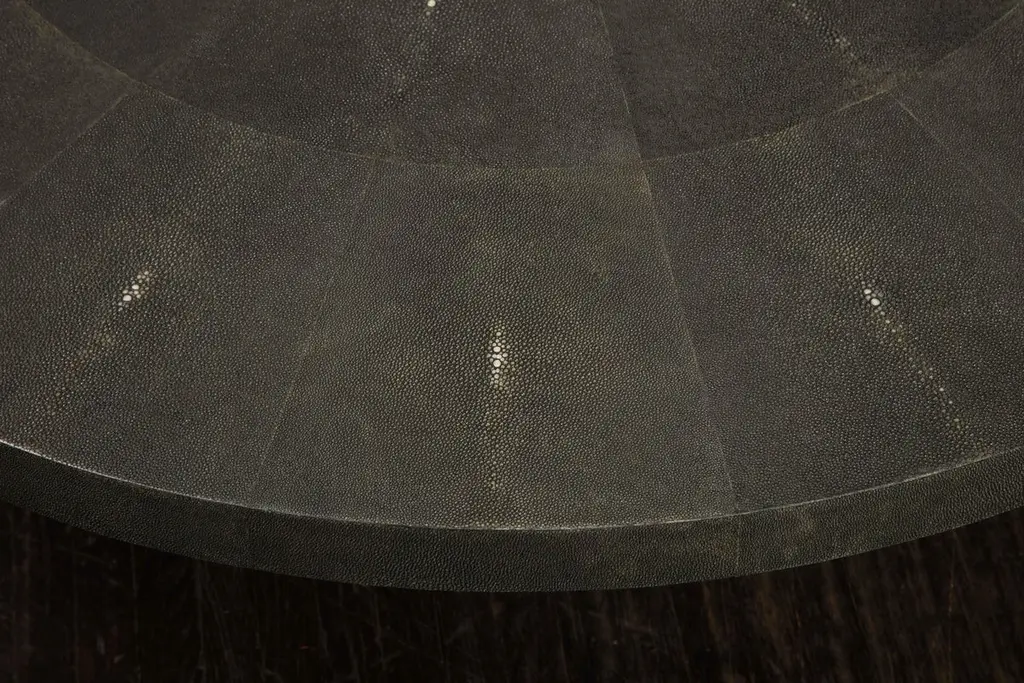Custom, made-to-order round, black shagreen table with parchment pedestal base. Other shagreen colors available. Inquire with Venfield for custom orders. DIMENSIONS:Diameter: 48 inchesHeight: 16.5 inchesCondition: Custom, made to order
