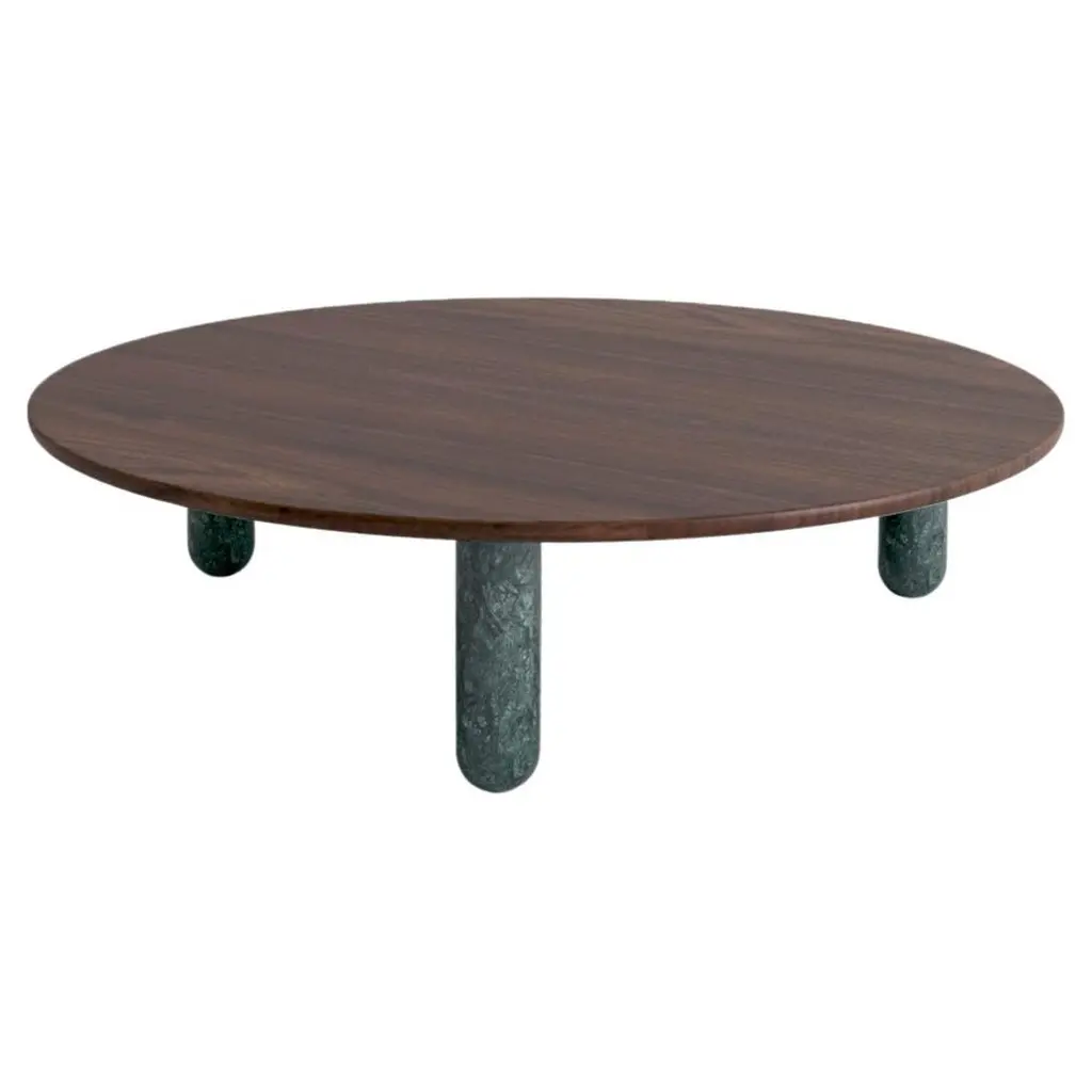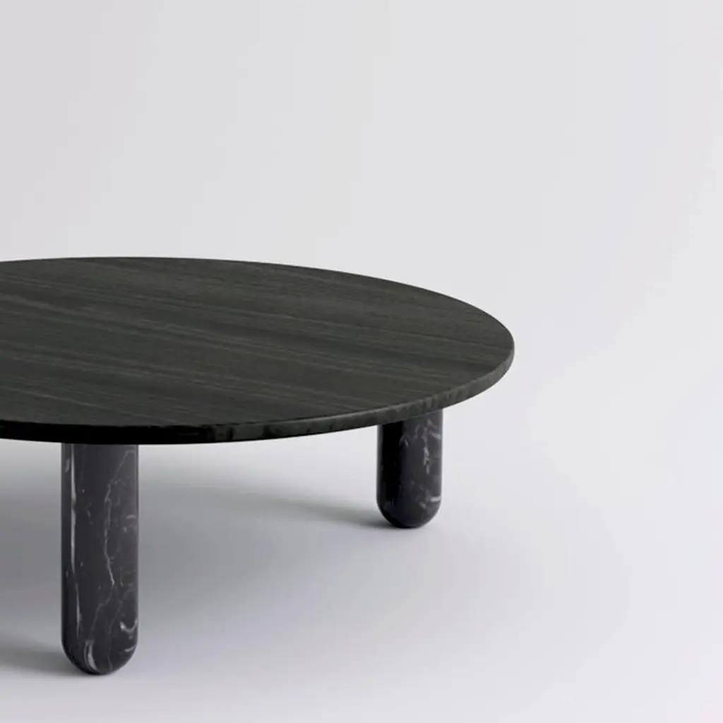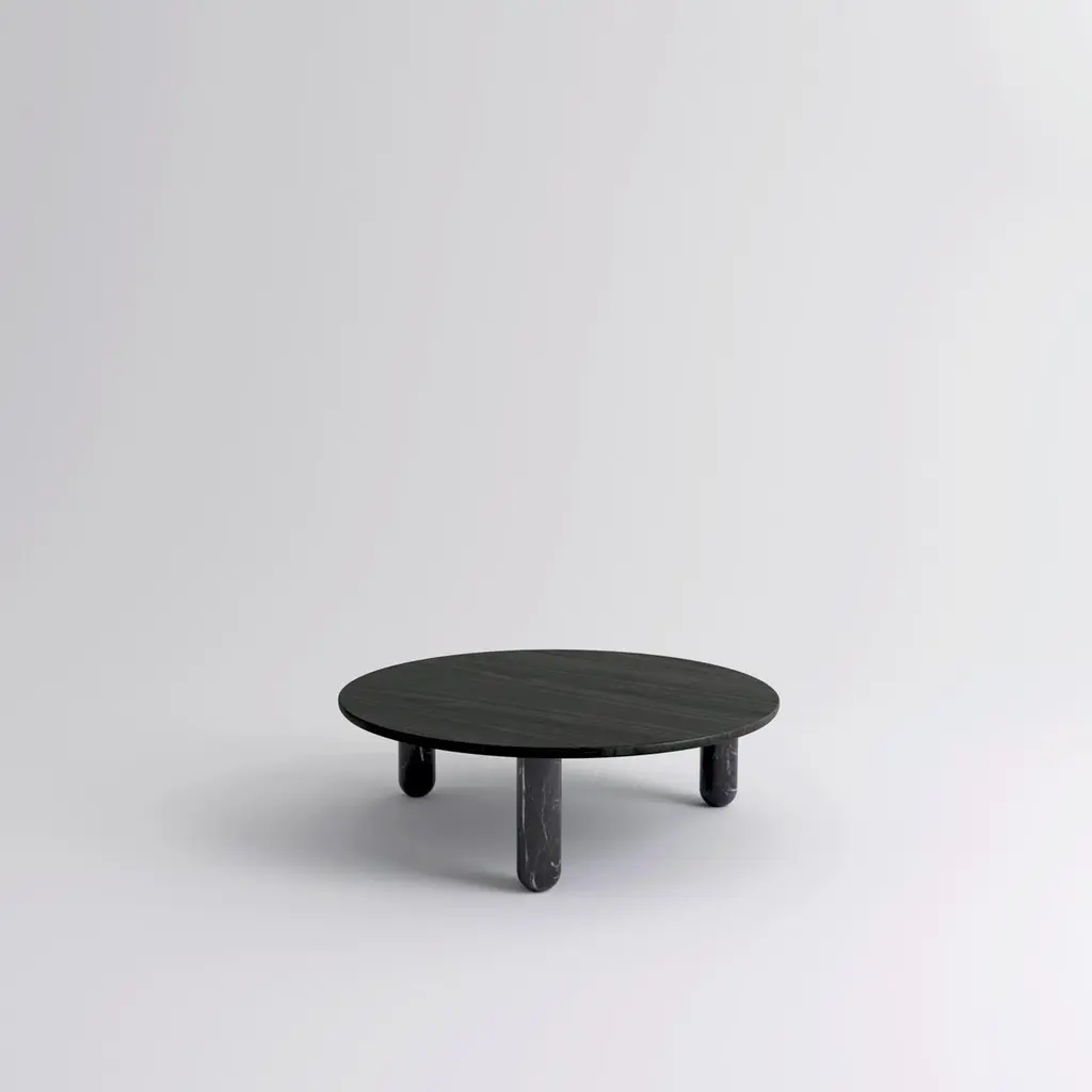 Round black marble "Sunday" coffee table, Jean-Baptiste SouletieDimensions: 120 D x 35 H cmMaterials: Black Marquina marble legs, black stained wood top.Available in 2 sizes: D150 / D120Available in 2 top materials: walnut / black stained woodAvailable in 3 leg materials: Pele de Tigre marble / Black Marquina marble / Indian green marble.Sunday is a family of coffee tables and low consoles with a simple and clean design vocabulary. The combination of heavy marble legs with the thin solid wood or marble top creates an interesting contrast while the rounded edges and generous proportions provide a comforting feeling.Jean-Baptiste Souletie is the Co-founder of the furniture editor La Chance with Louise Breguet. He studied in India, worked for a merchant bank in London (where he designed their new offices), before working for an investment fund (where he redevised the graphic chart), and in the strategic department of a luxury goods company in Paris. He returned to his first loves, architecture and furniture, when he founded La Chance in 2012.