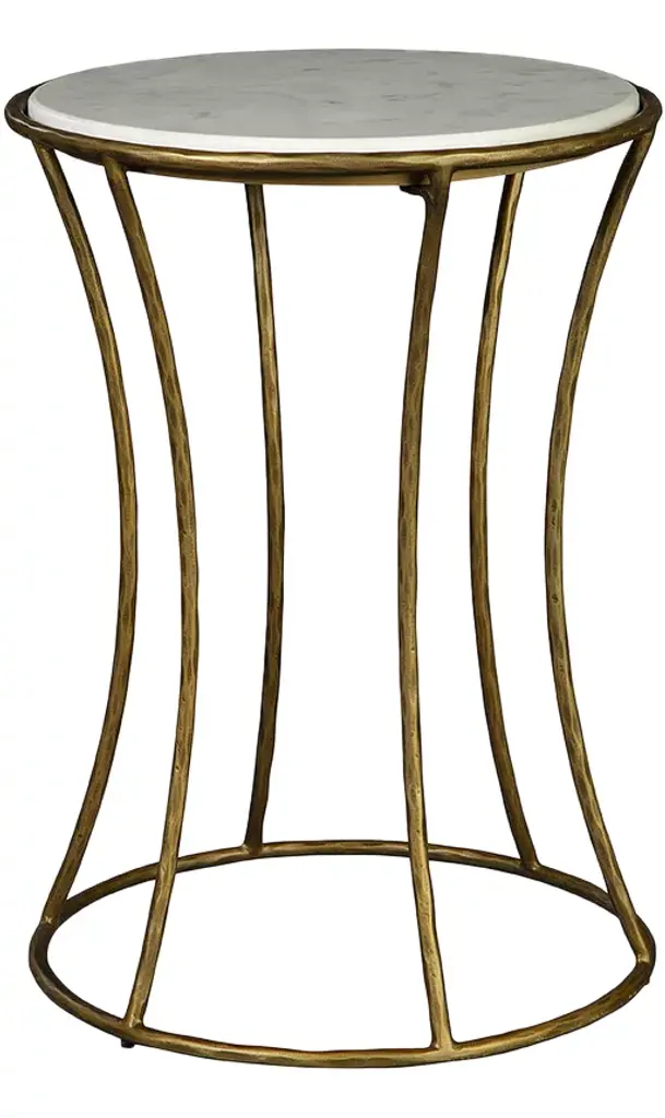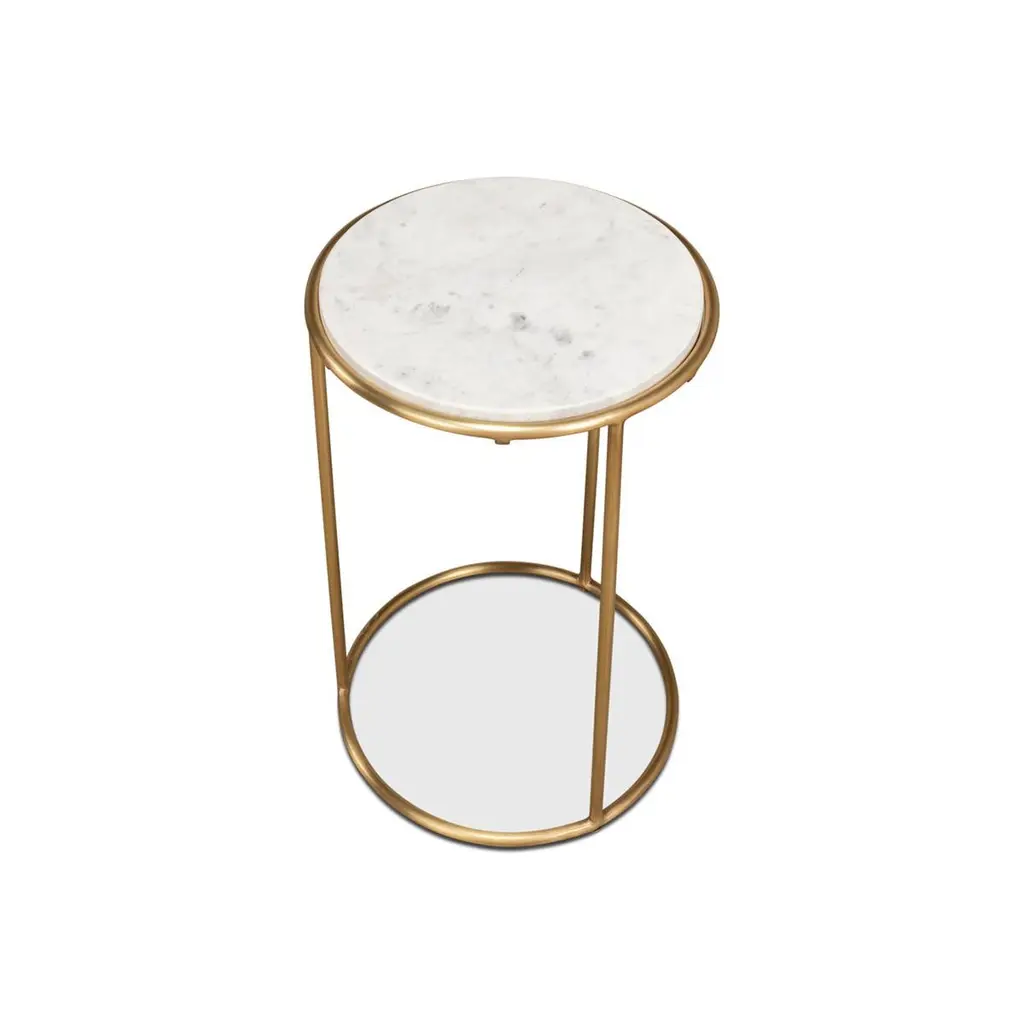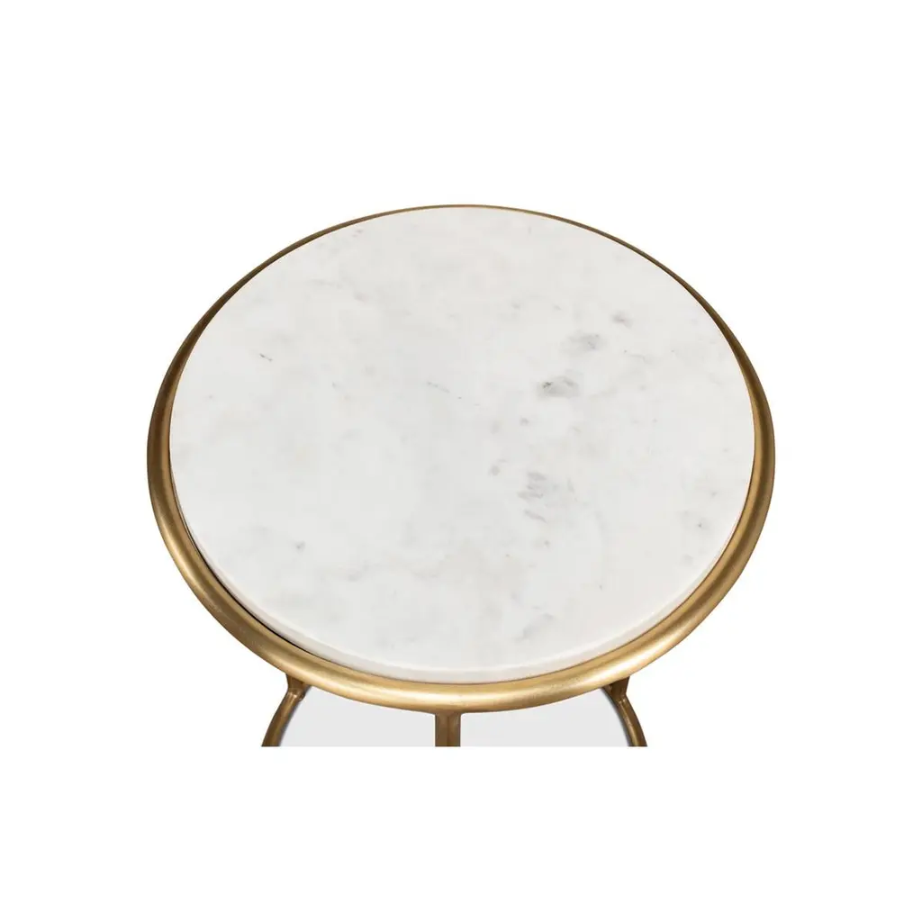 With an inset white marble top, and a brass modern open cylindrical form base.Dimensions: 14" W x 14" D x 22" H
