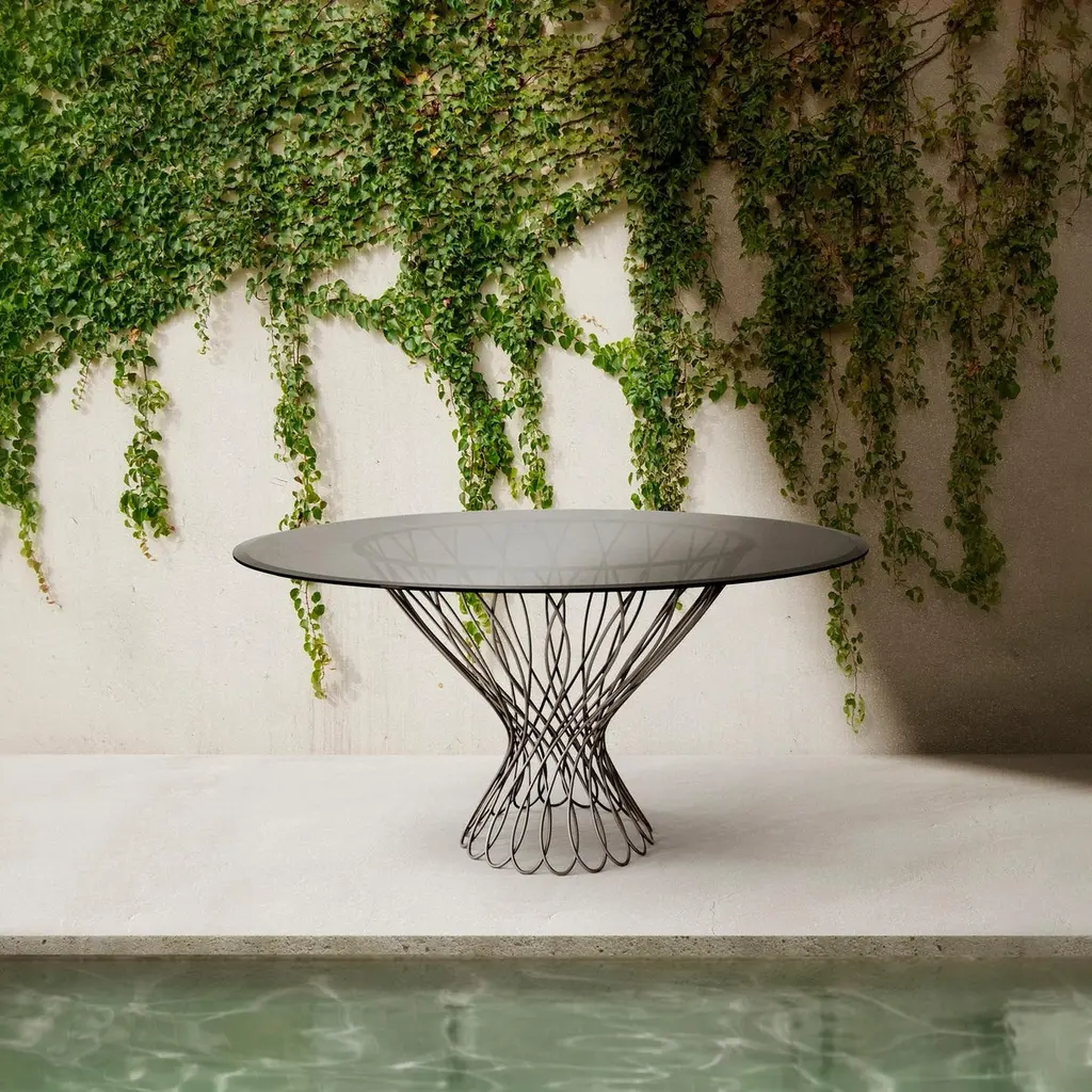 Round dinning table "Pane" in Iron and GlassSmart round dinning table with sophisticated glass top on the interlaced exotic iron base.Table made in Gold Powder (Matte Finish), Bronze Glass (Tempered Glass)Measures : H: 78 cm, d: 182 cmTime of production 12 weeksref KK Allure