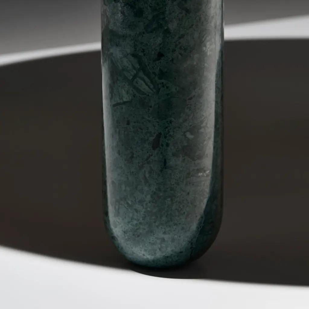 Round Marble "Sunday" coffee table, Jean-Baptiste SouletieDimensions: 120 D x 35 H cmMaterials: Indio green marble, walnut woodAvailable in 2 sizes: D150 / D120Available in 2 top materials: walnut / black stained woodAvailable in 3 leg materials: Pele de Tigre marble / Black Marquina marble / Indian green marble.Sunday is a family of coffee tables and low consoles with a simple and clean design vocabulary. The combination of heavy marble legs with the thin solid wood or marble top creates an interesting contrast while the rounded edges and generous proportions provide a comforting feeling.Jean-Baptiste Souletie is the Co-founder of the furniture editor La Chance with Louise Breguet. He studied in India, worked for a merchant bank in London (where he designed their new offices), before working for an investment fund (where he redevised the graphic chart), and in the strategic department of a luxury goods company in Paris. He returned to his first loves, architecture and furniture, when he founded La Chance in 2012.