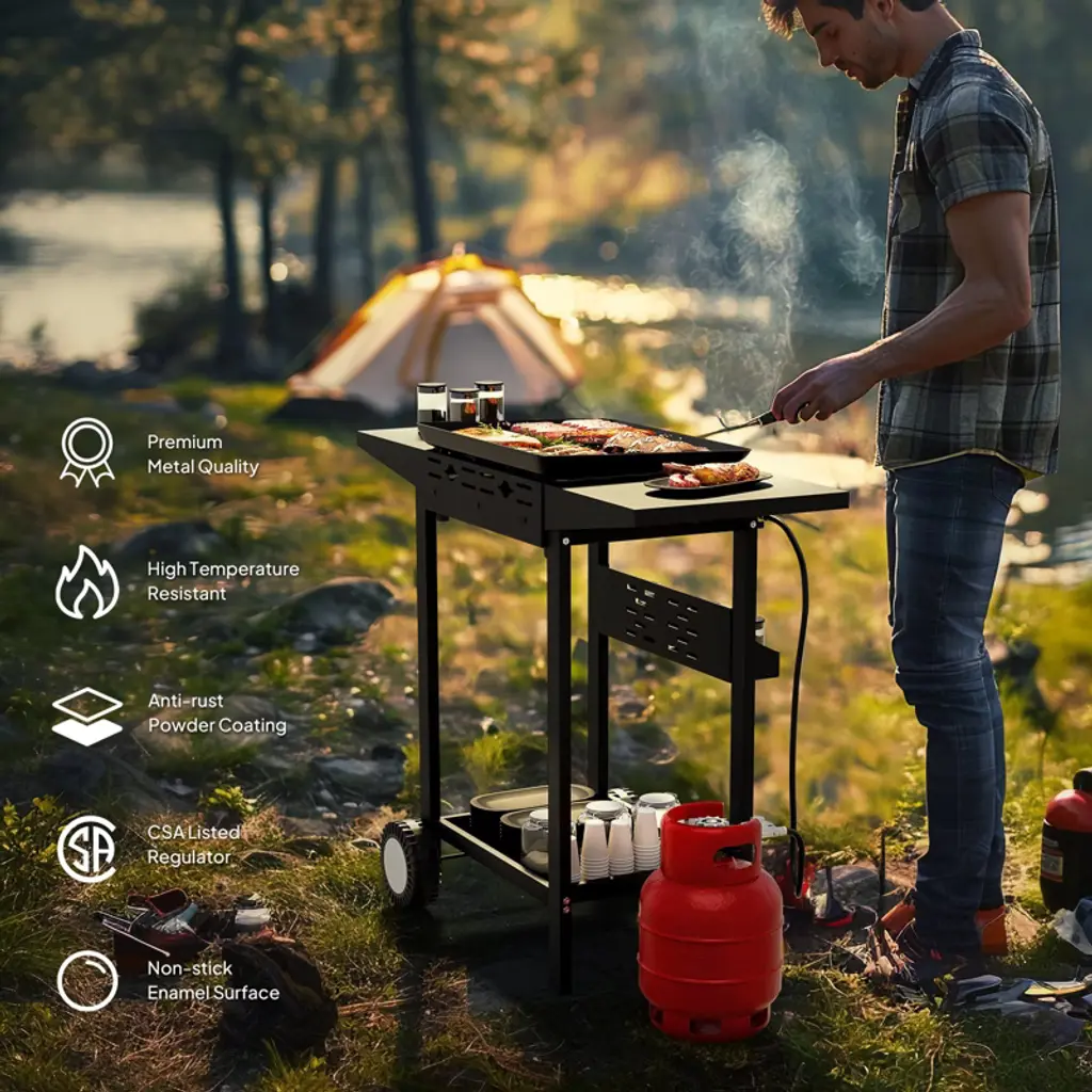 ROVSUN High-quality Porpane Griddle, a perfect companion for all your culinary adventures. Equipped with 2 independent stainless steel burners, it delivers a powerful combined heat of up to 20,000 BTUs. The flame is adjustable, catering to diverse cooking needs. Crafted from robust stainless steel and iron, it promises durability and lasting performance. It features an oil drip tray for easy cleaning post-use and a user-friendly hose and valve connection design, saving you time and money. With a generous cooking area of 246 square inches, including a 17.3'' × 14.2'' cooking zone, it offers ample space for grilling enthusiasts. It is equipped with two side shelves and a lower shelf rack for added convenience and storage. With built-in wheels, our flat top grill can be easily moved in the yard or outdoors for easy mobility. Whether you're planning outdoor grilling, camping, picnicking, or boating, our griddle is your go-to choice. Feature: 20,000 BTU grill heat quickly and evenly Piezo ignition design for simple lightening up Dual control knobs for easy temperature control Stainless-steel countertop and metal frame for long-term use Smooth enameled surface with oil drip collector for easy cleaning Easy to assemble with a detailed instruction provided Suitable for camping, traveling, picnic, BBQ, patio, backyard party, etc Specification Color: Black & Red Material: Metal+ Stainless Steel Overall Dimensions: 39.4'' x 15.4'' x 32.5'' (L x W x H) Grilling Surface: 17.3'' x14.2 ''(L x W) BTU of Cooking Burner : 2 x 10,000 Fuel Type: Propane Fuel: standard 20 lb propane tank(not included) Weight: 30 lbs Ignition Type: Piezo Package Includes: 1 x Propane Griddle 1 x Regulator 1 x Instruction Note: for style of freestanding Griddle with shelf, it comes in TWO boxes and delivery-date may be different per box