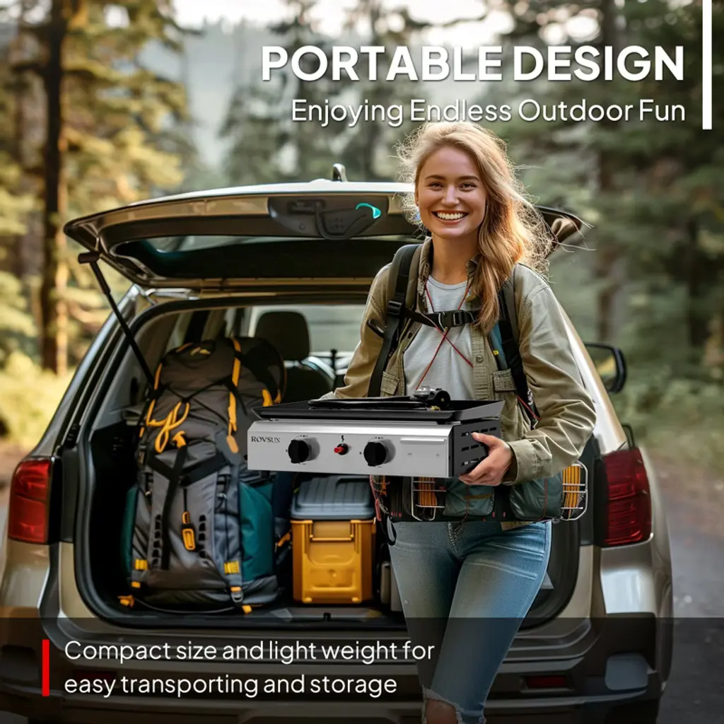 Rovsun 2 Burner Portable Propane Griddle, 20,000 Btu Tabletop Flat Top Gas Grill With Ignition & Regulator For Outdoor Camping Bbq Picnicking