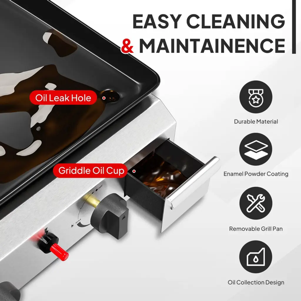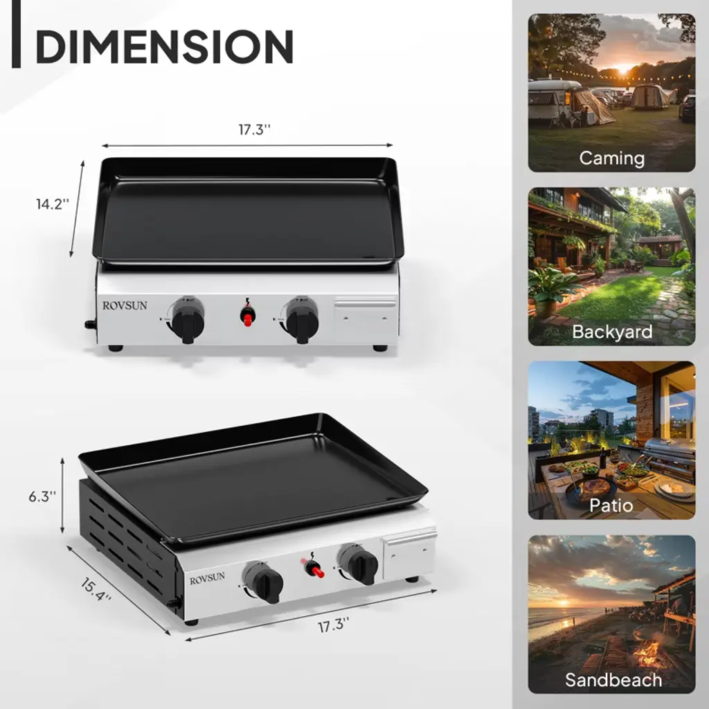 ROVSUN High-quality Porpane Griddle, a perfect companion for all your culinary adventures. Equipped with two independent stainless steel burners, it delivers a powerful combined heat of up to 20,000 BTUs. The flame is adjustable, catering to diverse cooking needs. Crafted from robust stainless steel and iron, it promises durability and lasting performance. It features an oil drip tray for easy cleaning post-use and a user-friendly hose and valve connection design, saving you time and money. With a generous cooking area of 246 square inches, including a 17.3'' × 14.2'' cooking zone, it offers ample space for grilling enthusiasts. Our tabletop griddle is easy to install with no additional tools required and compact for easy mobility. Whether you're planning outdoor grilling, camping, picnicking, or boating, our griddle is your go-to choice. Feature: 20,000 BTU grill heat quickly and evenly Piezo ignition design for simple lightening up Dual control knobs for easy temperature control Stainless-steel countertop and metal frame for long-term use Smooth enameled surface with oil drip collector for easy cleaning Suitable for camping, traveling, picnic, BBQ, patio, backyard party, etc Specification Color: Black & Red Material: Metal+ Stainless Steel Overall Dimensions: 17.3'' x 15.4'' x 6.3'' (L x W x H) Grilling Surface: 17.3'' x14.2 ''(L x W) BTU of Cooking Burner : 2 x 10,000 Fuel Type: Propane Fuel: standard 20 lb propane tank(not included) Weight: 16.5 lbs Ignition Type: Piezo Package includes: 1 x Propane Griddle 1 x Regulator 1 x Instruction