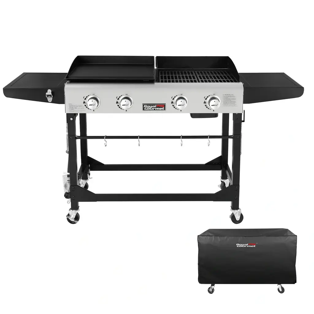 Royal Gourmet 4-Burner Portable Flat Top Gas Grill And Griddle Combo With Folding Legs, With Cover,black & Silver - Black - Propane Gas