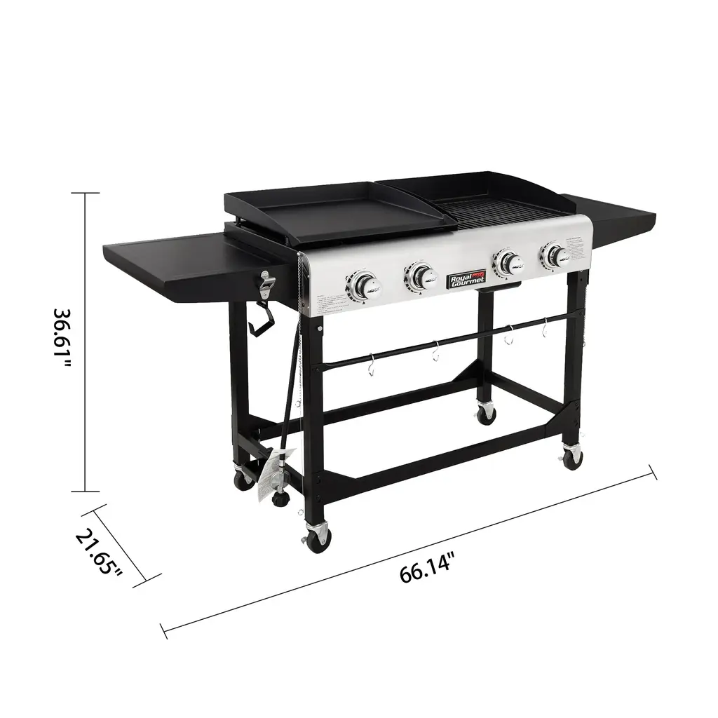 Product Features: 1.Combo Design: Equipped with two individual cooking zones - flat top gas grill and griddle, each cooking space measures 292 sq. in. and 314 sq. in. respectively which offers sufficient grilling capacity.2.Cooking Versatility: Two separate cooking zones provide different surfaces where you can cook eggs, pancakes or French toast on the griddle and grill steaks or veggies on the ribbed gas grill. 3.High Performance: 4 independently controlled stainless steel burners deliver a total of 48,000 BTU (12,000 BTU each) of heat evenly with high-to-low heat control.4.Portable Design: With four folding legs, it's more convenient to put it into your car trunk for outdoor cooking like camping, tailgating and more. Easy to assemble with only a few steps. 5.Easy Cleanup: A large size grease tray and grease cup facilitate easy cleanup to collect excess grease and residues. They can be removed to dump and thus to reduce the risk of flare-ups. 6. Made of heavy-duty fabric, the cover protects your grill from elements and withstands the harshest weather. Specifications /Dimensions (All)·Color: Black & Silver ·Material: Steel; Ceramic coated steel flat top;Porcelain-enameled cast iron cooking grates·Product size: 66.14''L x 21.65''W x 36.61''H ·Package size: 41.34" L x 24.02" W x 14.76"H·Cooking area: 18.90" L x 16.61" W(griddle space), 17.60" L x 16.61" W(grill space)·Net weight: 87.5 lb. ·Gross weight: 99.4 lb. ·Recommended grill cover: Royal Gourmet 40843776