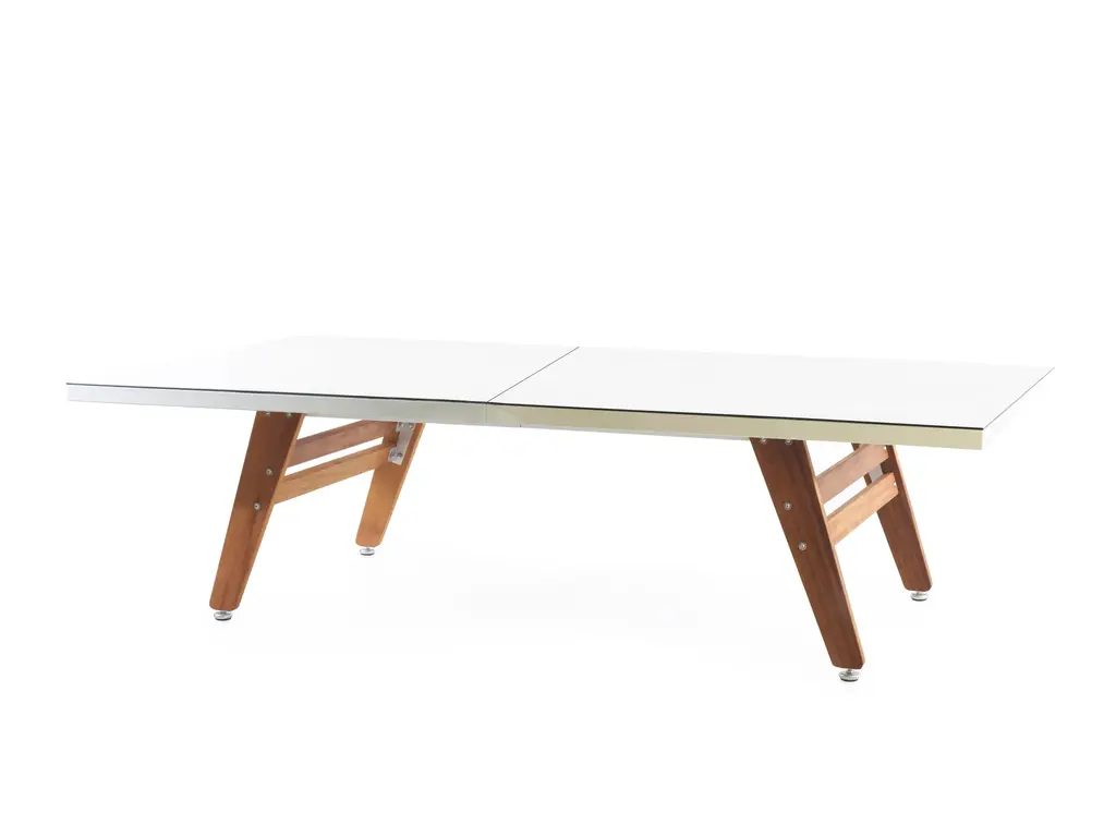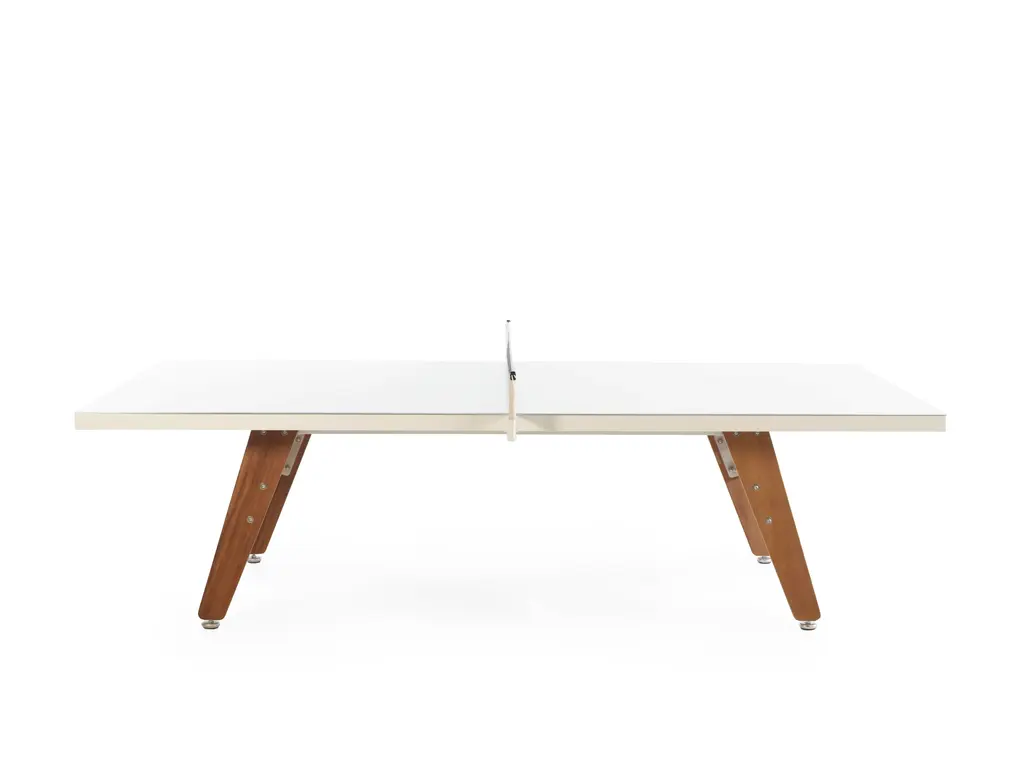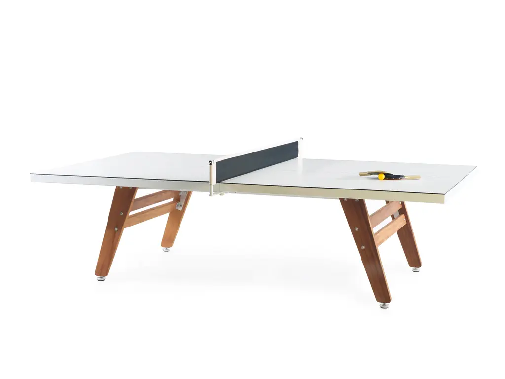 RS Stationary Ping Pong table with white HPL top and iroko wood legs is the pong pong complement to our RS#3 Wood foosball tables. This is a full, regulation sized ping pong table suitable for indoor or outdoor use designed with a structure that offers full playability and stability.