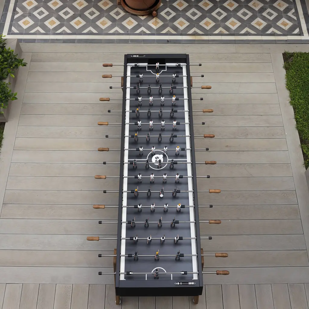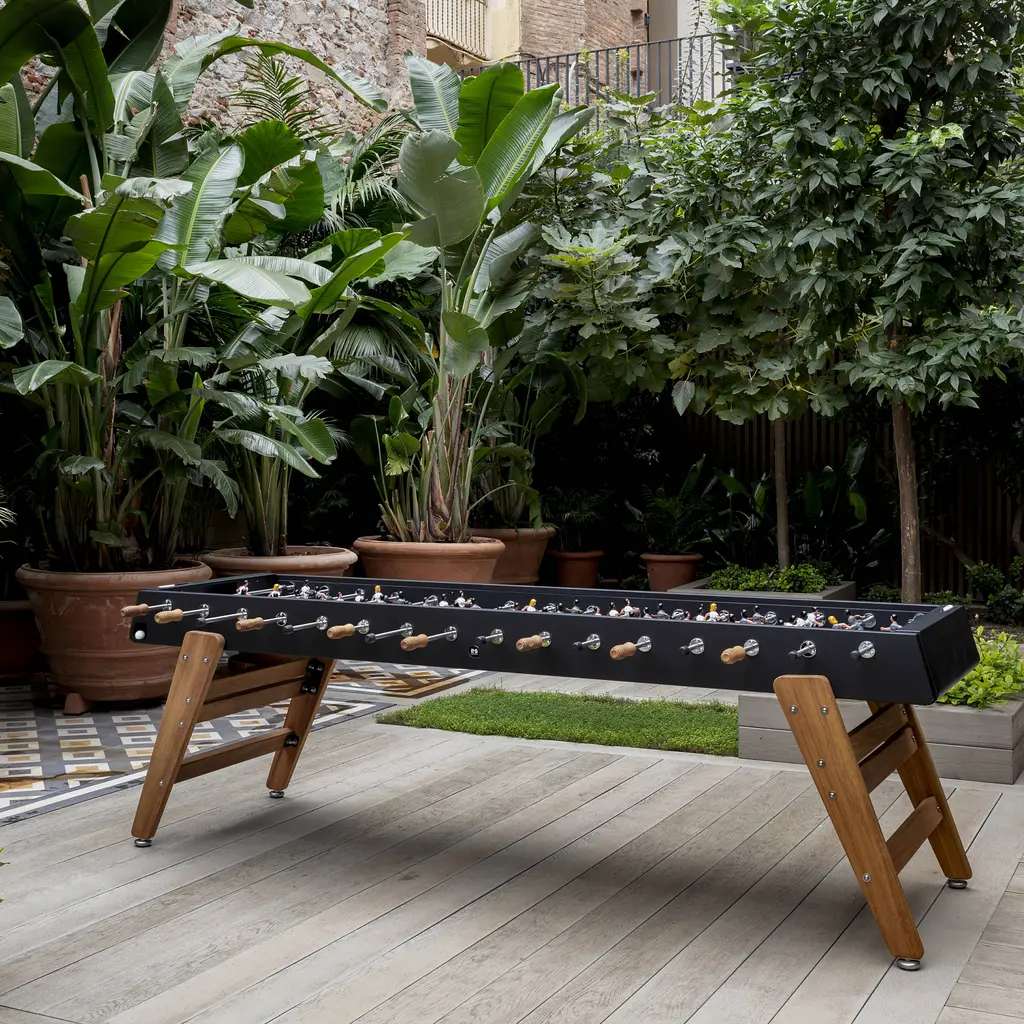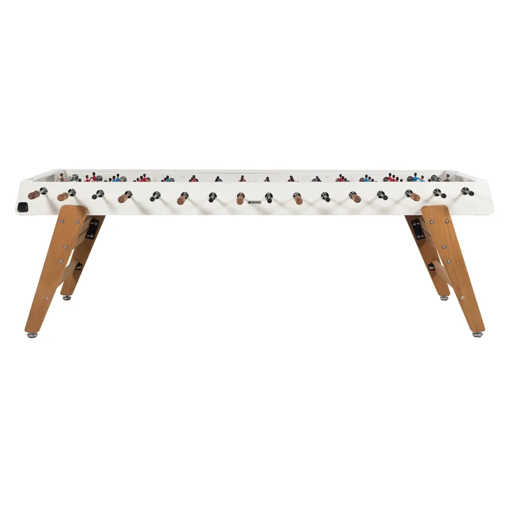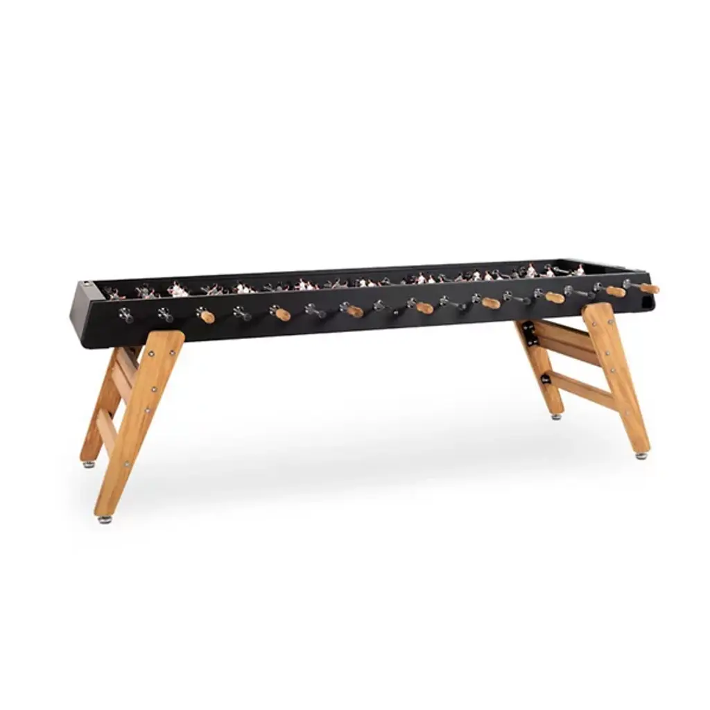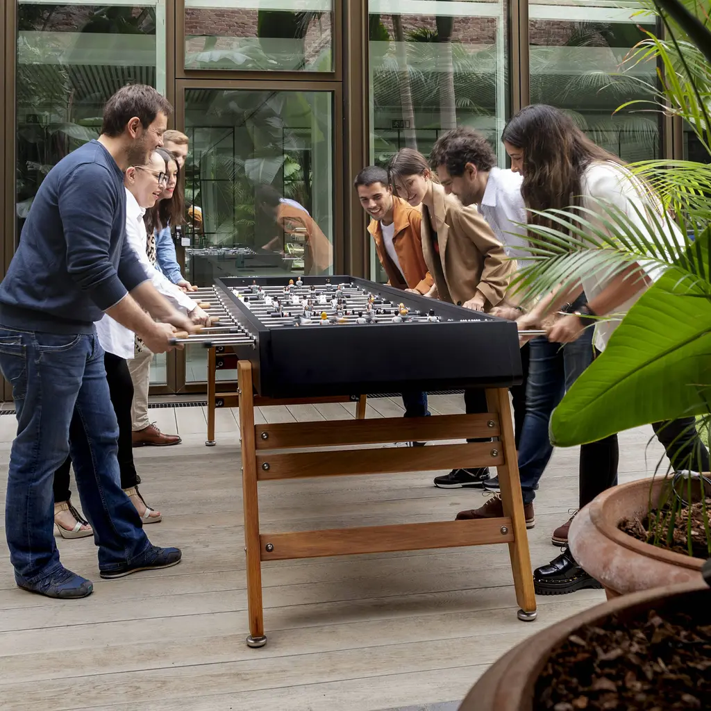 Go big or go home, they say, and designer Rafael Rodriguez concours with RS Max. The longer brother of RS#3 Wood, it’s been stretched out and resized to double the fun, for 8 players instead of 4. Ideal for communal spaces and group settings, Max is available in white, black or green colorways and is rated for both indoor and outside use. With its cataphoretic coating process and polyester paint finish, the steel table stands up to gung-ho gameplay and the Iroko wood legs and handle add finesse. Players are rendered in cast aluminum (set includes 5 standard and 2 silent balls and 4 extra players, 2 per team; customized players available).