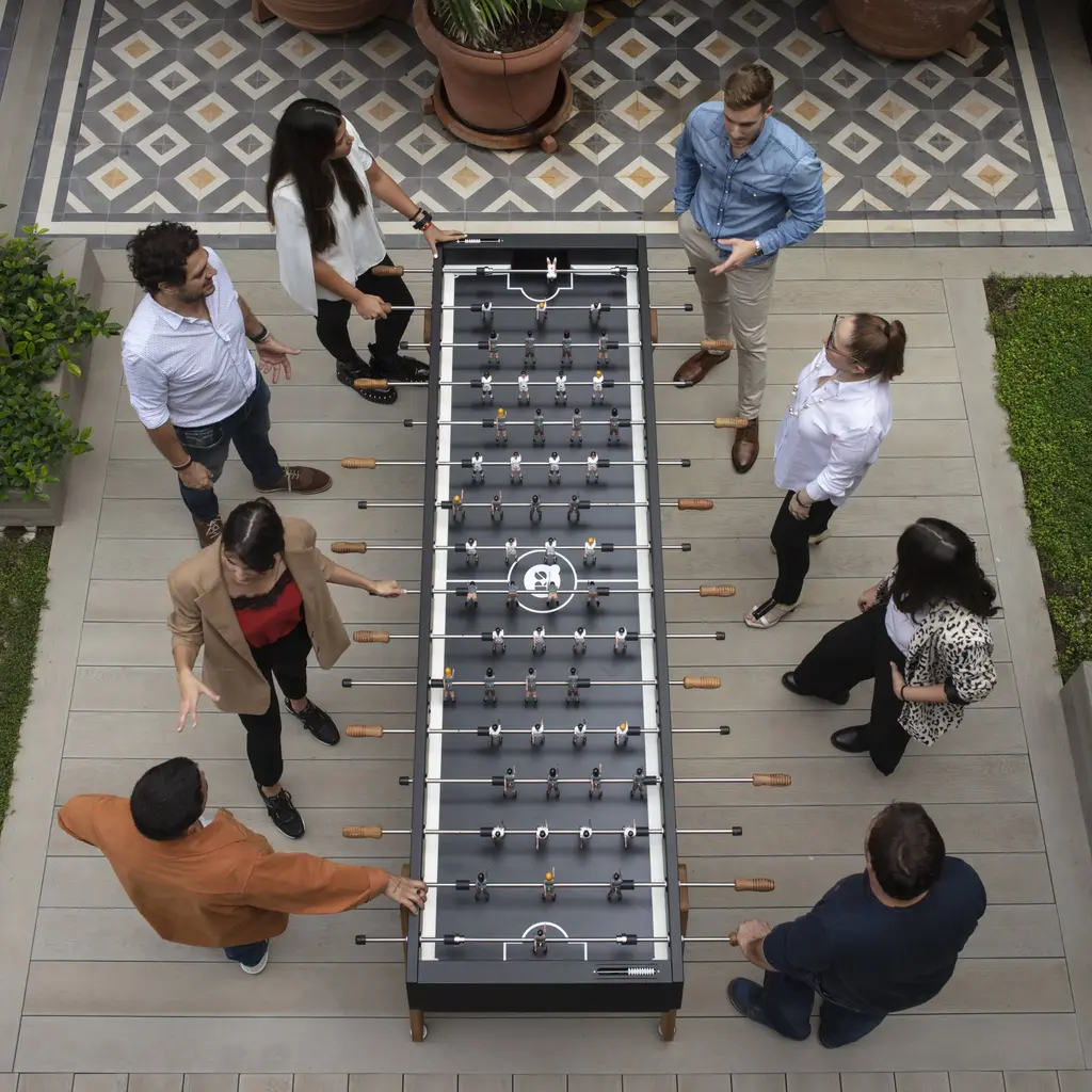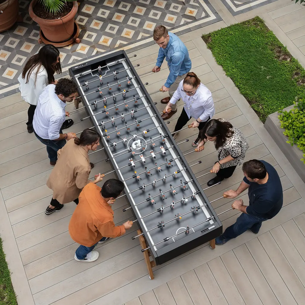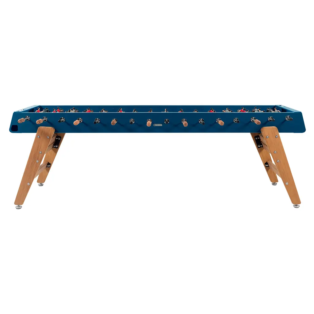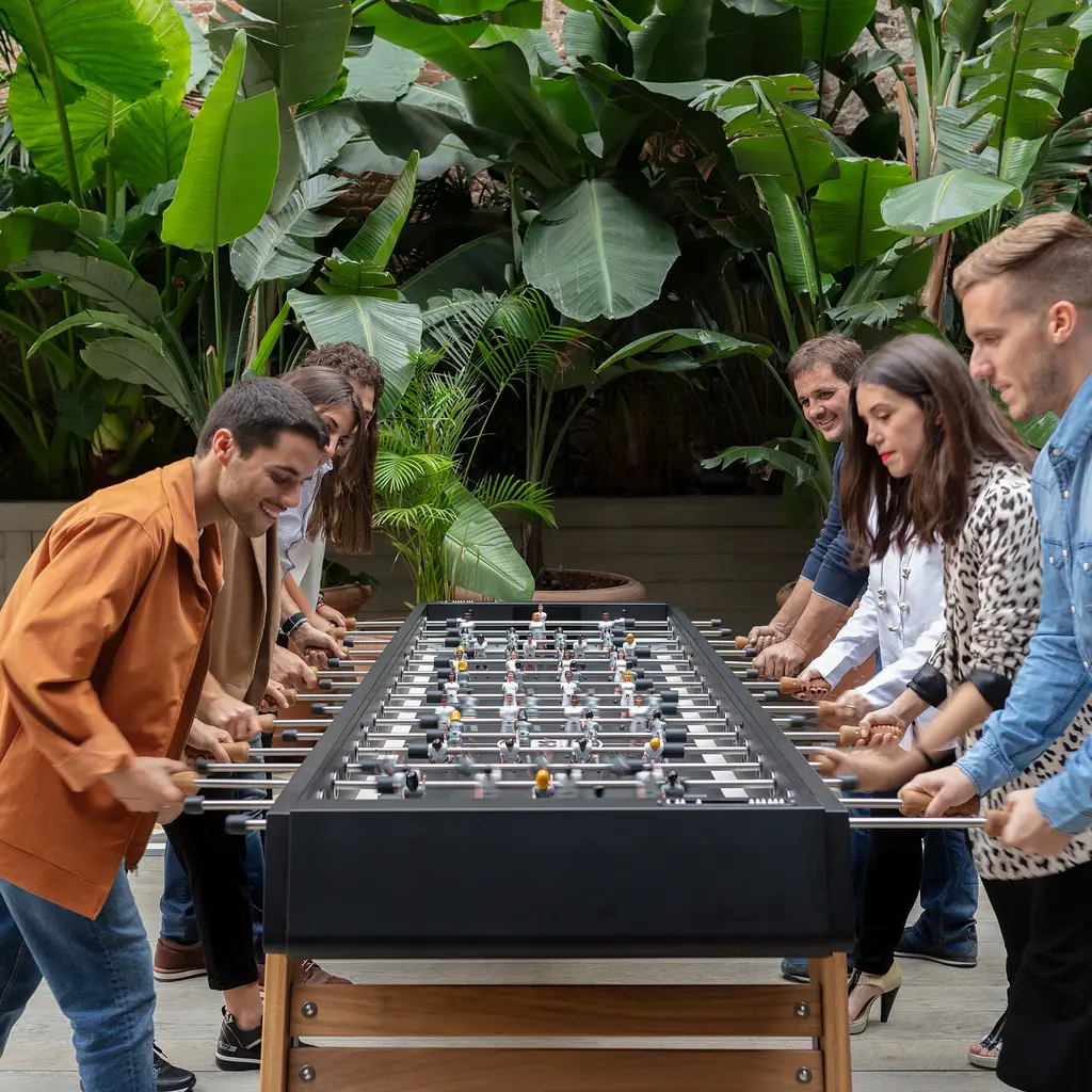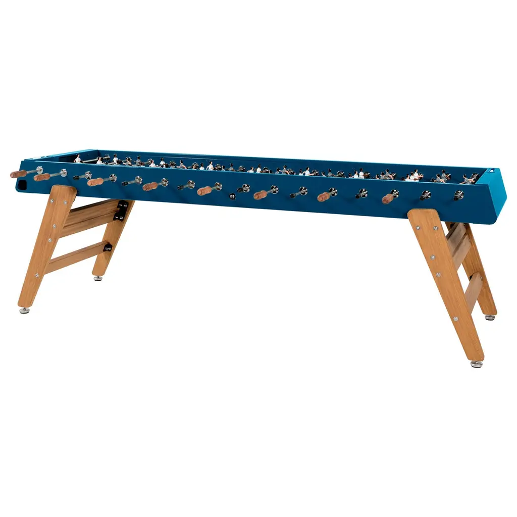 Go big or go home, they say, and designer Rafael Rodriguez concours with RS Max. The longer brother of RS#3 Wood, it’s been stretched out and resized to double the fun, for 8 players instead of 4. Ideal for communal spaces and group settings, Max is available in white, black or green colorways and is rated for both indoor and outside use. With its cataphoretic coating process and polyester paint finish, the steel table stands up to gung-ho gameplay and the Iroko wood legs and handle add finesse. Players are rendered in cast aluminum (set includes 5 standard and 2 silent balls and 4 extra players, 2 per team; customized players available).