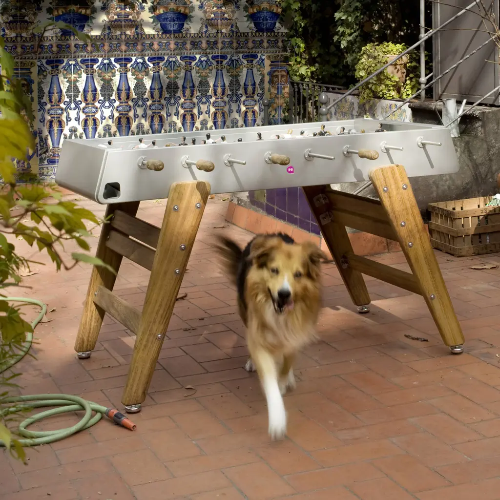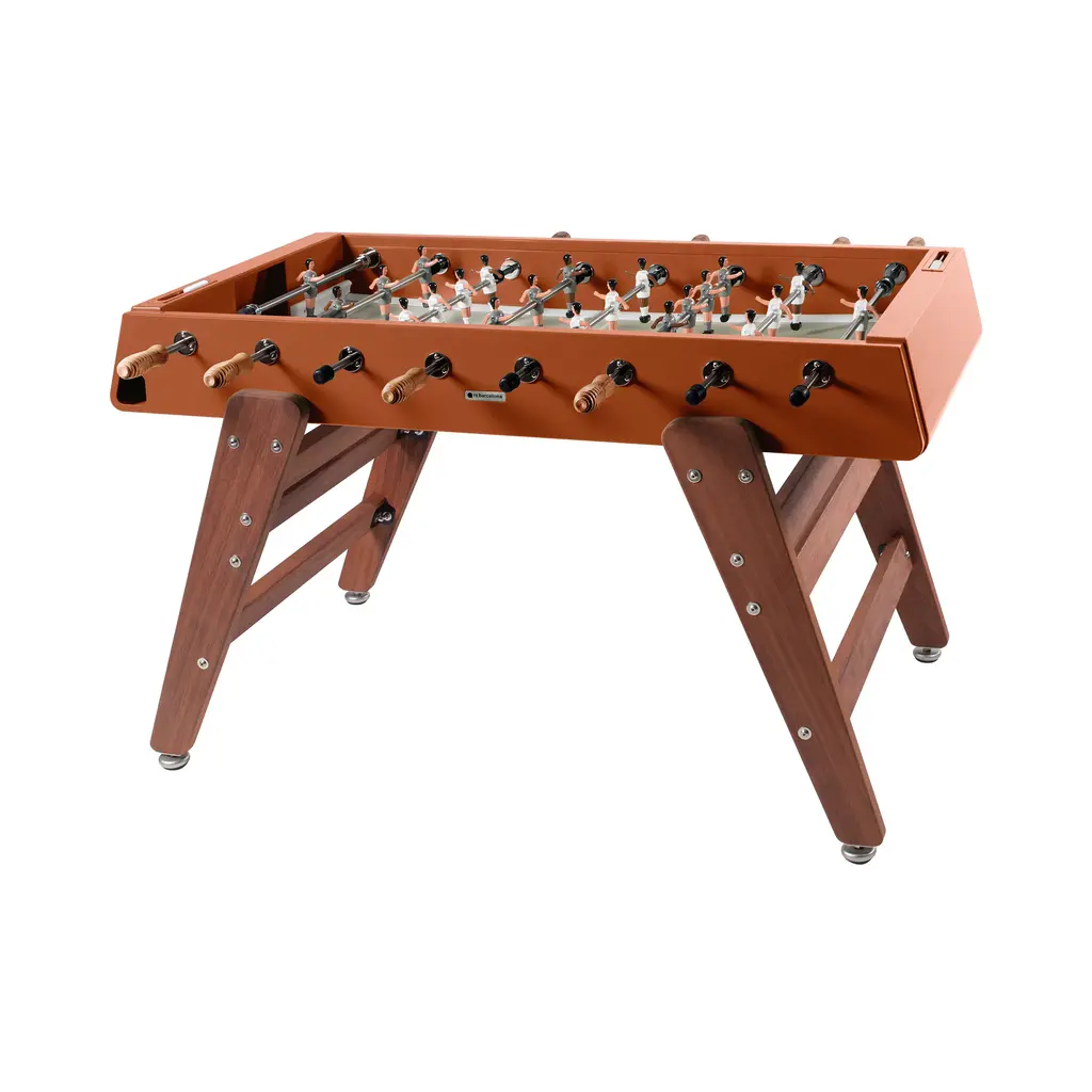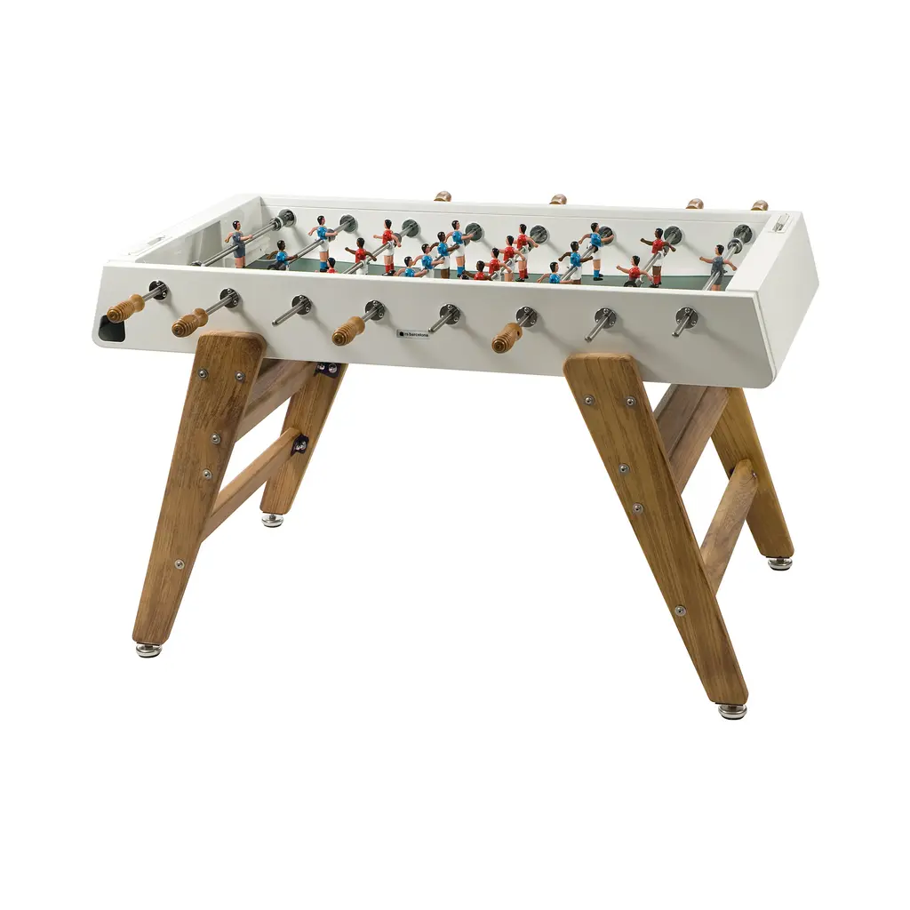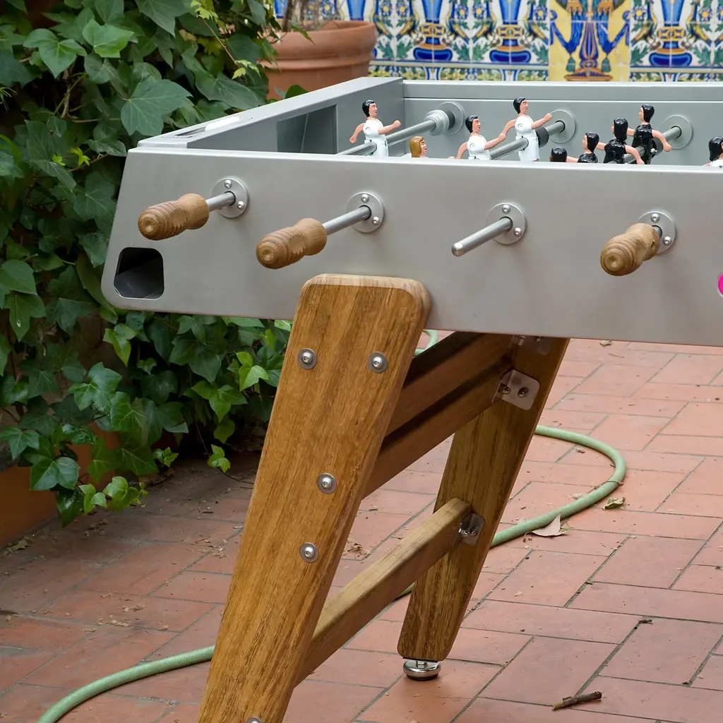 With the RS#3 Wood Foosball Table, soccer-heads can get their kicks between matches in unrivaled high style. Made in Spain, this version of RS Barcelona's lauded RS#3 adds richly grained iroko wood legs, for a luxury upgrade. Yet the wood is weather resistant, just like the steel tabletop (with no plastic parts to wear out) that's treated with a cataphoresis coating for greater durability. Everything stays shiny and new, indoors or out. So whether pride of place is an outdoor patio or an indoor game room, the RS#3 Wood is more than equal to its surroundings. And the tabletop includes 22 players—11 per team—and a precisely lined playing surface. Score!