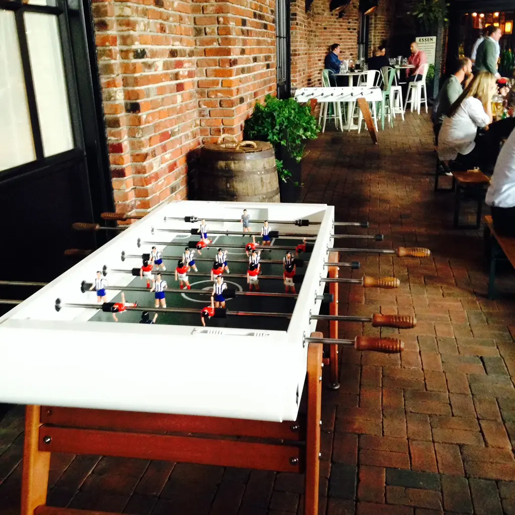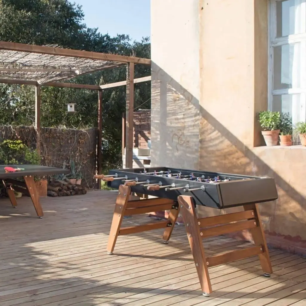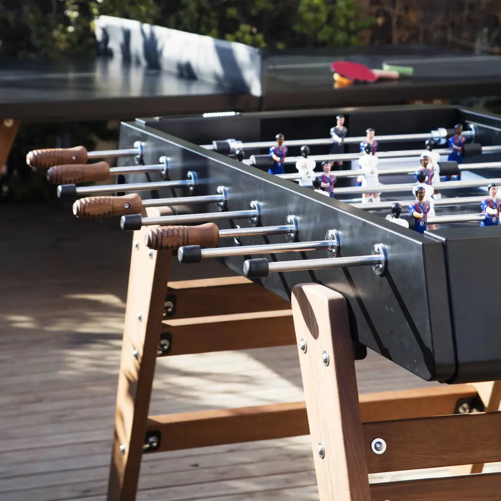 With the RS#3 Wood Foosball Table, soccer-heads can get their kicks between matches in unrivaled high style. Made in Spain, this version of RS Barcelona's lauded RS#3 adds richly grained iroko wood legs, for a luxury upgrade. Yet the wood is weather resistant, just like the steel tabletop (with no plastic parts to wear out) that's treated with a cataphoresis coating for greater durability. Everything stays shiny and new, indoors or out. So whether pride of place is an outdoor patio or an indoor game room, the RS#3 Wood is more than equal to its surroundings. And the tabletop includes 22 players—11 per team—and a precisely lined playing surface. Score!