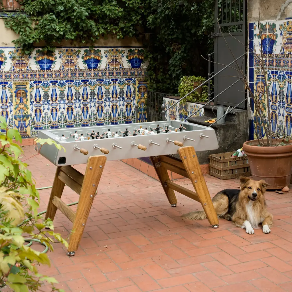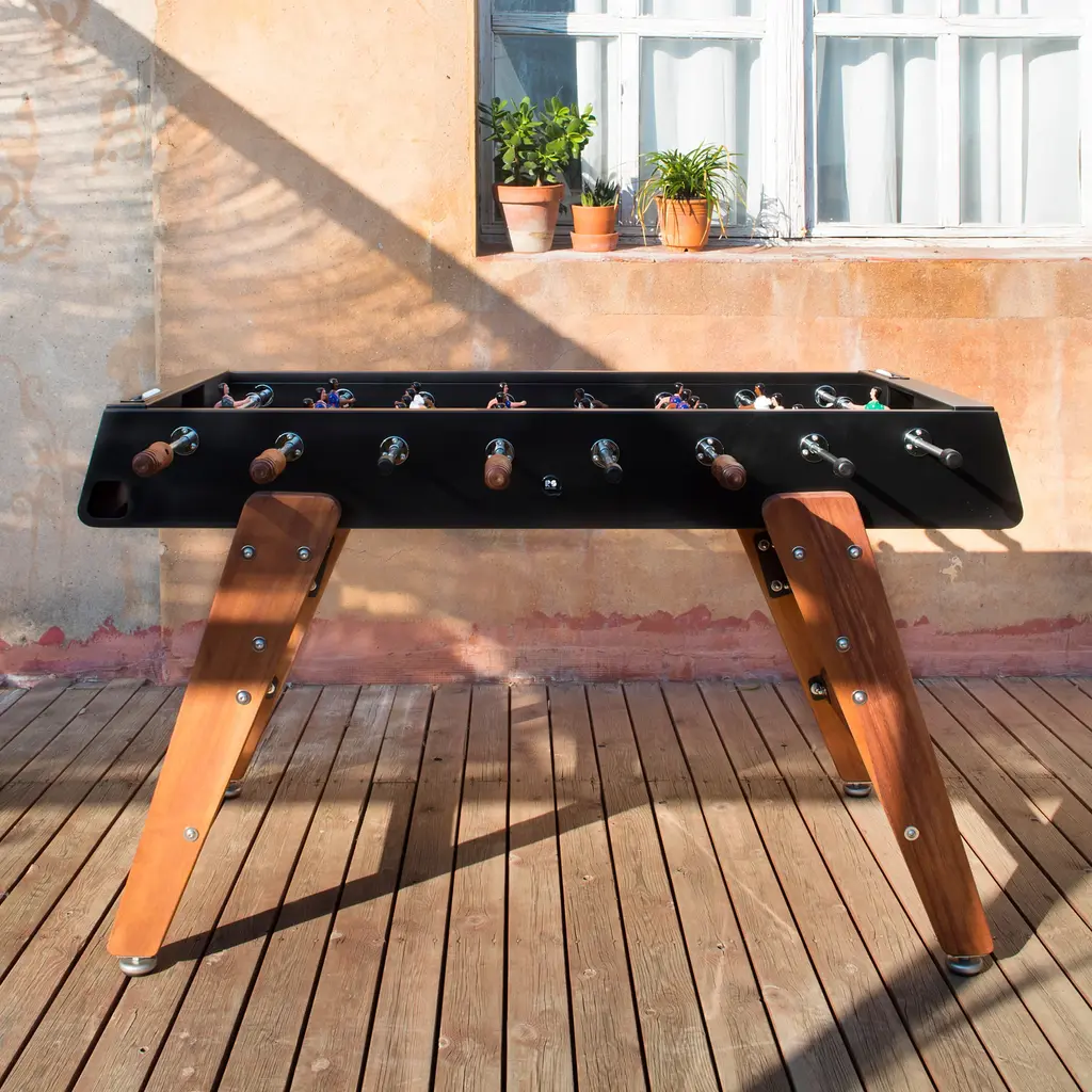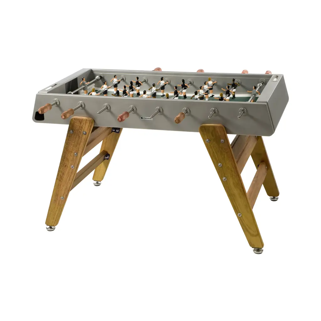 With the RS#3 Wood Foosball Table, soccer-heads can get their kicks between matches in unrivaled high style. Made in Spain, this version of RS Barcelona's lauded RS#3 adds richly grained iroko wood legs, for a luxury upgrade. Yet the wood is weather resistant, just like the steel tabletop (with no plastic parts to wear out) that's treated with a cataphoresis coating for greater durability. Everything stays shiny and new, indoors or out. So whether pride of place is an outdoor patio or an indoor game room, the RS#3 Wood is more than equal to its surroundings. And the tabletop includes 22 players—11 per team—and a precisely lined playing surface. Score!