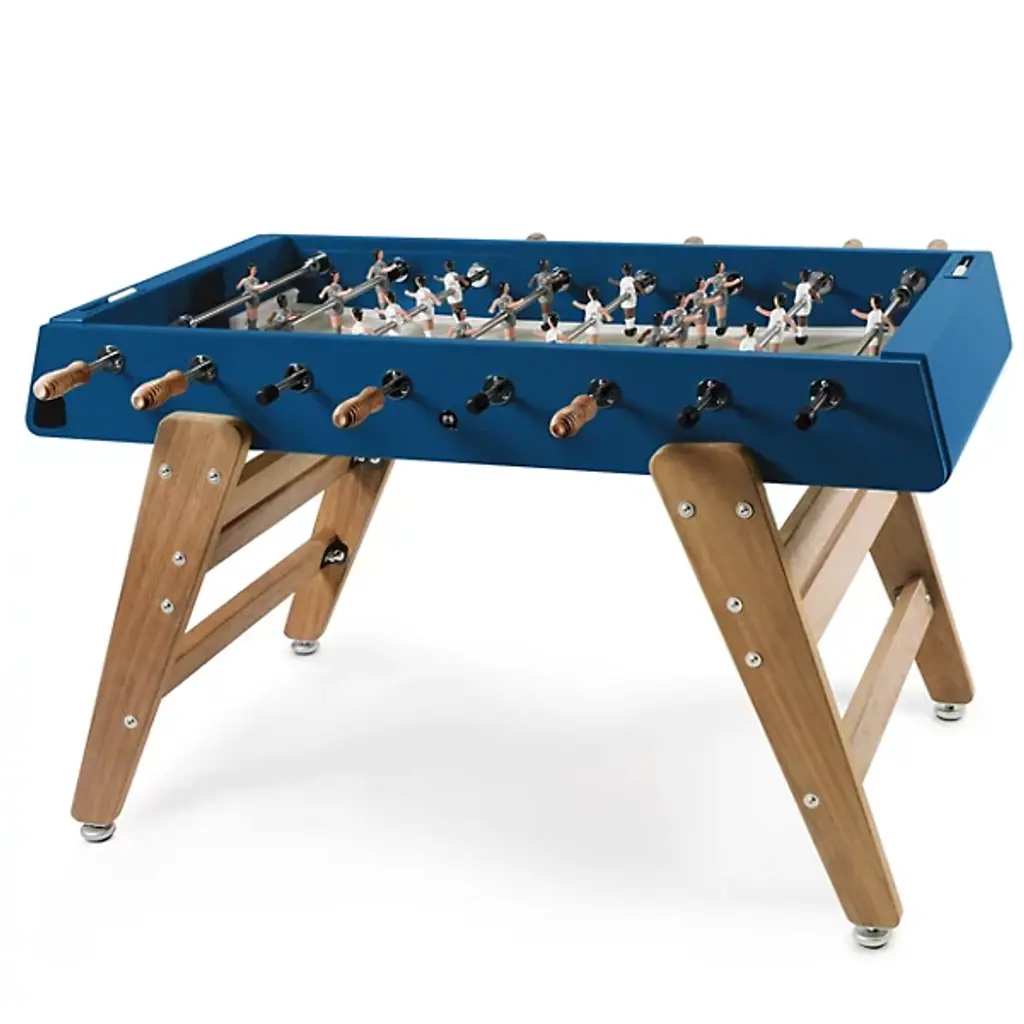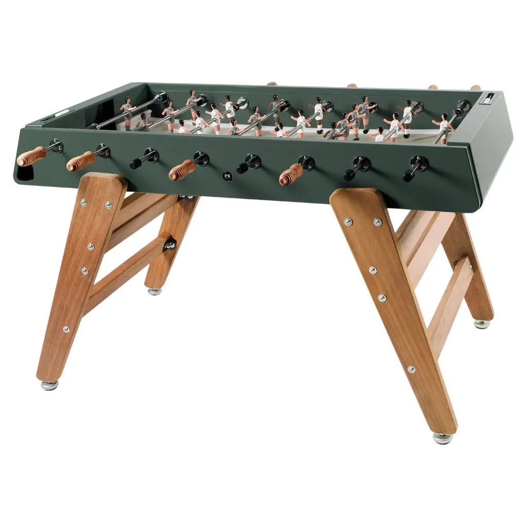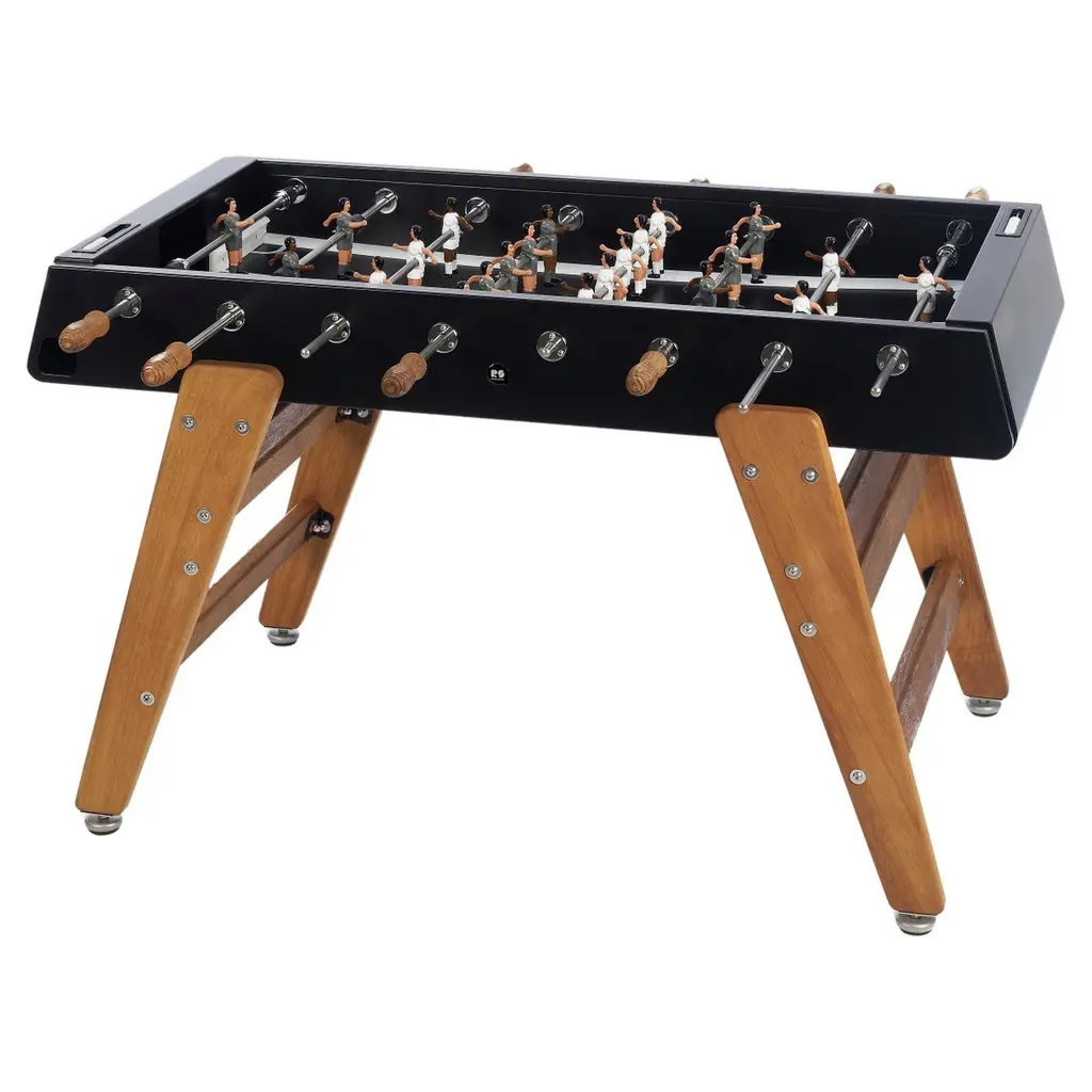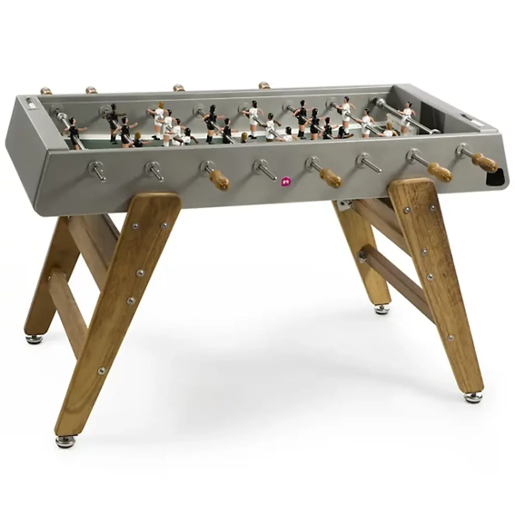 Gooooooaaaaalllll! The RS Barcelona RS3 Wood Football Table brings a little interactive soccer action to your home...as well as fine craftsmanship. This table is made out of polyester painted steel, with an HPL field surface and Iroko wood legs; all are elements that will endure use outdoors as well as in. The same goes for the colorful cast aluminum players.