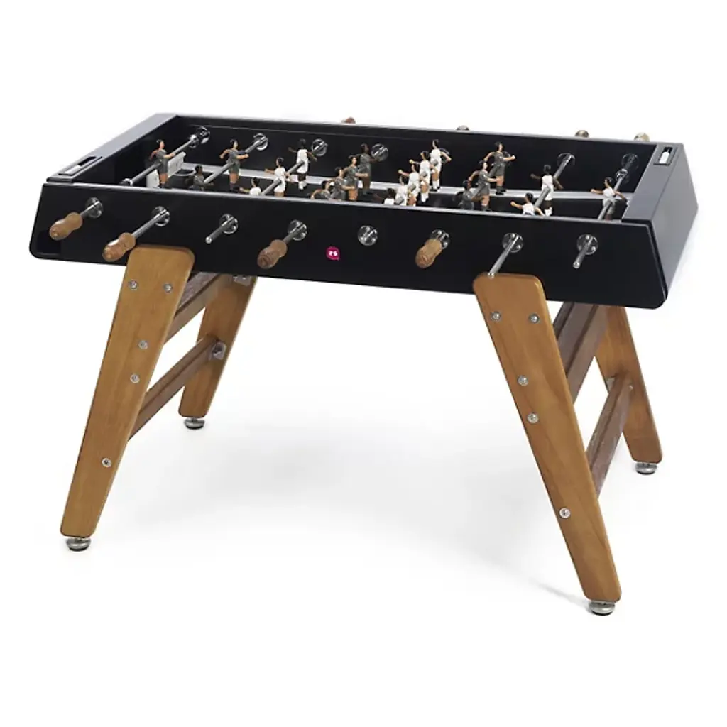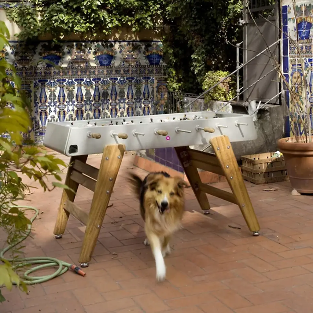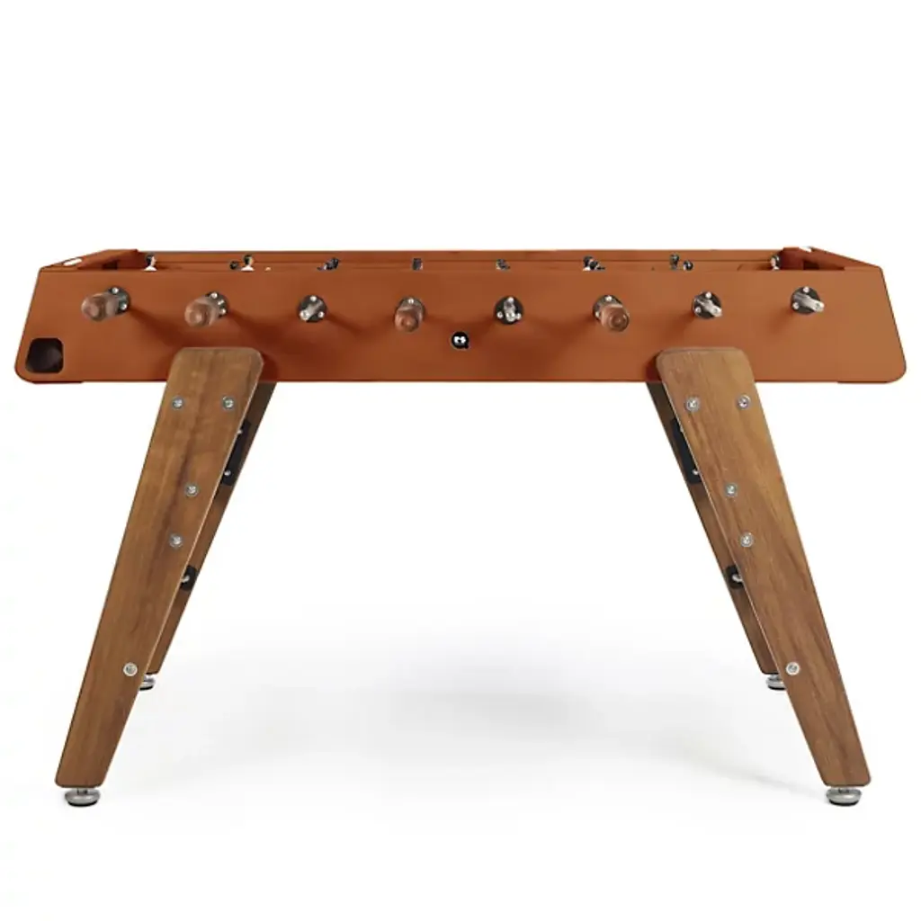 Gooooooaaaaalllll! The RS Barcelona RS3 Wood Football Table brings a little interactive soccer action to your home...as well as fine craftsmanship. This table is made out of polyester painted steel, with an HPL field surface and Iroko wood legs; all are elements that will endure use outdoors as well as in. The same goes for the colorful cast aluminum players.