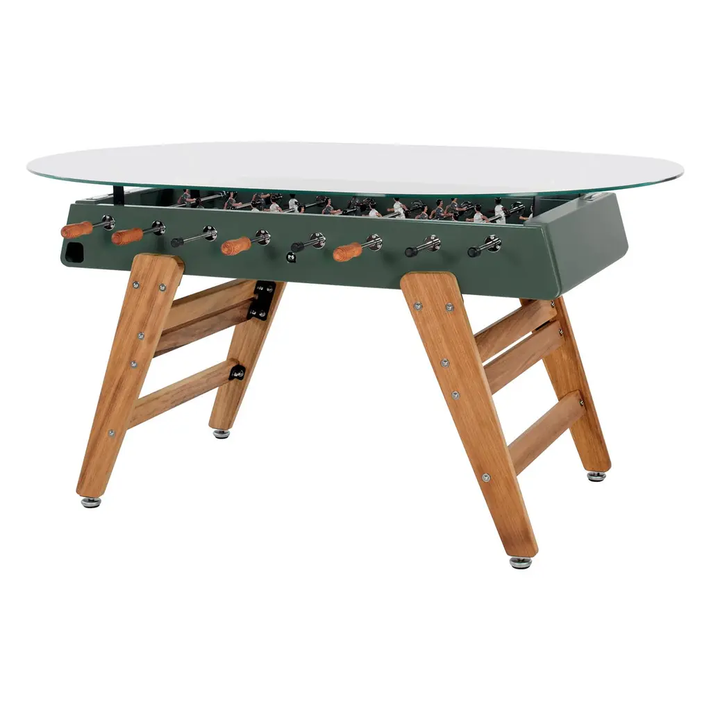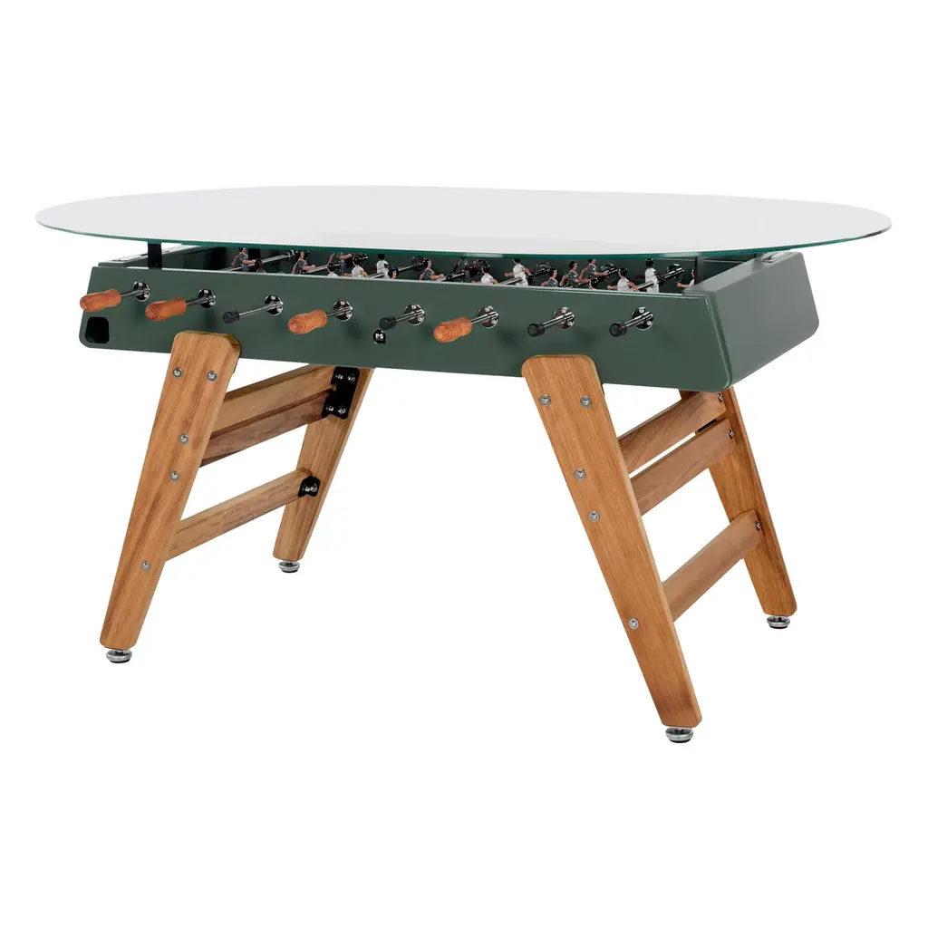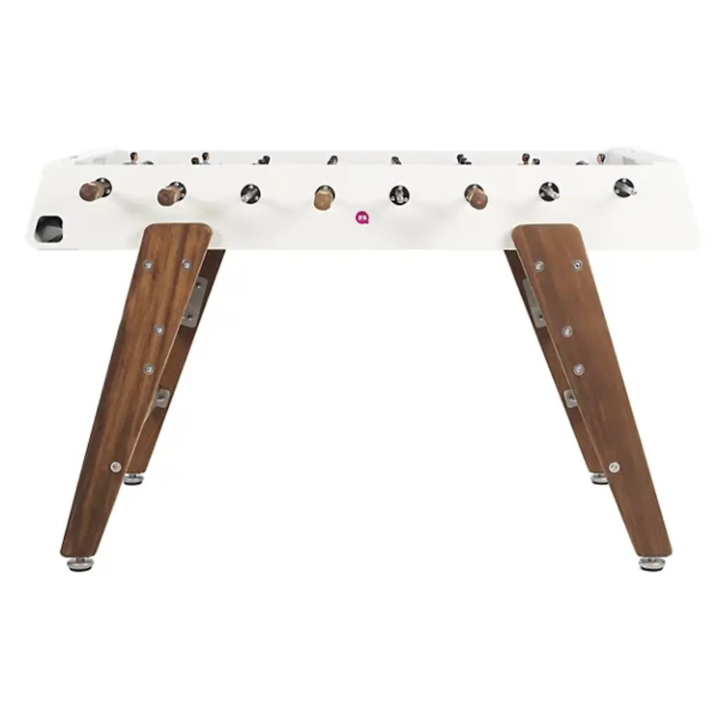 Gooooooaaaaalllll! The RS Barcelona RS3 Wood Football Table brings a little interactive soccer action to your home...as well as fine craftsmanship. This table is made out of polyester painted steel, with an HPL field surface and Iroko wood legs; all are elements that will endure use outdoors as well as in. The same goes for the colorful cast aluminum players.