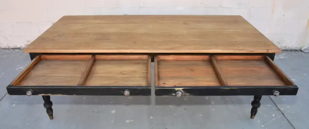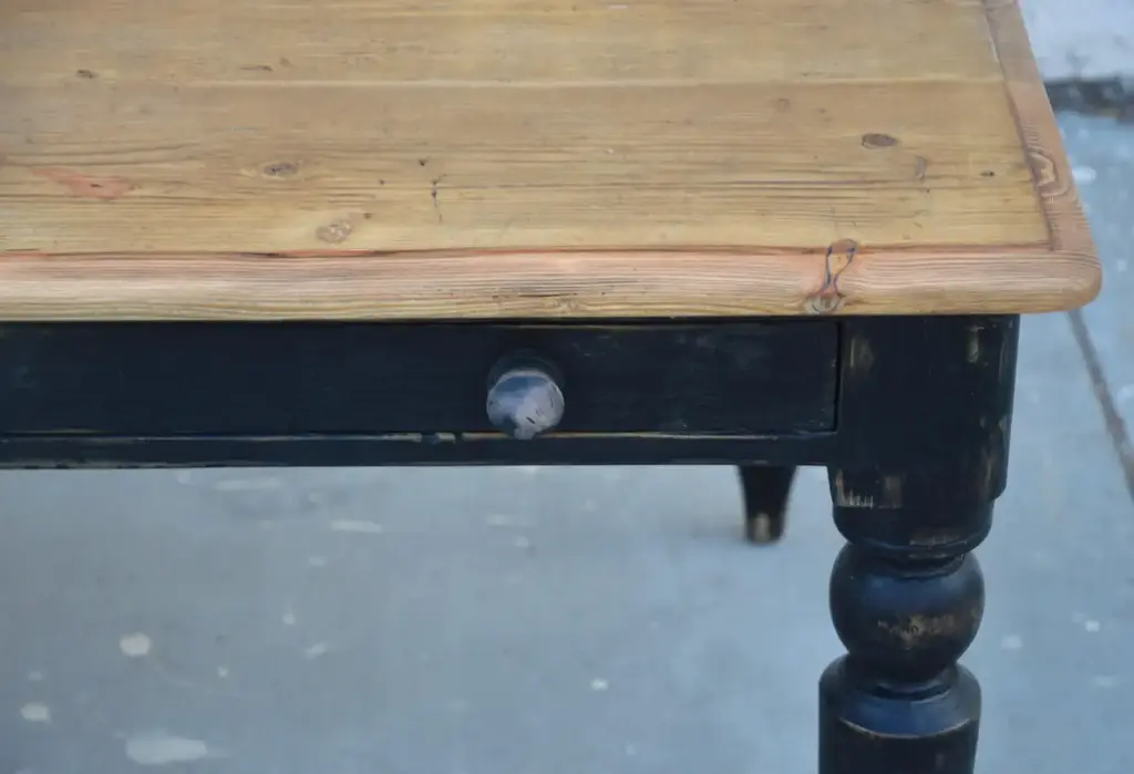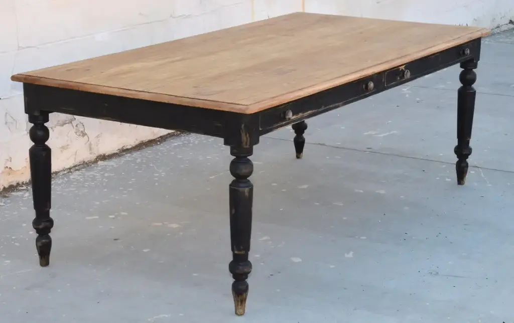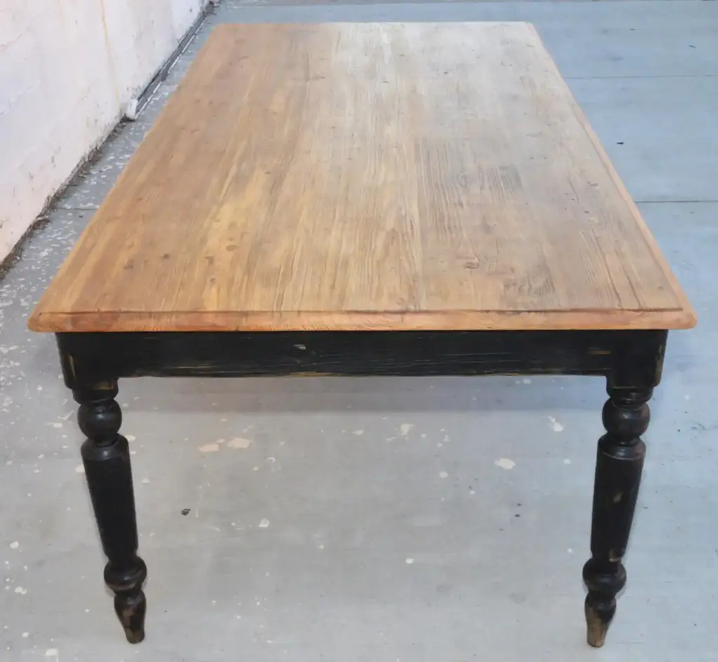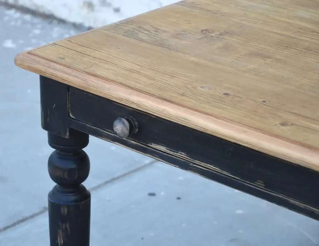 This farmhouse table is made from reclaimed pine with a painted base, turned legs and two large drawers which can be pulled out from either side. Seen here in 110" x 42" x 30", We use only traditional carpentry techniques, no nails or metal fasteners of any kind. Just mortise and tenon construction reinforced with handcut wooden dowels.