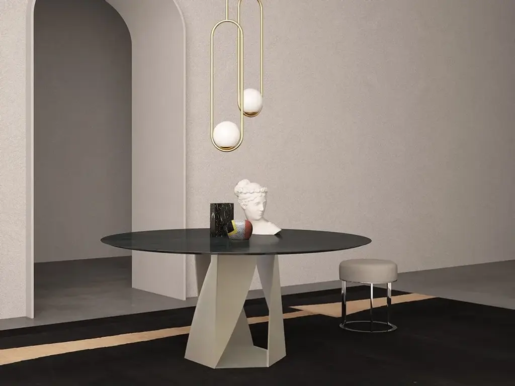 StructureRound or oval tables with an S-shaped twisted base, moulded in:Cristalplant®, a composite material made up of natural minerals and polyester and acrylic polymers in matt white; Ceramilux®, a material composed of natural minerals and polyester resin, lacquered gloss black.Not available in Ø126 cm;Reconstructed stone is obtained from a blend of mineral powders that have been micronized and mixed with liquid acrylic and water-based products, giving it a material essence. The finishes are applied manually with a palette knife over the entire surface of the table, creating a one-of-a-kind texture that characterises each and every product, both to the eye and to the touch. After application, a maturation process at room temperature is required; the material is subsequently protected with a water-based nanotechnological finish that makes the table sturdy and easy to clean.Finishes: Reconstructed stone white calce and black slate.Tops for the white base• Clear or extra clear glass, 15 mm thickness;• Clear or extra clear tempered glass, 15 mm thickness;• Matt lacquered white MD wood finish, thickness 30mm;• Matt white Cristalplant®;• Matt or gloss Namibia white marble, matt or gloss Carrara white marble and matt or gloss Bardiglio medium grey marble. Thickness 20 mm and top support 16mm;• Reconstructed stone white calce. Tops for the black base• Tempered smoked grey glass*, 12 mm thickness;• Sahara matt black marble, thickness 20 mm and top support 16mm;• Reconstructed stone black slate.*Not available in Ø126 cm.DimensionsWith tables with tops in Ø140, Ø156 and Ø175 cm and oval top in size 150x210 cm, the base has maximum overall dimensions of 78 cm. With the round table with top in Ø126 cm the base has maximum overall dimensions of 57.5 cm. Height:• H73 cm with top in lacquered wood, resin or reconstructed marble;• H71 cm with glass top;• H74 cm with reconstructed stone top.