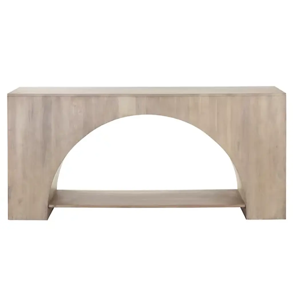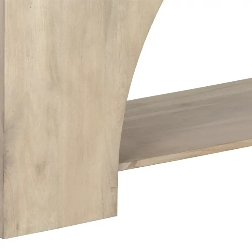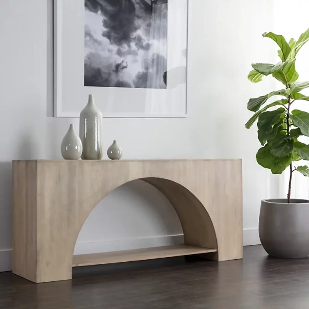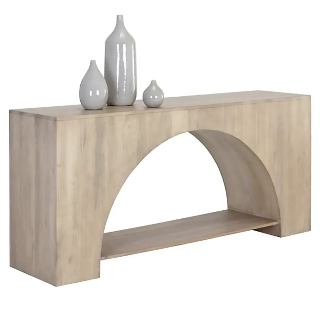 The Salma Console Table from Sunpan showcases a captivating arch design that embodies the elegance of simplicity. Expertly crafted from solid light acacia wood with a subtle whitewash finish, it gives any space a natural, airy charm. The organic qualities of the wood ensure each piece is unique, with variations in texture, color, and grain, along with charming knots, burls, and fine indentations that add character and depth to its timeless appeal.