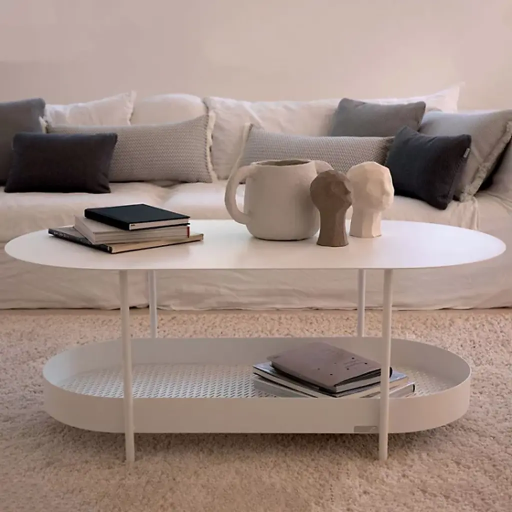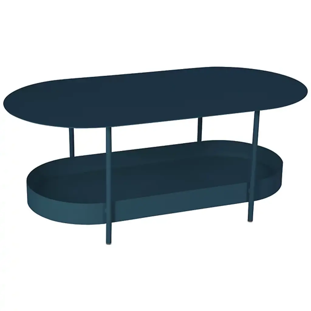 The ideal way to spice up an indoor or outdoor lounge area. As designed by Gould & Figuera, the Salsa Oval Low Table by Fermob has a pleasingly graphic and balanced look that makes it the ideal centerpiece for sophisticated modern spaces. Supported by a tubular steel frame, this table has a large, solid steel sheet oval top suspended over a smaller steel sheet shelf. Perforations across the surface of the shelf are both visually appealing and help it to stay dry.