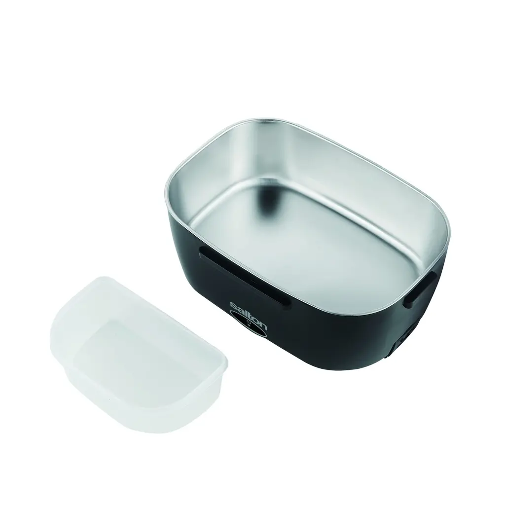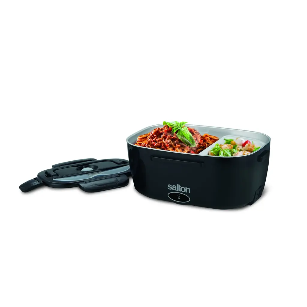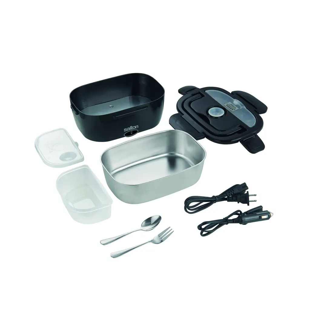 Welcome back to hot lunches with the Salton Portable Electric Lunchbox. Save money and time by taking your favourite meal to-go in this convenient and compact heated container. Warm up leftovers or your hot meal, hassle-free! Simply plug in the warming lunchbox and your meal will be warm in minutes. Included car adapter makes this container ideal for anyone on-the-go, working in a car, truck or in the office! Includes a stainless steel insert container, a plastic compartment container, one plastic outer container with snap-to-close lid and a utensil compartment, two charging cords for car and regular outlet use.
