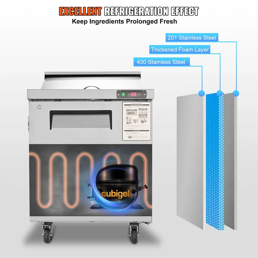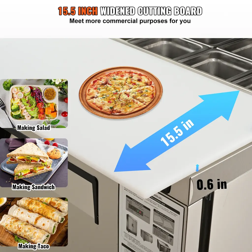 7.42 Cubic Feet Capacity: With a spacious 7.42 cubic feet capacity, this sandwich prep table is perfect for commercial kitchens, bars, and restaurants. It features a digital control that keeps the internal temperature between 35.6~46.4℉, and comes with adjustable shelves to achieve double-layer storage. The interior light is equipped for easy access to your items. Wide Working Table: Equipped with a detachable chopping board of 30.4 x 15.5 in, providing ample space for making sandwiches and 14-inch pizzas. This refrigerated prep table also includes hollow partitions with 6 1/6 pans and 2 1/9 pans made of high-quality 304 stainless steel, free of heavy metals and easy to clean. Fast Cooling: This sandwich fridge comes with cubigle compressor and finned copper tubes that ensure a constant and uniform temperature for long-lasting food preservation. With ETL Listed and ETL SANITATION Listed conforms to NSF std.7 certification, the cabinet door is filled with insulation foam layer, automatically closing within 75° opening angle without hand pushing, enhancing food preservation and energy saving. High-Quality Materials: Crafted from durable stainless steel, which is wear-resistant and not easy to corrode. This sandwich table boasts an electrophoretic process evaporator with rust-proof paint to avoid corrosion of solder joints and refrigerant leakage. It also has pre-installed anti-slip strip brake casters at the bottom that allow for easy movement and comes with a cleaning brush to keep your unit in top condition. Security Protection: Our food prep fridge is built-in overload protection that automatically shuts down the machine during abnormal use. The innovative insulated button design reduces the risk of electric shock while being user-friendly and accessible. Package Content 1 x Refrigerated Prep Table 1 x Cutting Board 6 x 1/6 304 Stainless Steel Pans 2 x 1/9 304 Stainless Steel Pans 1 x Layer Rack 1 x Key 1 x Cleaning Brush 1 x Instruction Manual 1 x Thermostat Manual