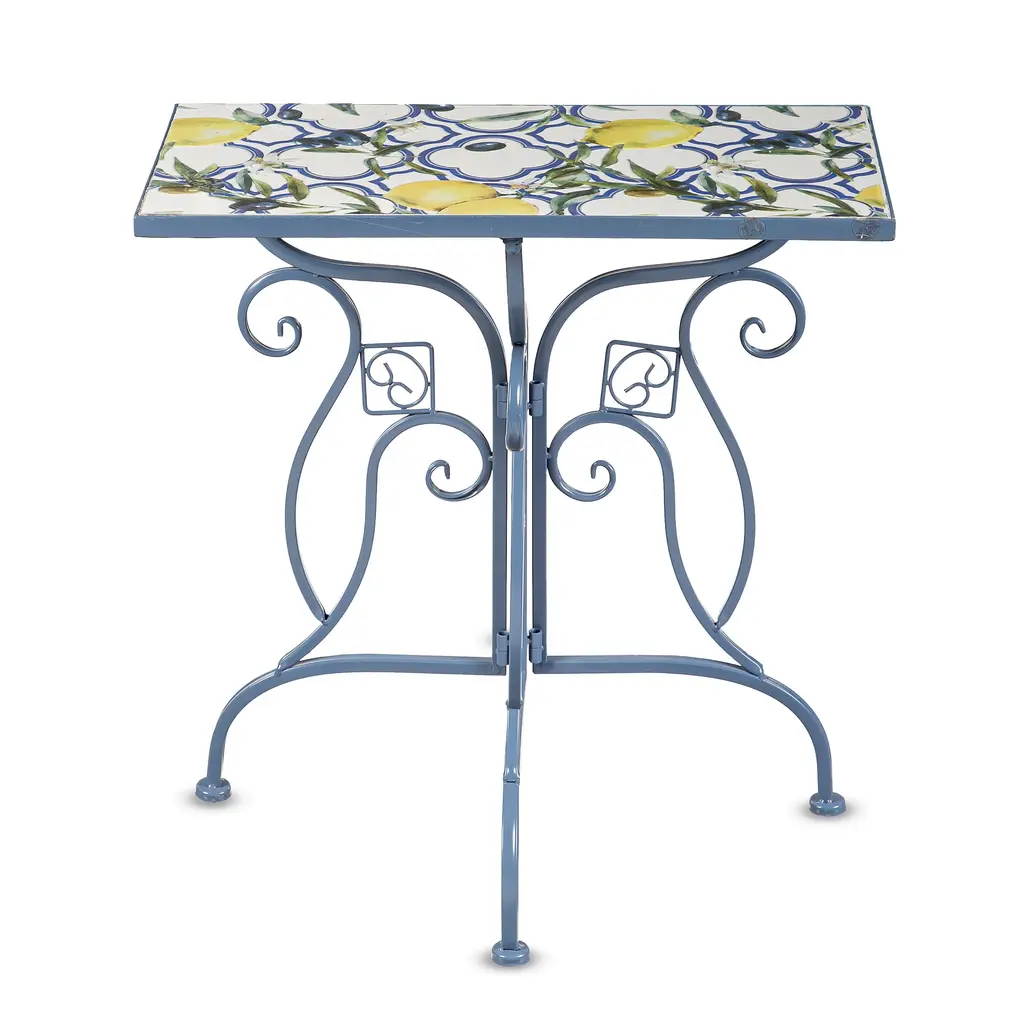 With gorgeous good looks and loads of versatility, this Santiago Mosaic Balcony Table gives you a convenient, attractive solution for any size space or gathering. Crafted of iron with a powder blue frame, this table is both sturdy and stylish. The tabletop features lemon mosaic design that give it a bright and cheerful look. It works well in any setting from patio and porch to deck, balcony and beyond. The table is made with versatility and ease of use in mind; perfect for any occasion.
