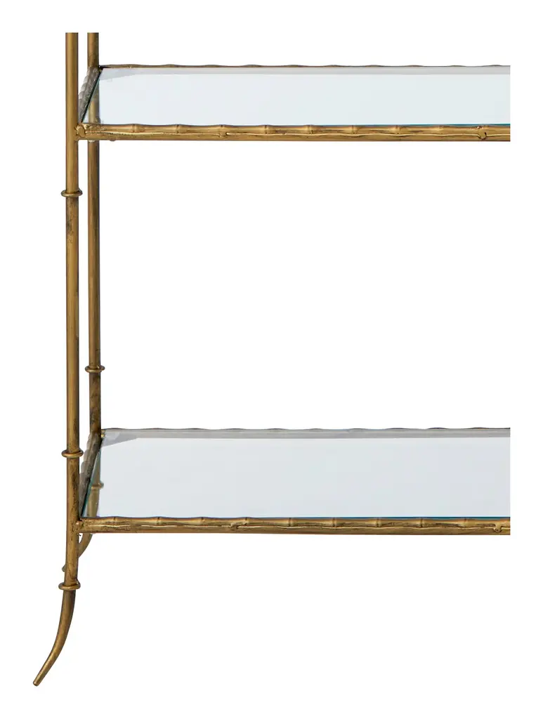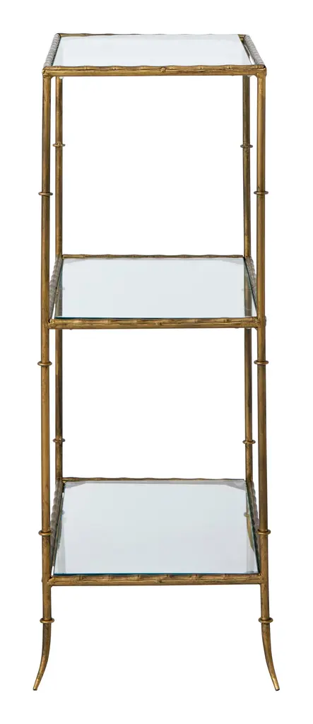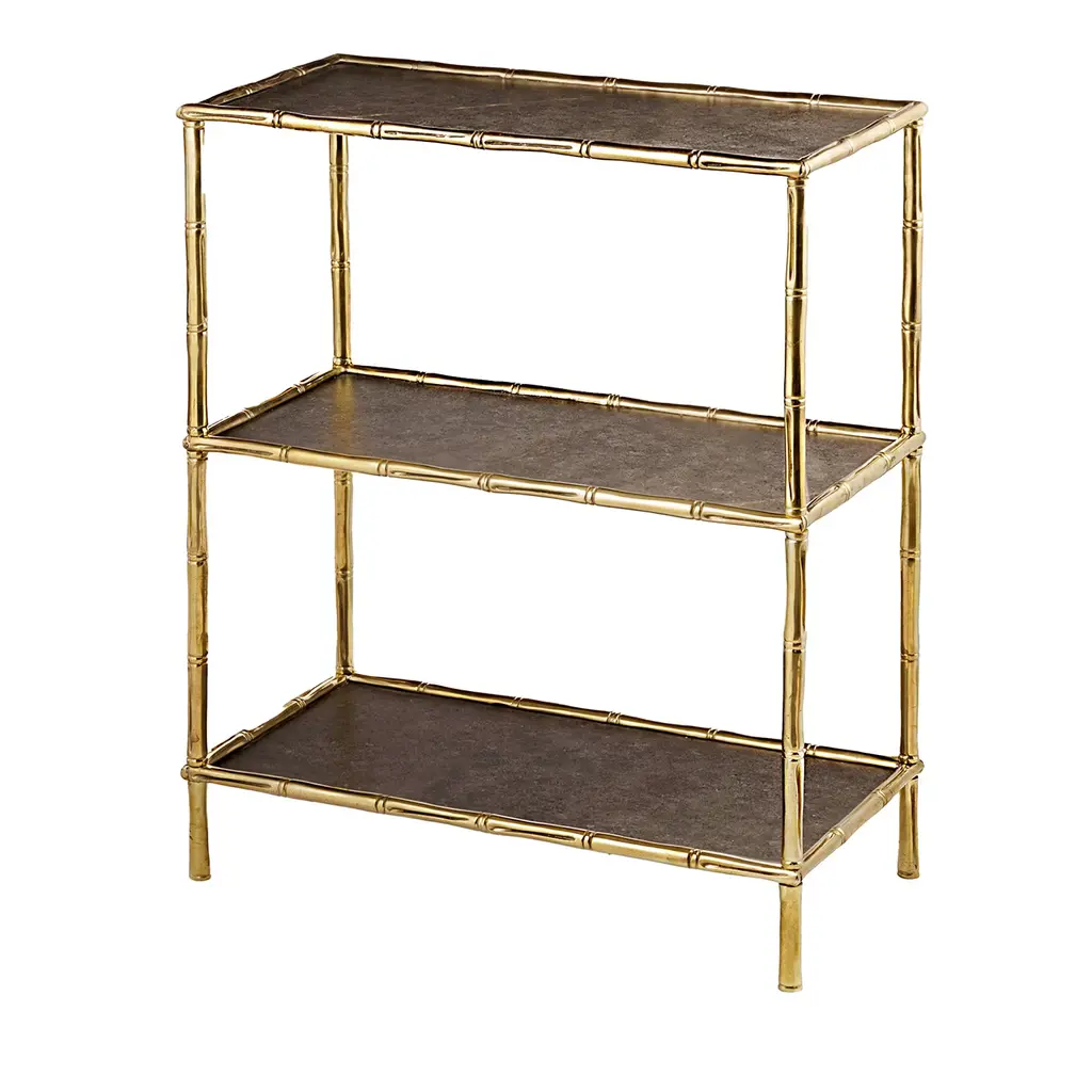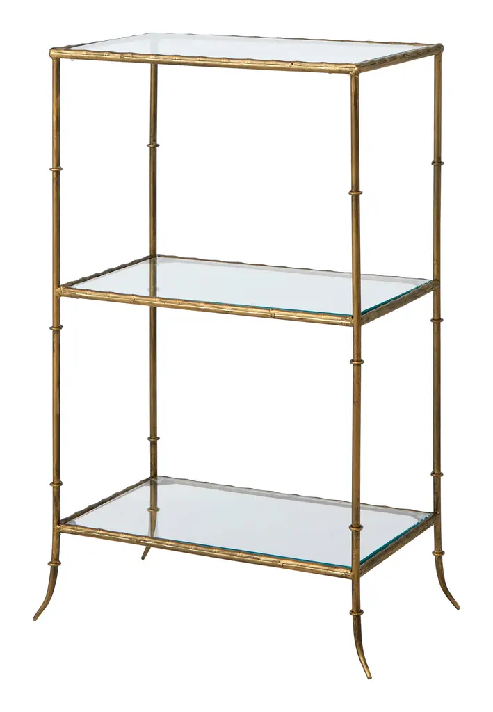 Bring vintage vibes to any room of the house with our Santiago Table. Taking its cue from classic mid-century designs, this three-tiered table pairs a trio of simple, rectangular glass shelves with a faux bamboo metal frame, which has been coated with an antiqued brass finish for a glamorous touch of shine. Perfect nestled beside a sofa or armchair in an eclectic, maximalist living room, we also love Santiago as a scaled-down console in a small yet chic foyer. •metal •antique brass finish•glass Dimensions •18.75"W x 11.25"D x 28.5"H