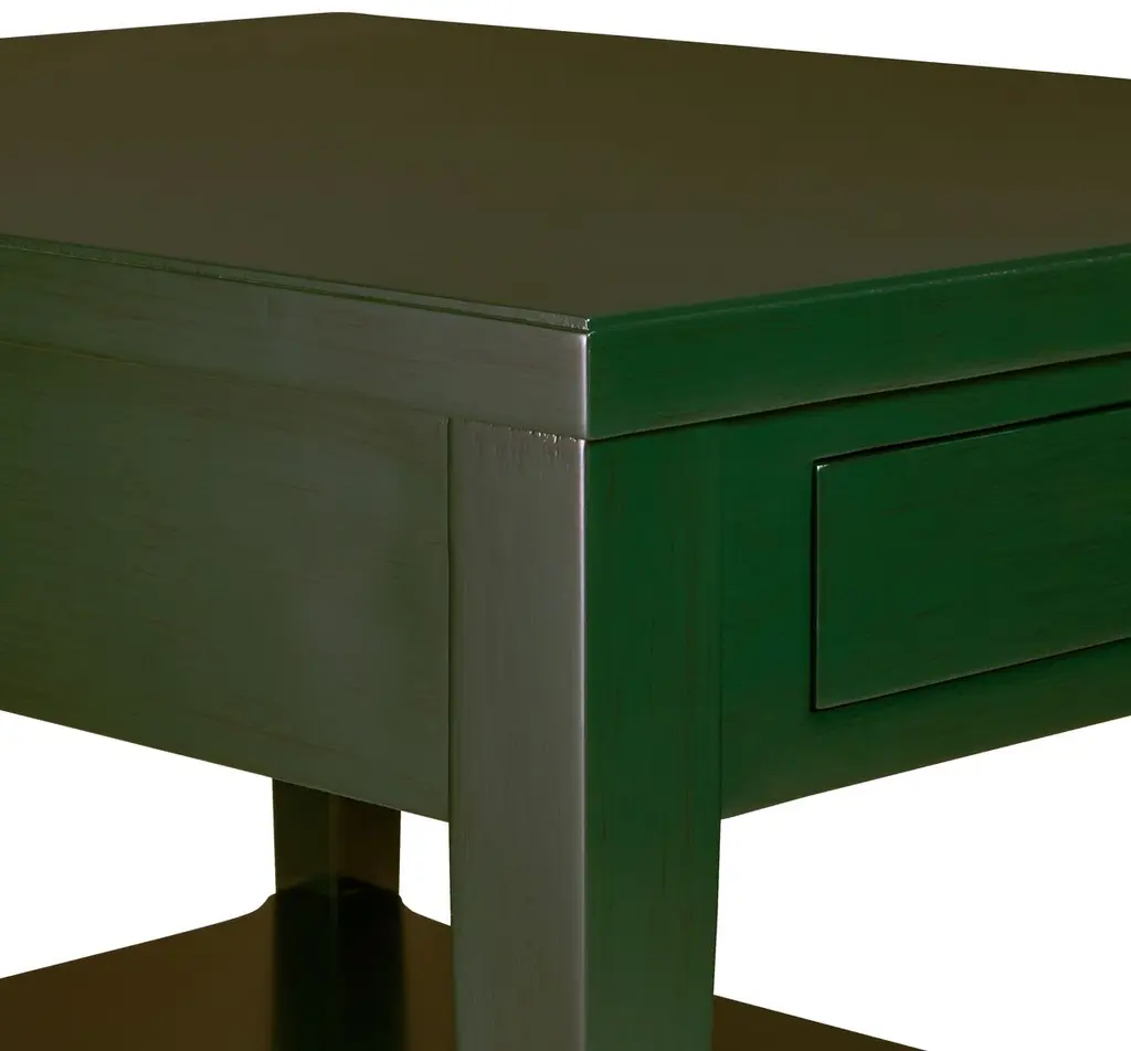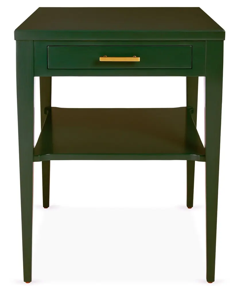 Designed by us and available only at One Kings Lane: Crafted of hardwood solids topped with our exclusive paint, this beautifully carved nightstand boasts tapered legs and a lower shelf, which offers space for storing books and magazines. A single drawer with brass hardware provides concealed storage.