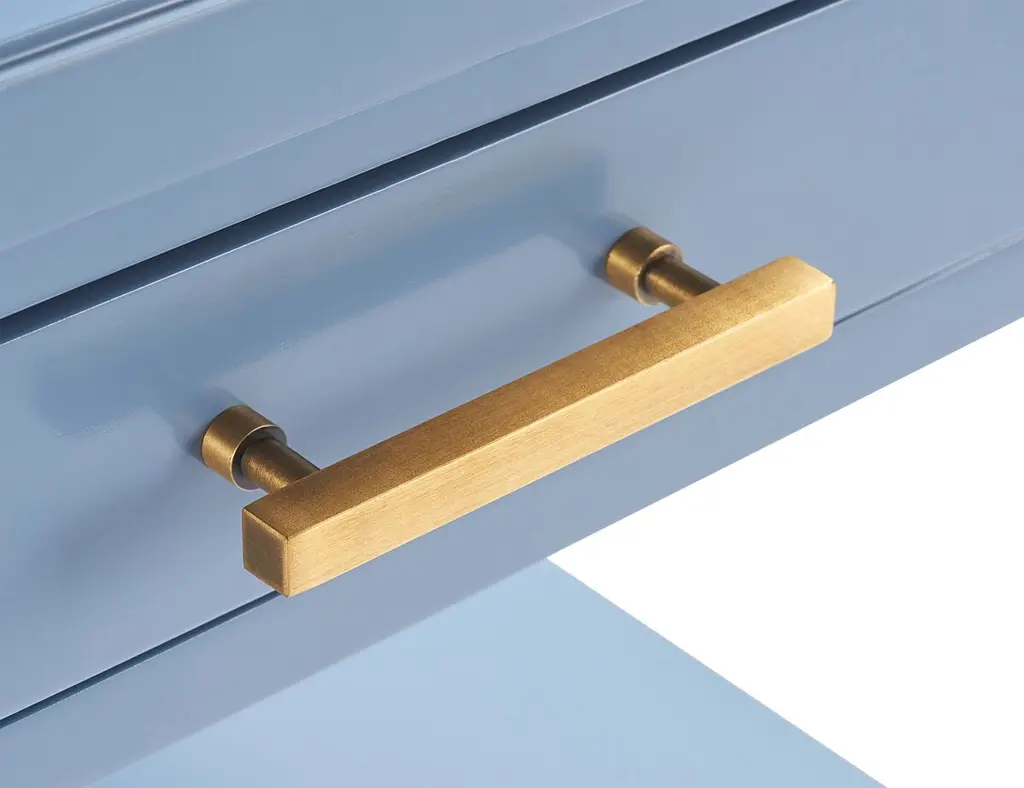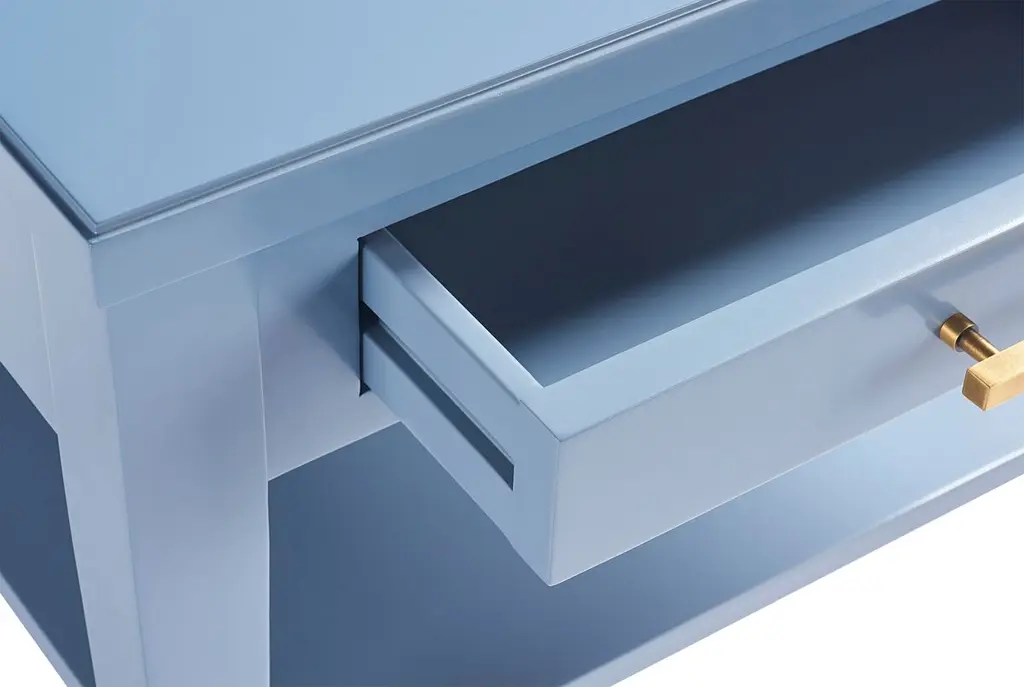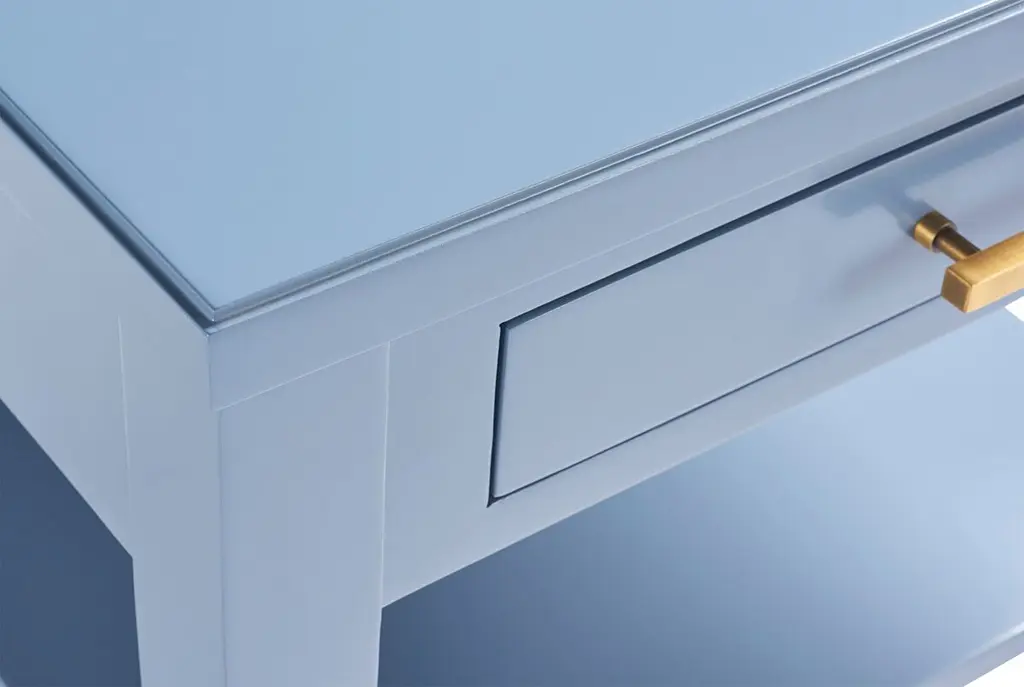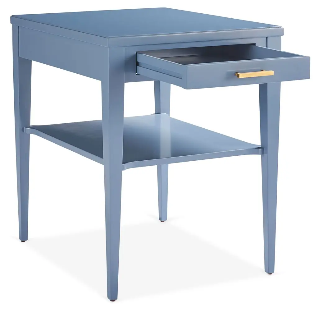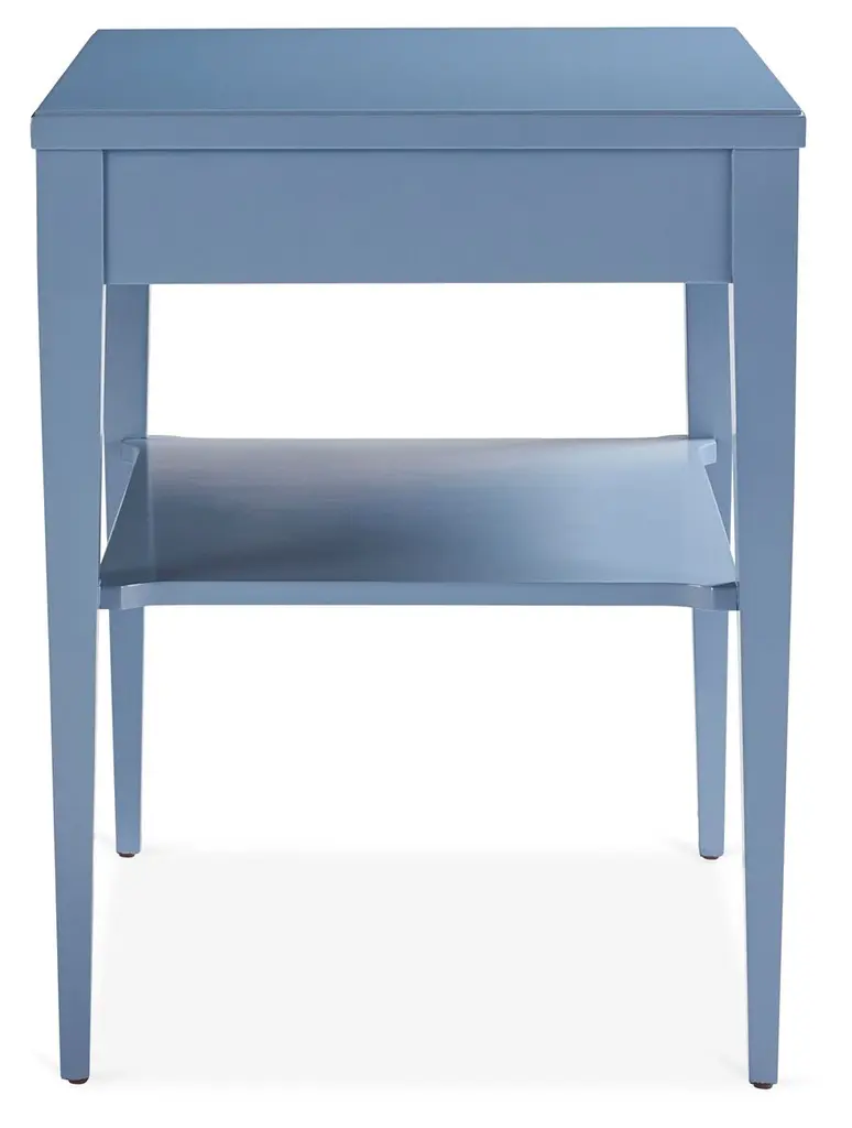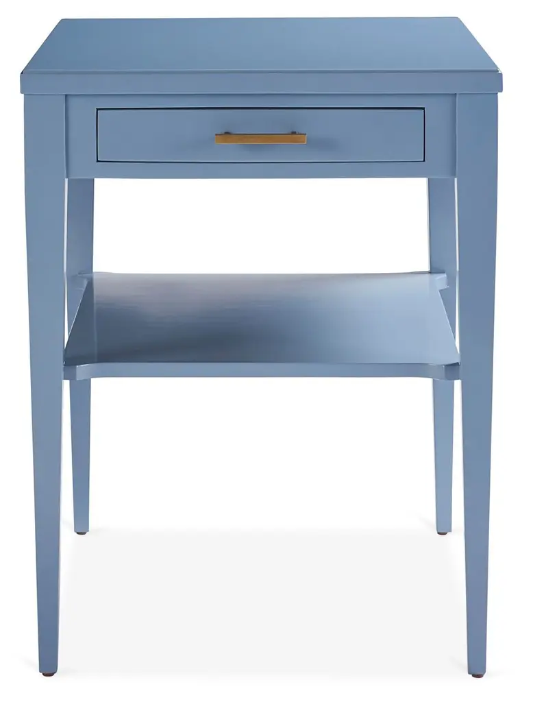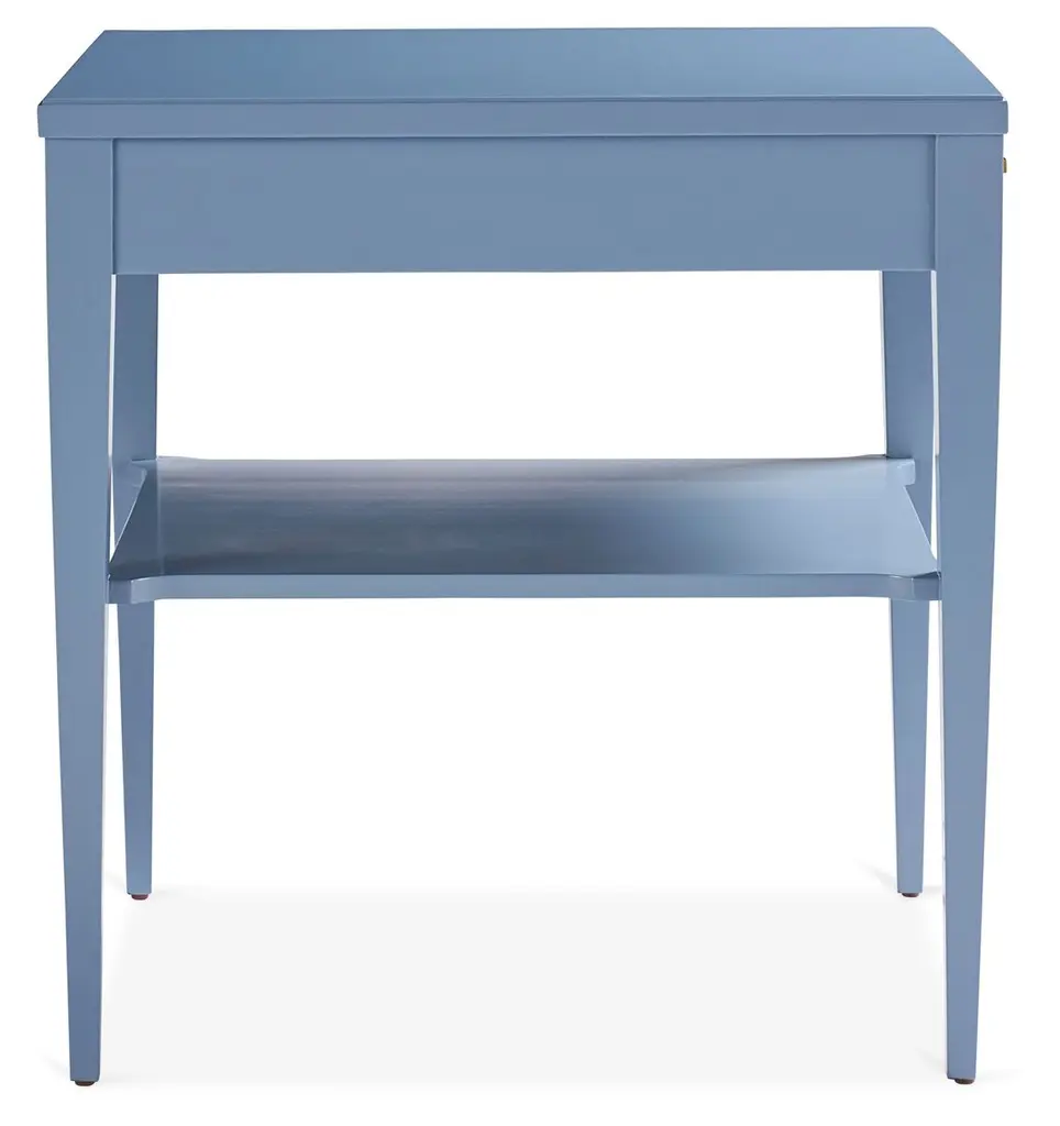Designed by us and available only at One Kings Lane: Crafted of hardwood solids topped with our exclusive paint, this beautifully carved nightstand boasts tapered legs and a lower shelf, which offers space for storing books and magazines. A single drawer with brass hardware provides concealed storage.