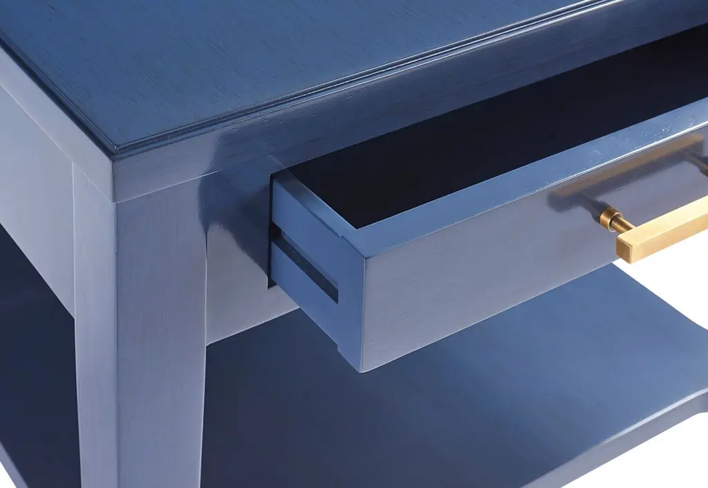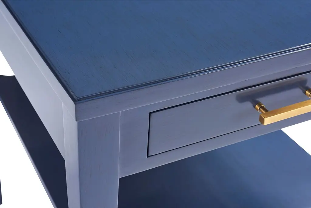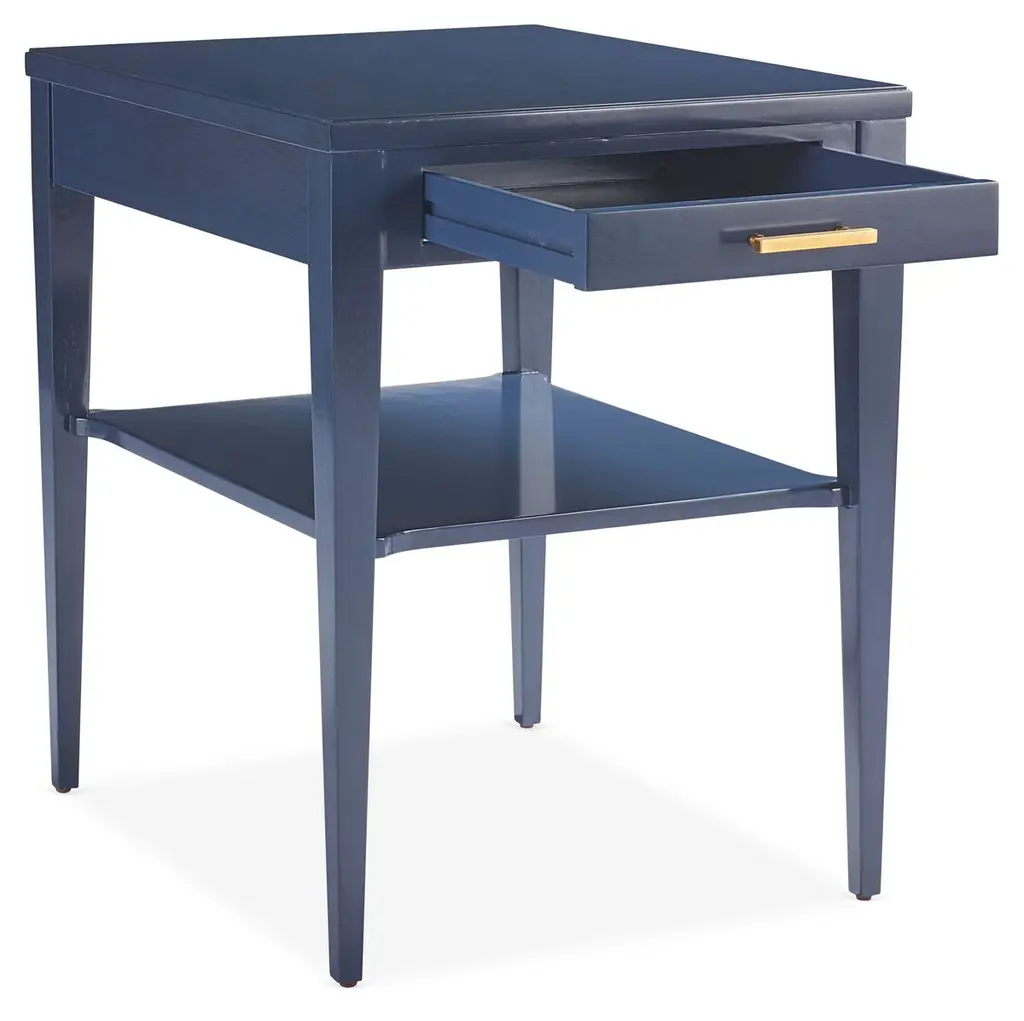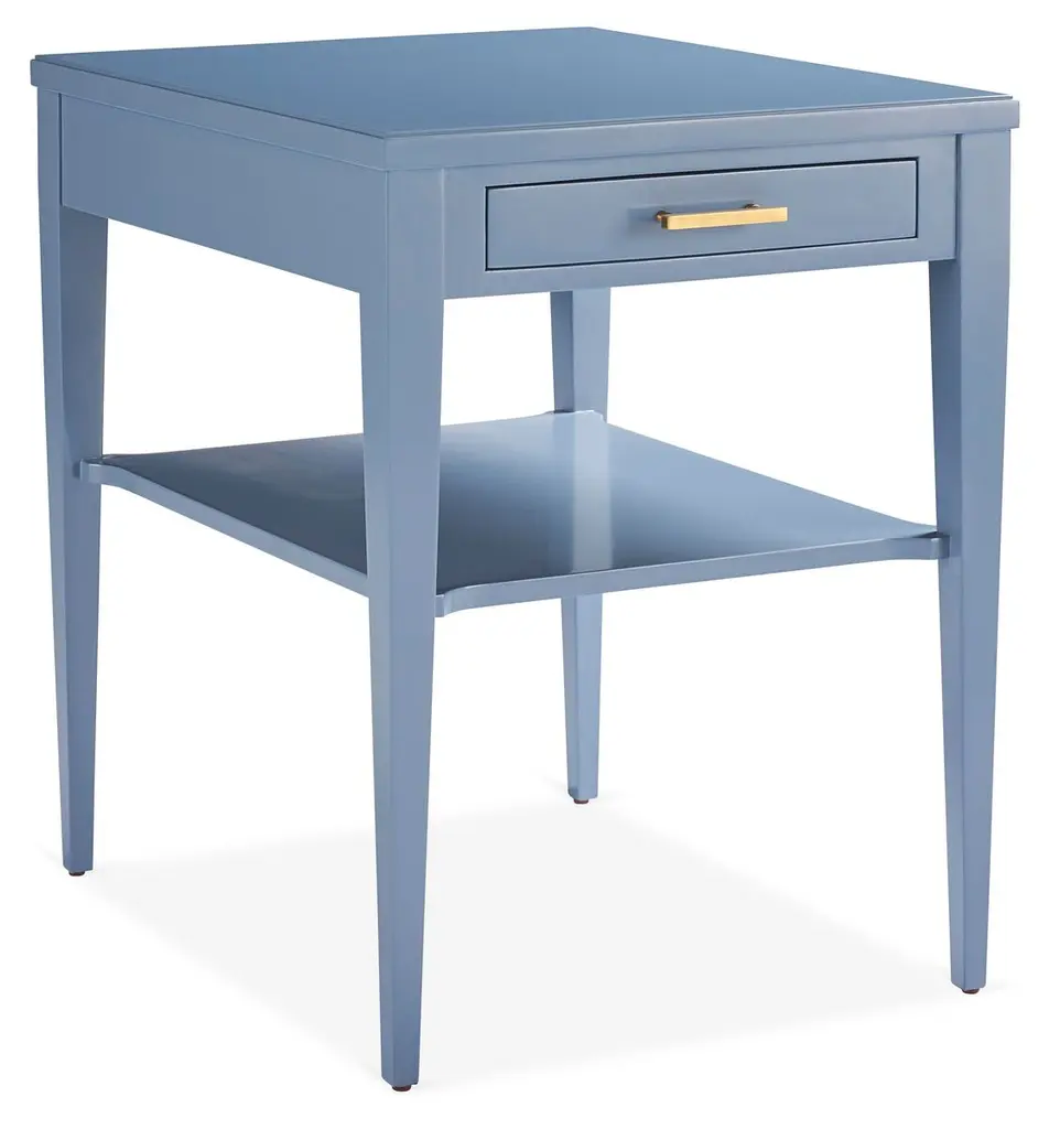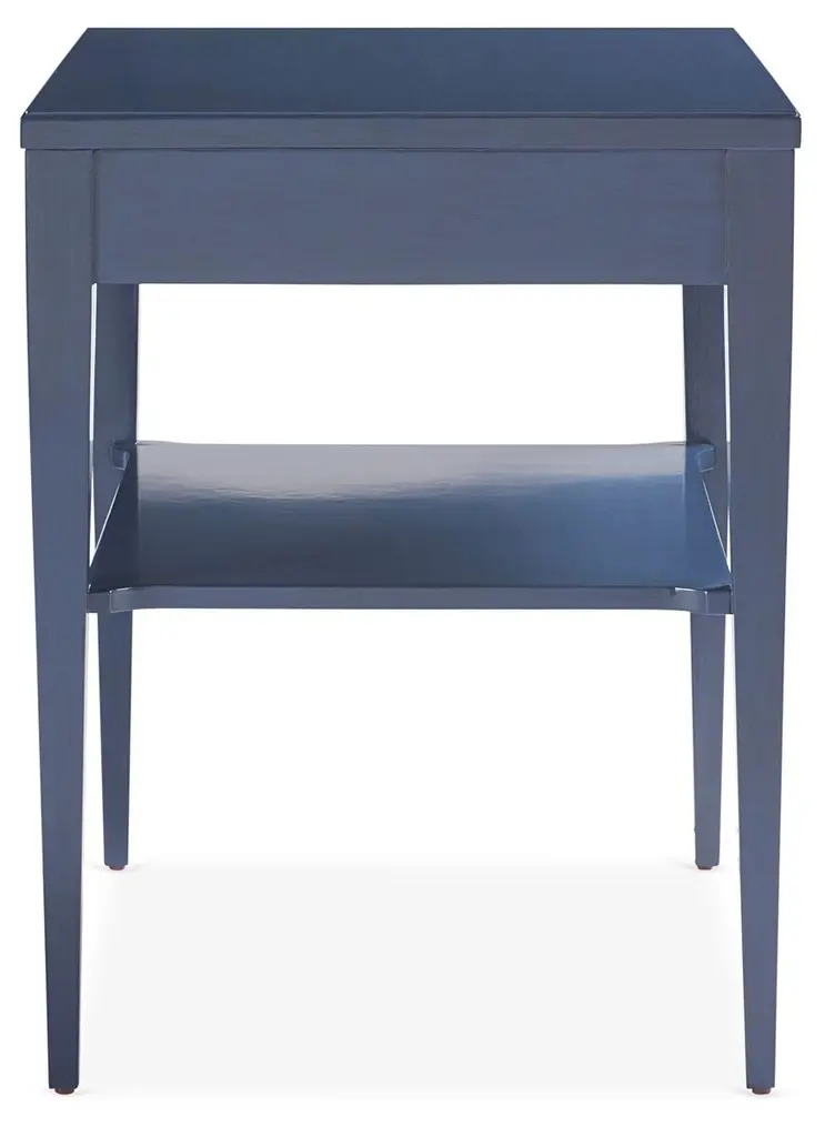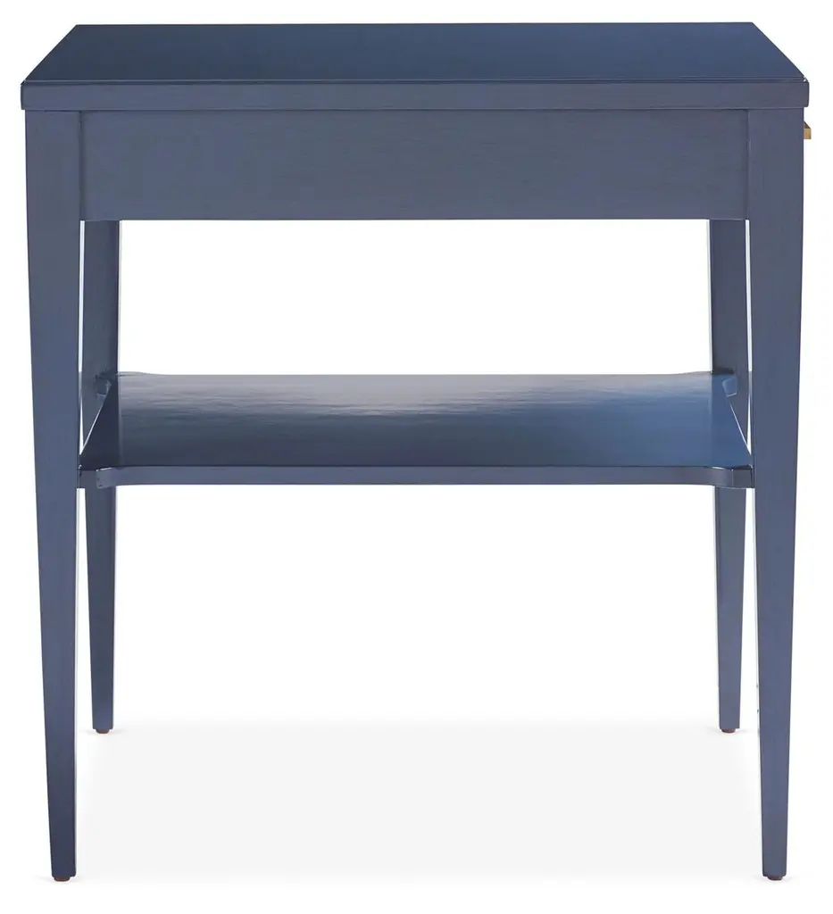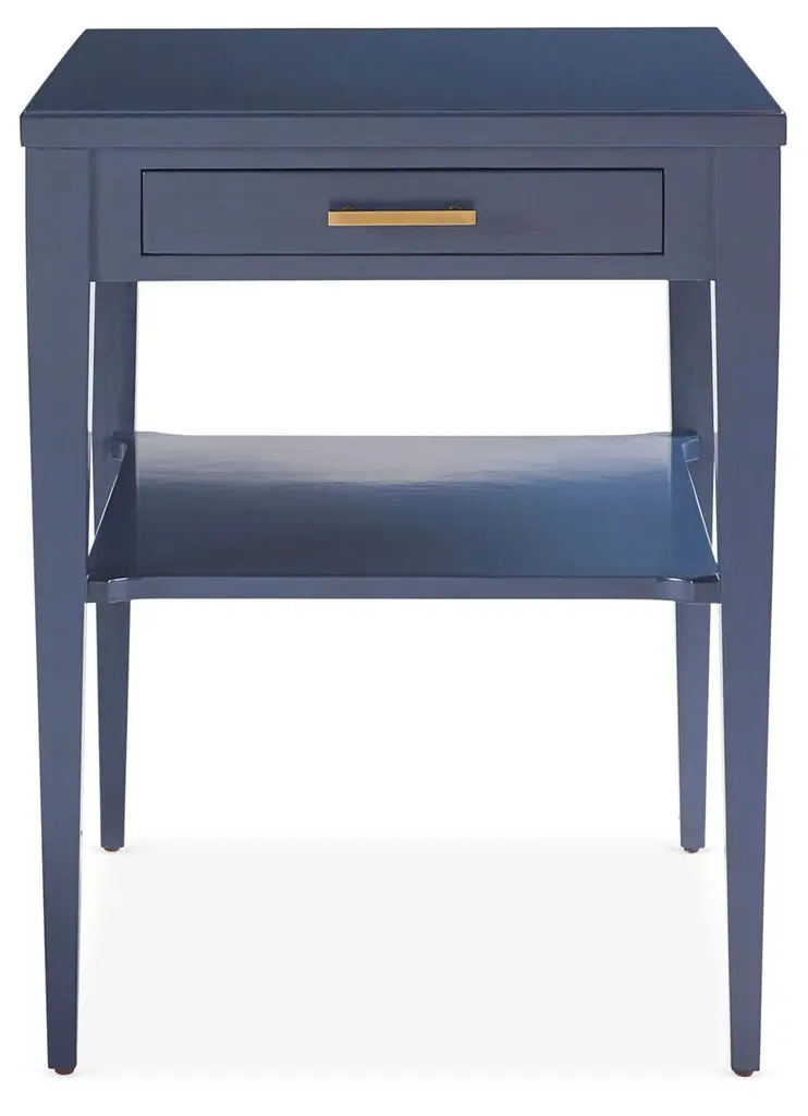 Designed by us and available only at One Kings Lane: Crafted of hardwood solids topped with our exclusive paint, this beautifully carved nightstand boasts tapered legs and a lower shelf, which offers space for storing books and magazines. A single drawer with brass hardware provides concealed storage.