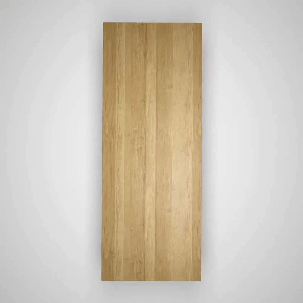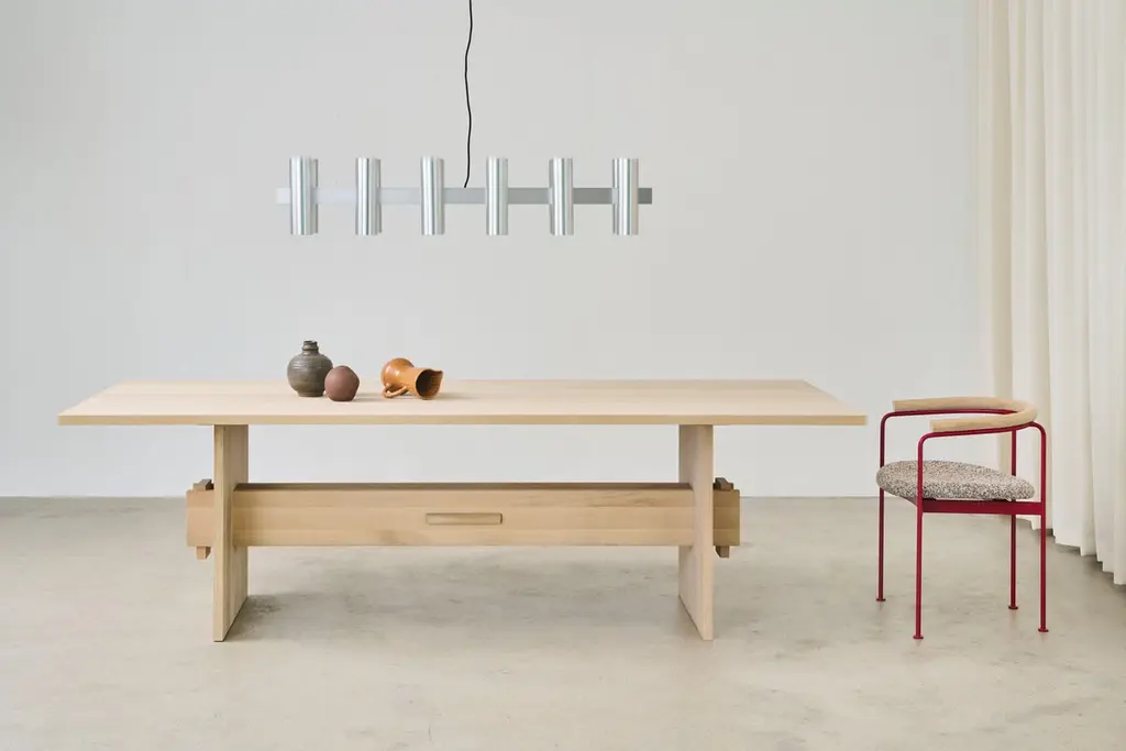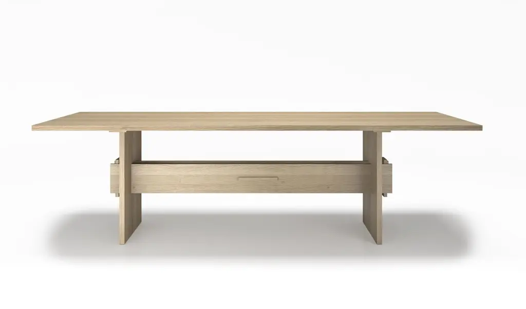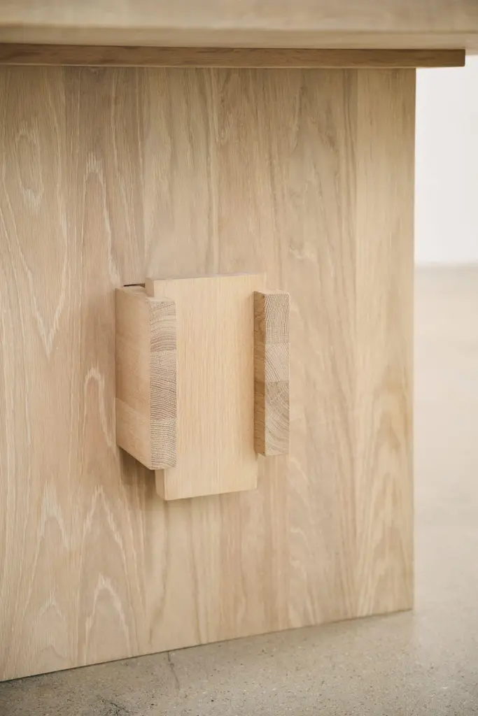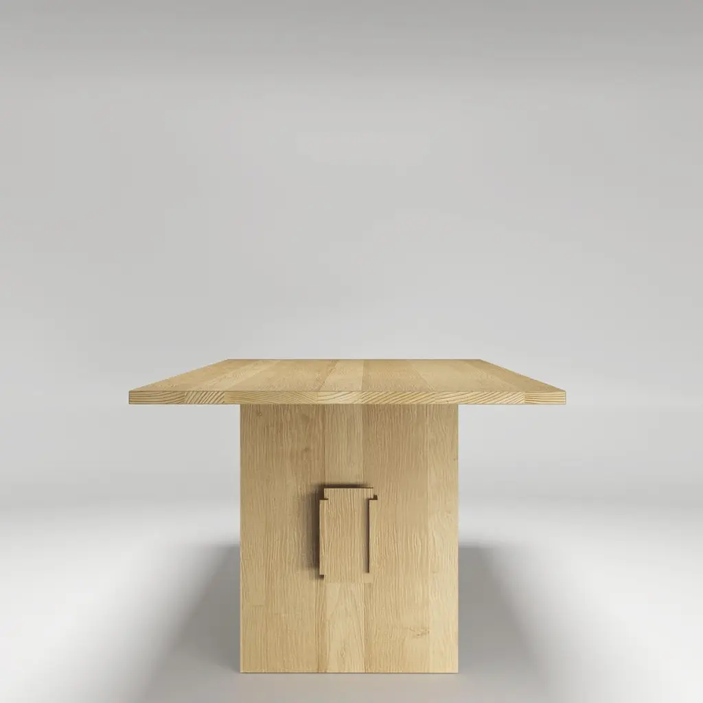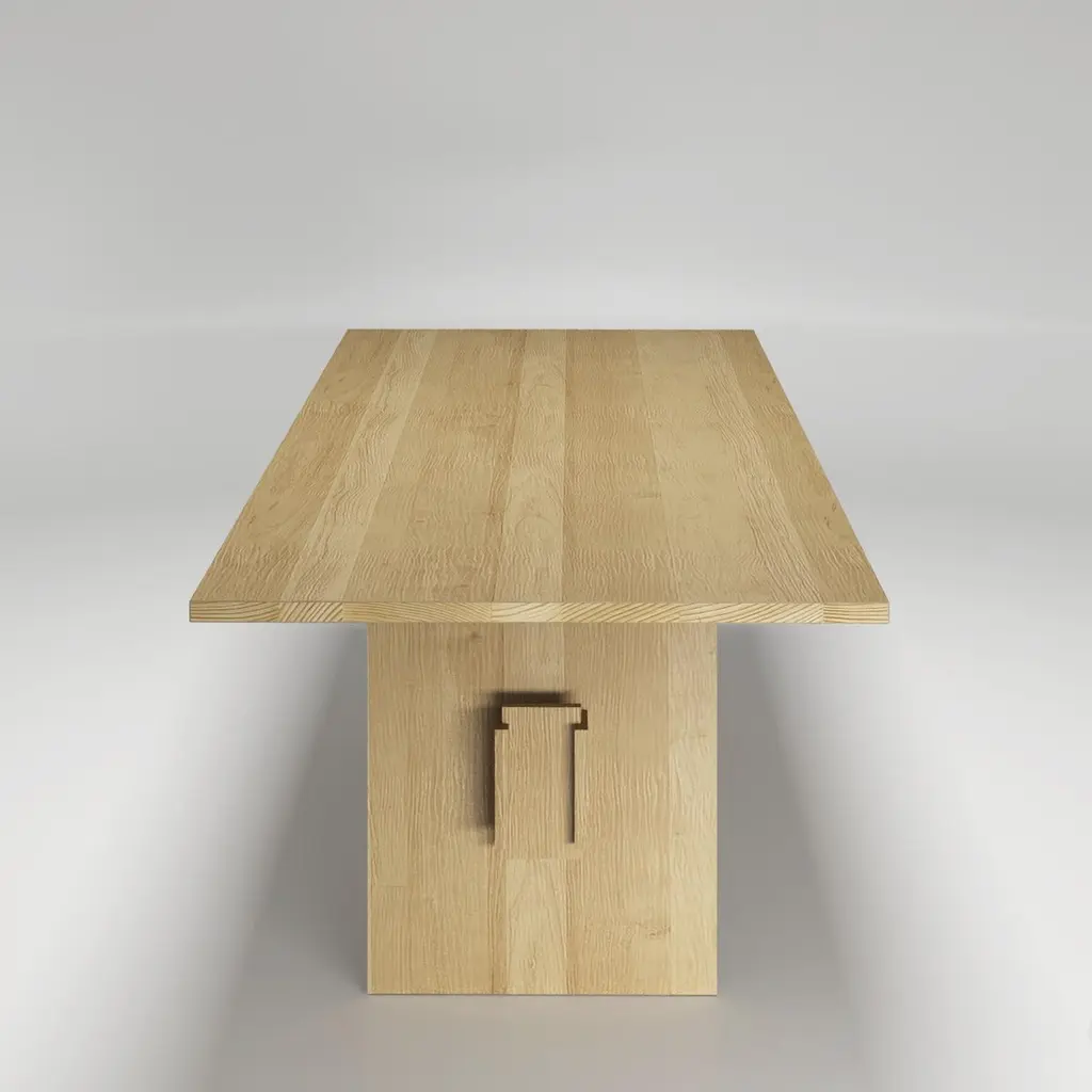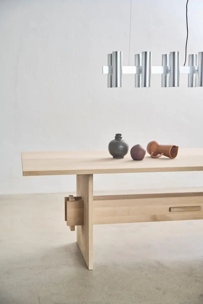 EPPE UTZON TABLE #2Design by Jeppe Utzon, 2023Sizes: 200, 240, 270, 300, 340 cm Finishes available : oak, smoked oak, walnutDimensions : H. 74 cm x W. 200 cm D. 100--------When the Danish architect and designer Jeppe Utzon drew the first lines for the JEPPE UTZON TABLE #2, his aim was to create a solid wood table combining simple design and optimal utilization of the wood. The design idea emerges from two basic principles. First, the table should be cut out of one single piece of wood to minimize waste in production and to achieve the smallest possible package size for transport and storage. Second, you should be able to intuitively assemble and disassemble the table without any use of tools and screws.Based on these two main principles, Jeppe Utzon has created a table, where the natural structure of the wood is beautifully united with the unique carpentry joints. An example is the use of wooden wedges in the leg construction. Apart from ensuring a stable construction, the wedges also take centre stage in the visual design of the table, instead of being hidden away. To ensure stability, the table legs are secured to the tabletop by screws, but otherwise the table has been made without any use of metal and screws. So, with the wood as almost only material, the table has its very own identity, defined by a pure and simple expression.