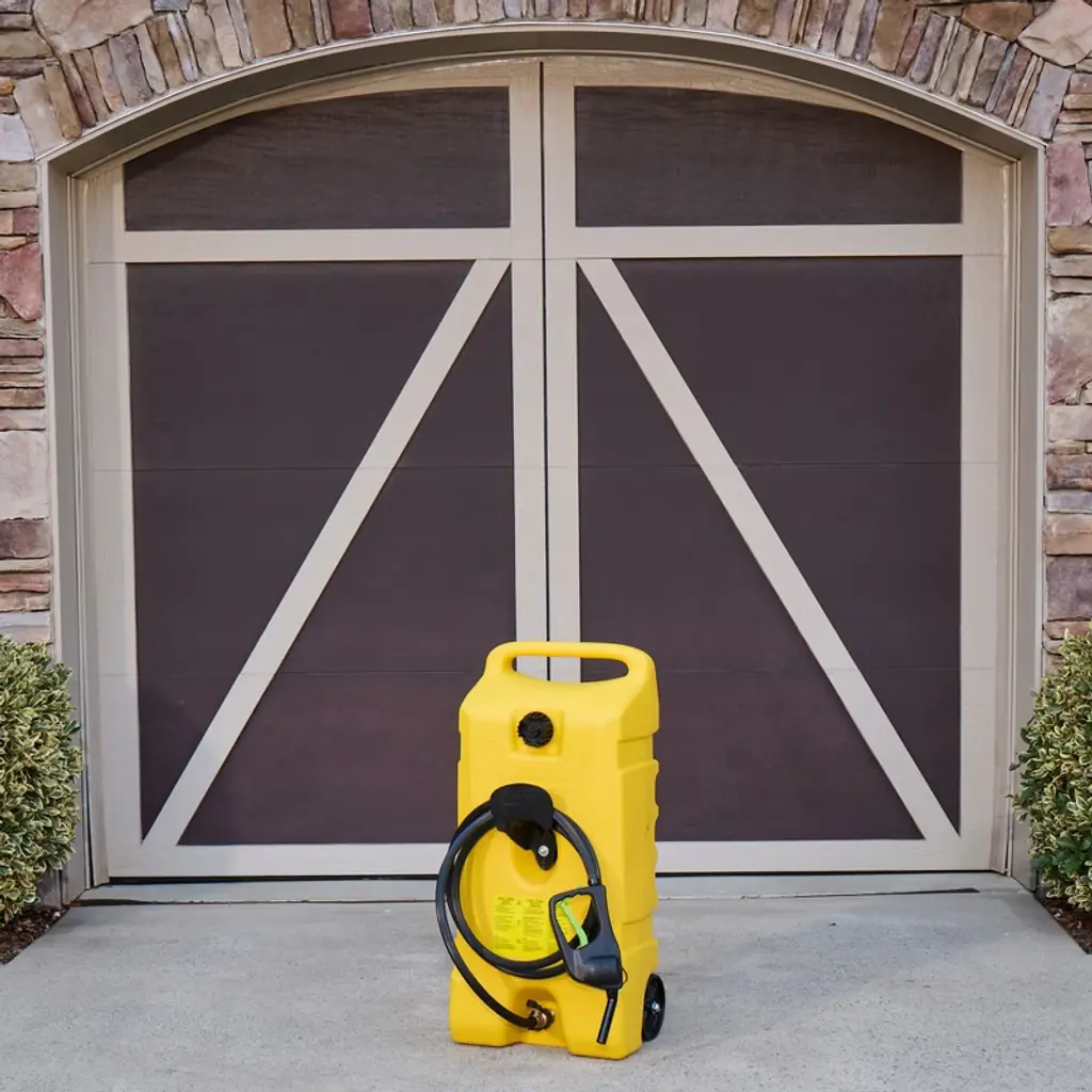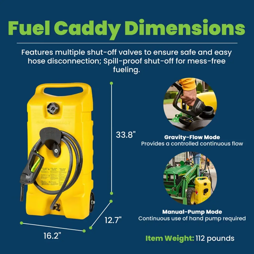 When you've got to take a long walk to refill your gas tank, you ought to have a gas can that can move with you. The Scepter Flo N' Go DuraMax 14-Gallon Portable Diesel Tank with Pump is an ideal solution for farm, rural, and marine use thanks to its sturdy wheels, tall body, and handle. With 6-inch wheels, this diesel tank can travel over rough terrain without the need to carry it the whole time. The 14-gallon capacity minimizes the number of trips you'll have to take between your garage and your thirsty engines. This container comes with a 10-foot fuel hose with a gas pump handle you can stop and start as needed. There is a shut-off valve at the tank and hose to eliminate spills at disconnect. Since the fuel container meets the Department of Transportation and UN transportation requirements, you can expect its heavy-duty polyethylene materials to hold up to long-term use with minimal spilling. Filled with fuel, the Duramax gas can weighs roughly 112 pounds and requires 2 adults to lift the caddy. No more spilling fuel or overfilling tanks when you carry fuel with the Flo N' Go Duramax Diesel Caddy.