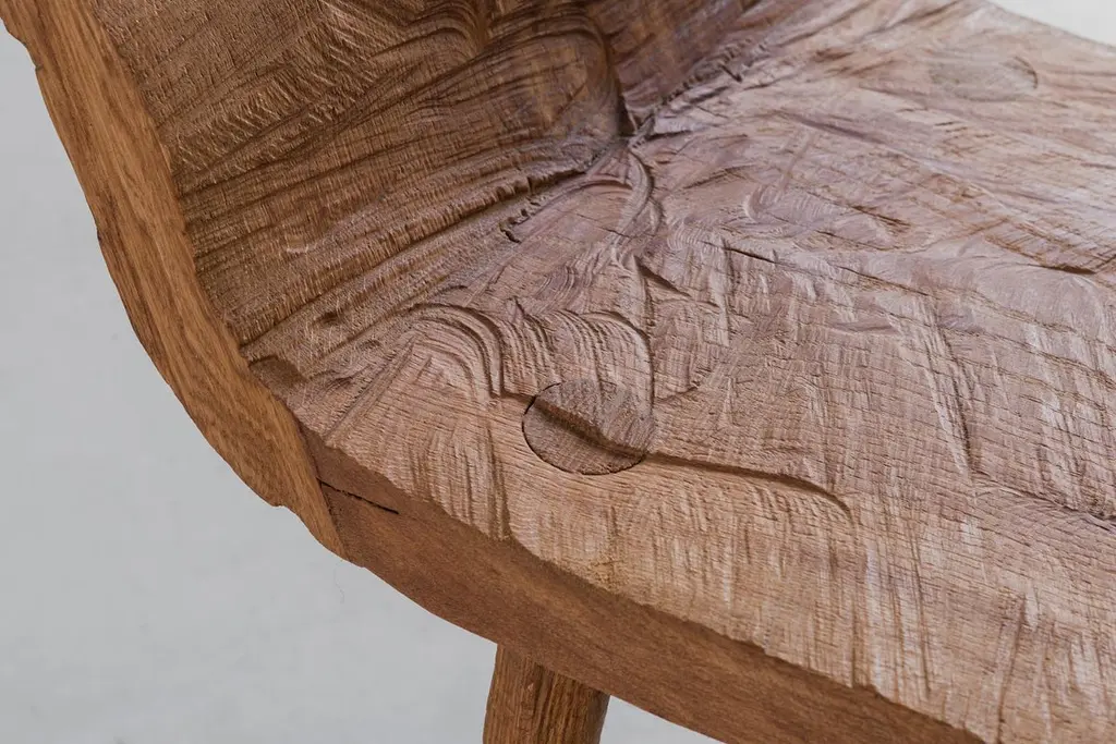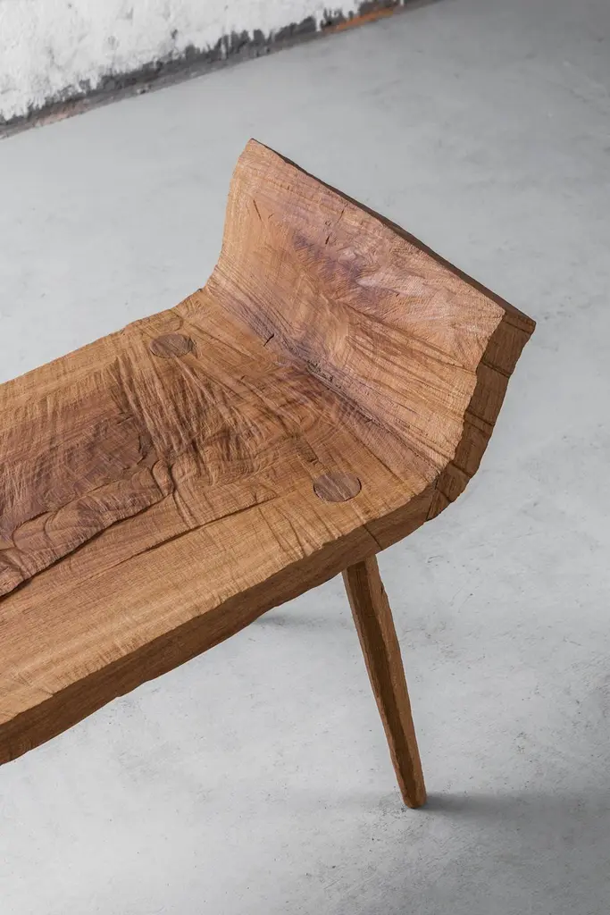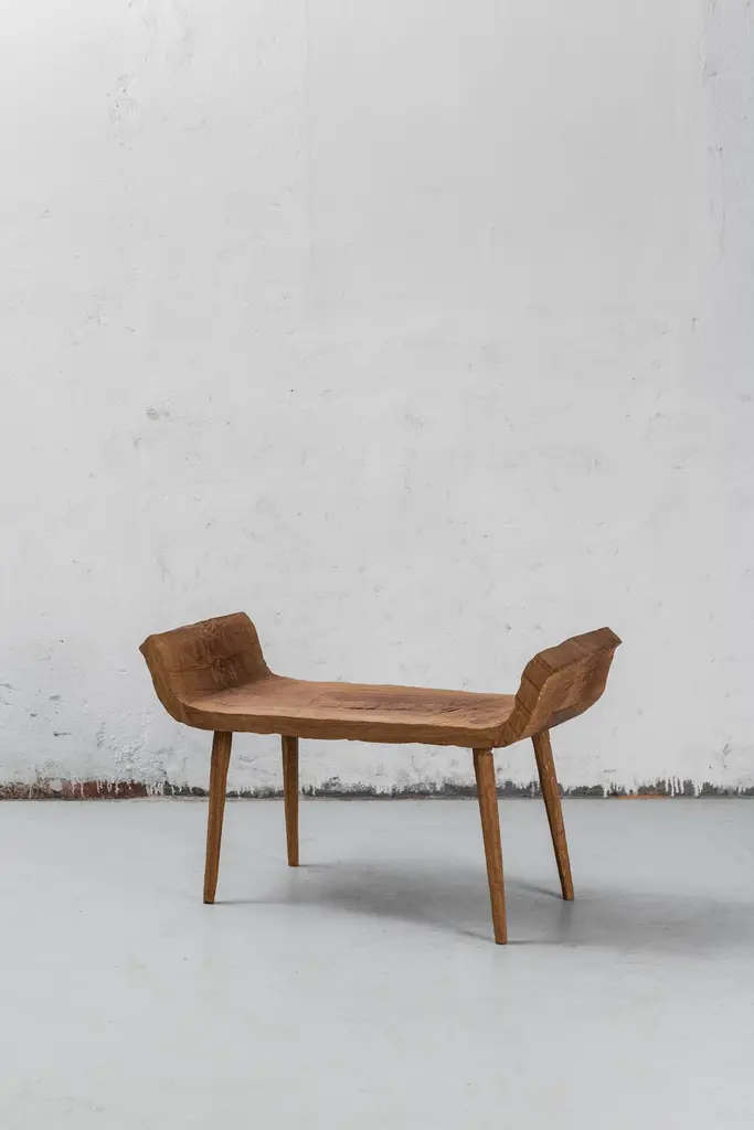 Bench or side table in solid oak (+ linseed oil)(Outdoor use OK)SÓHA design studio conceives and produces furniture design and decorative objects in solid oak in an authentic style. Inspiration to create all these items comes from the Russian North aesthetics with its severe nature, log huts black from time and climate and scant patterns. Wood is masterfully hand processed with chainsaw or chisel, whereby producing beautiful surface patterns. The wood is soaked in boiling baths of linseed oil, creating this special patina and making each creation a very unique piece. Reacting with tanning substances under high temperature, oil gives the objects expressive and natural colours, from light brown to charcoal-black. SÓHA offers a vast array of neo-primitivist interior objects. Our kitchen utensil, wall panels, sculptures and furniture solutions are executed in one unique style and will organically fit into the interior of your home. Each piece is one-of-a-kind handmade product.Unique piece made to order.